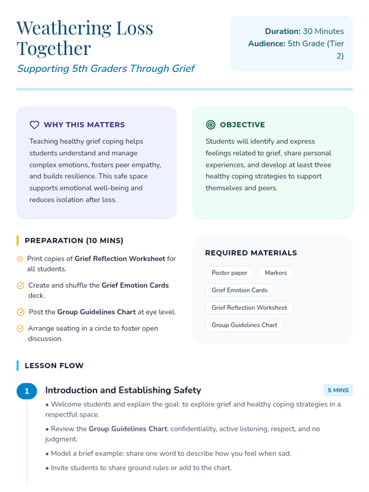 A 30-minute Tier 2 group session for 5th graders to explore grief, identify emotions, and develop healthy coping strategies in a supportive environment.