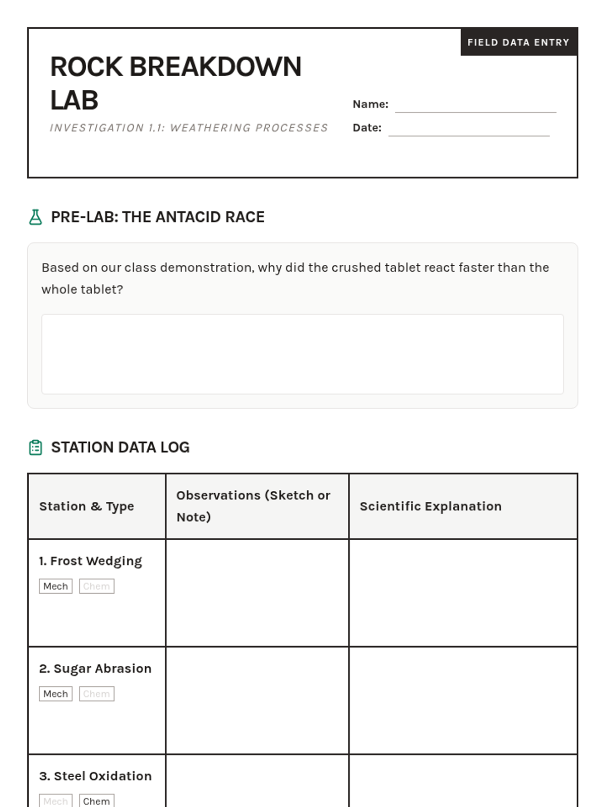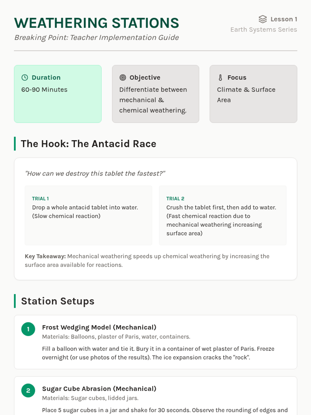 Students explore the breakdown of rock through stations demonstrating frost wedging, abrasion, oxidation, and acid rain effects. They predict which climates favor specific weathering types based on temperature and moisture.