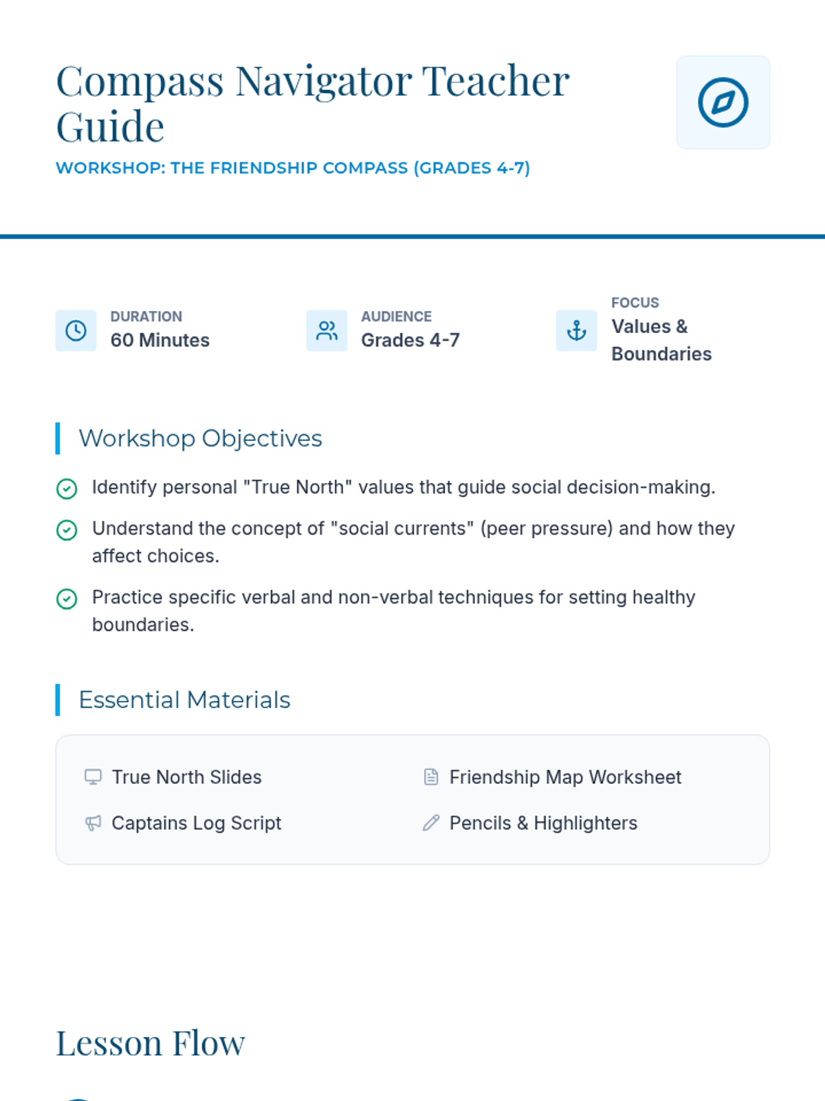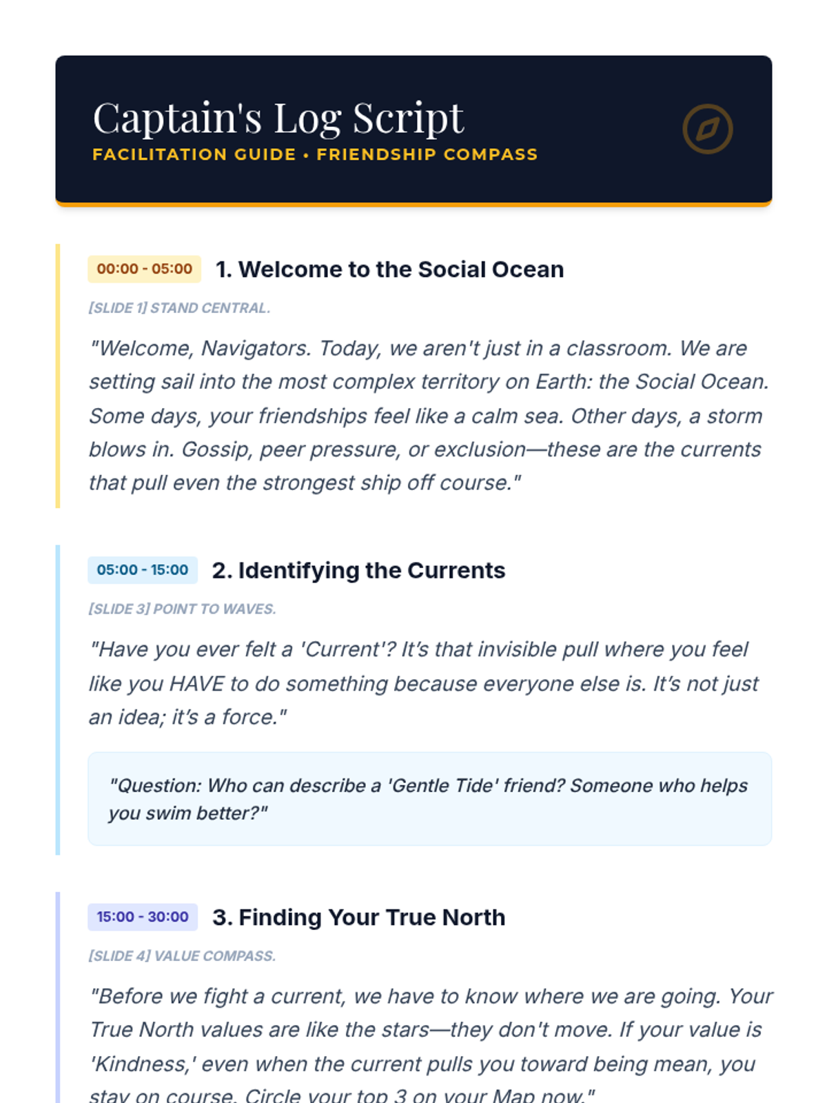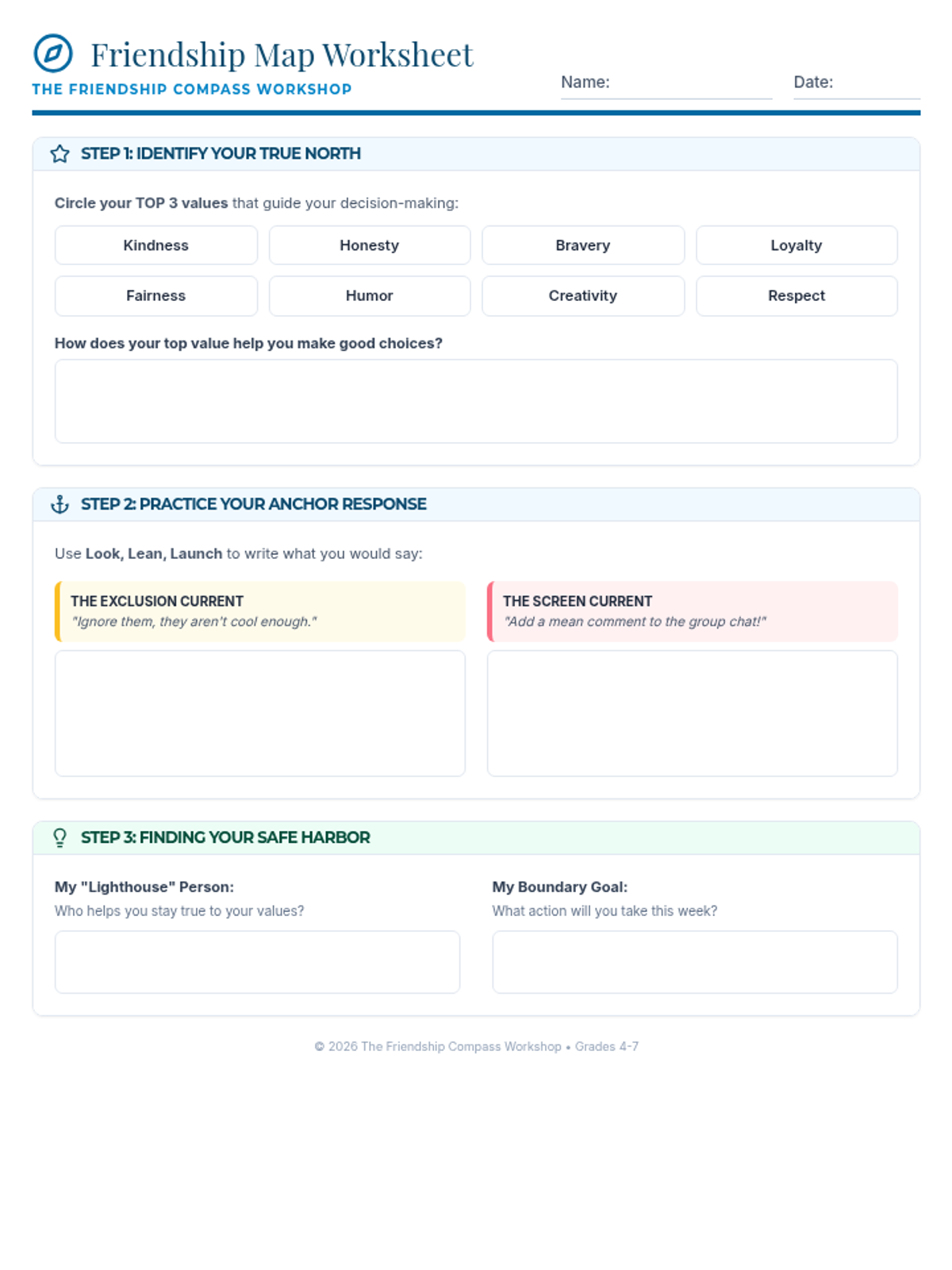 A workshop for grades 4-7 that uses a nautical metaphor to help students identify their core values ('True North') and navigate peer pressure through boundary-setting and interactive scenarios.