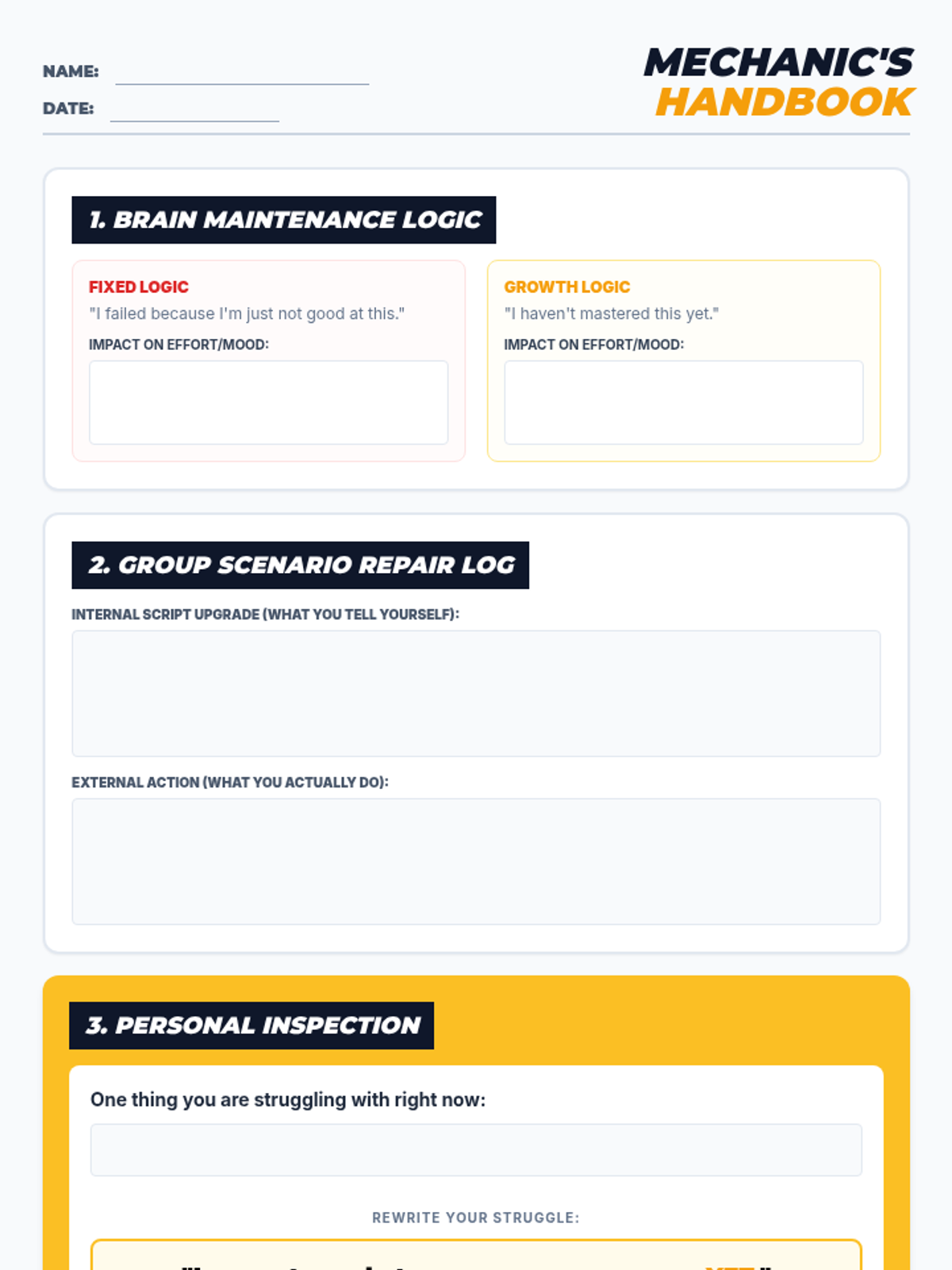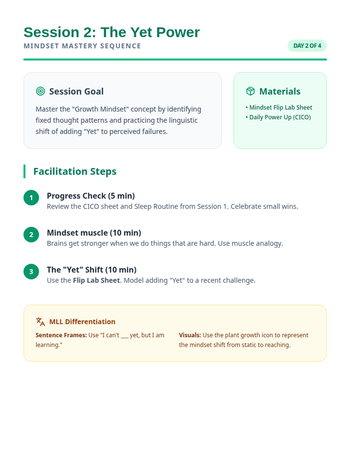 A session focused on mastering the Growth Mindset by identifying fixed thoughts and using the 'Power of Yet' to reframe challenges into opportunities for growth.