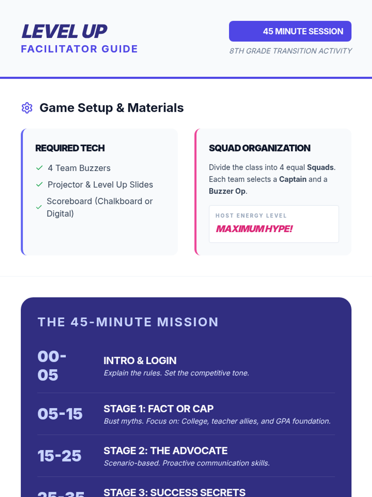 An energetic, 45-minute gaming-themed transition game show designed to help 8th graders level up for high school by tackling myths, self-advocacy, and success strategies.