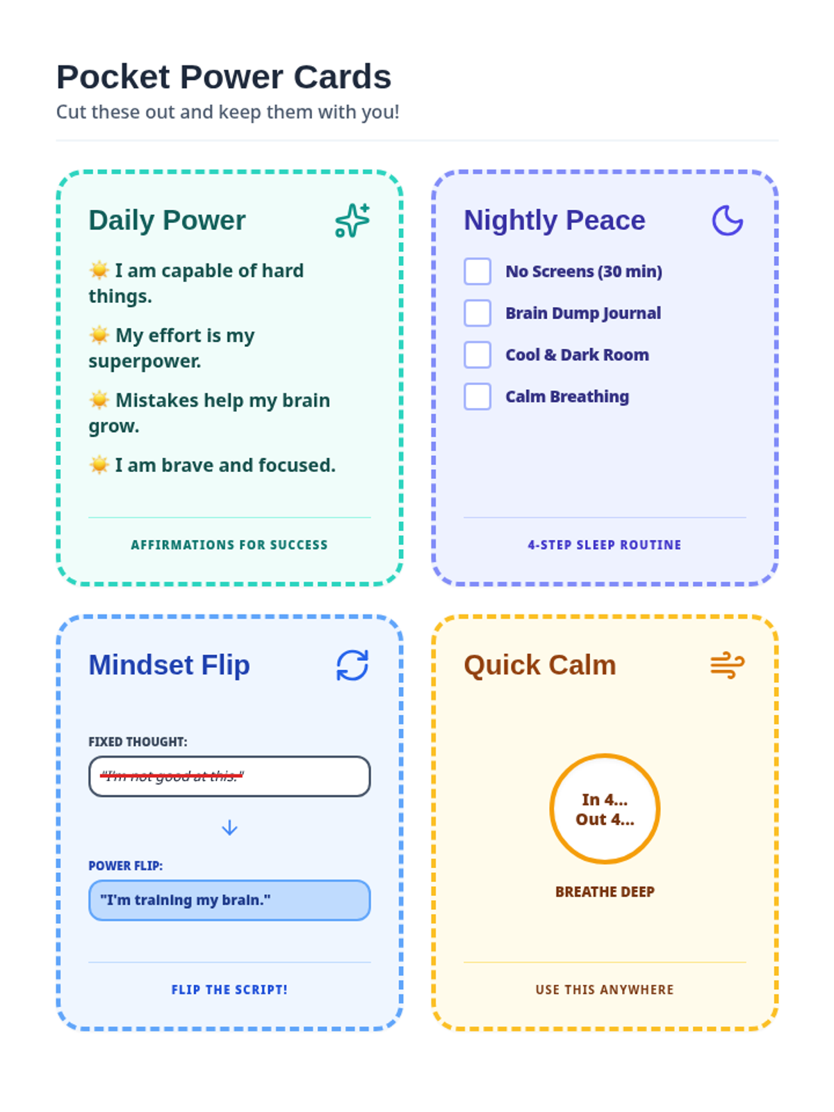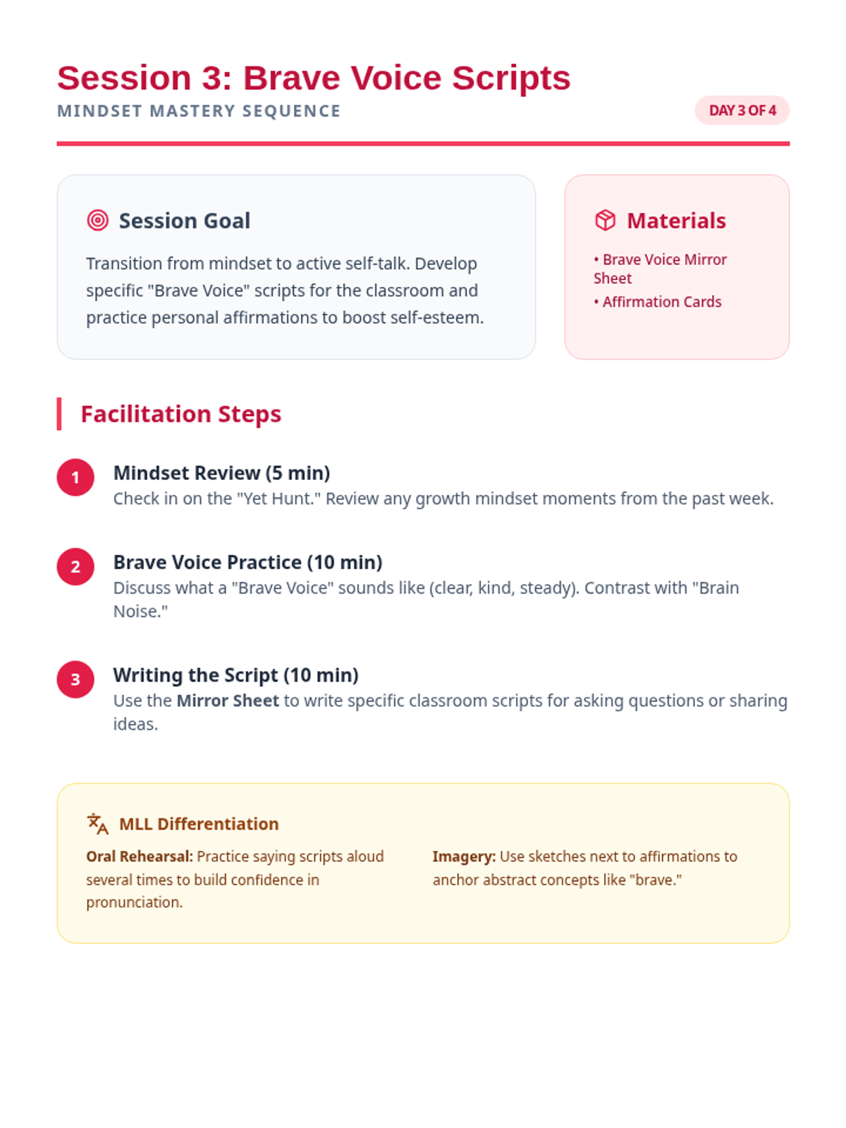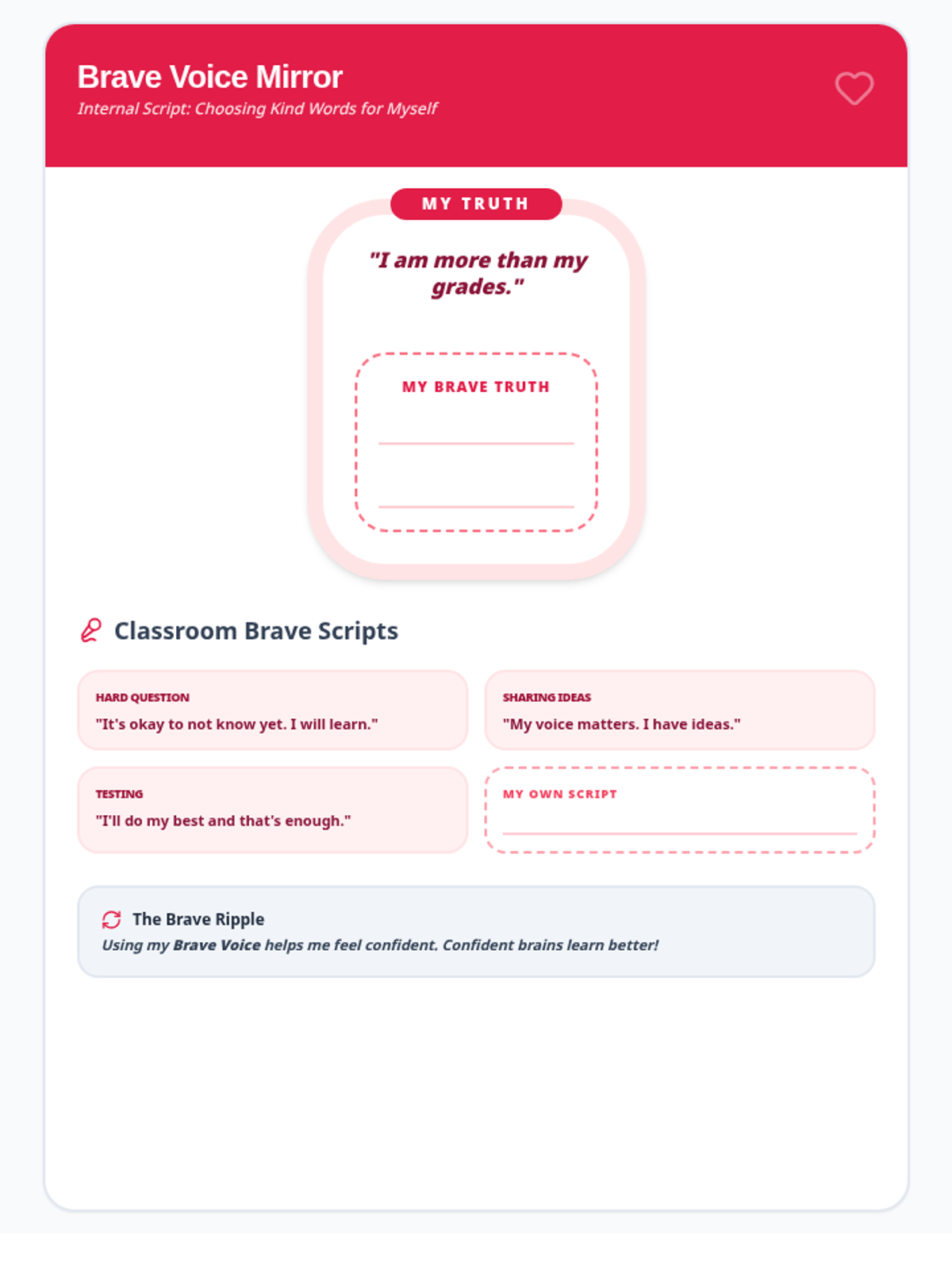 This session focuses on internalizing positive self-talk and affirmations, helping the student build a 'Brave Voice' for classroom participation and self-confidence.