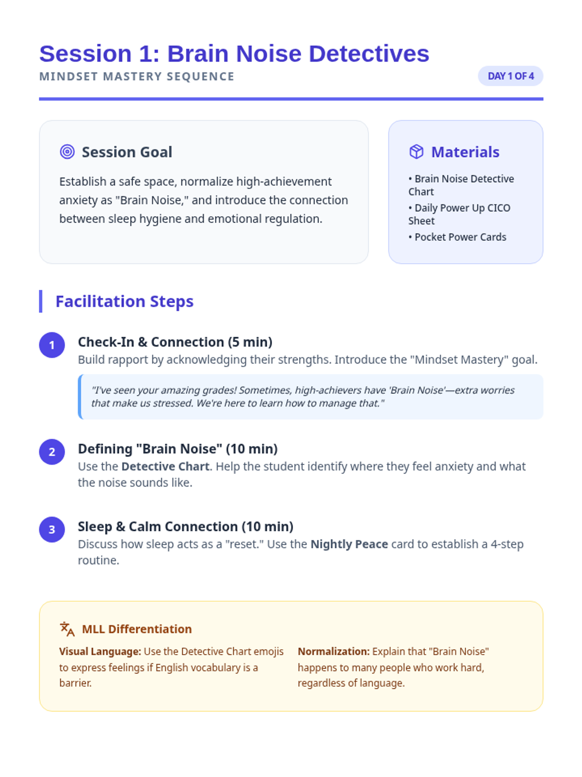 The first session focuses on defining anxiety as 'Brain Noise,' normalizing the experiences of high-achievers, and setting up the Nightly Peace Routine for better sleep.
