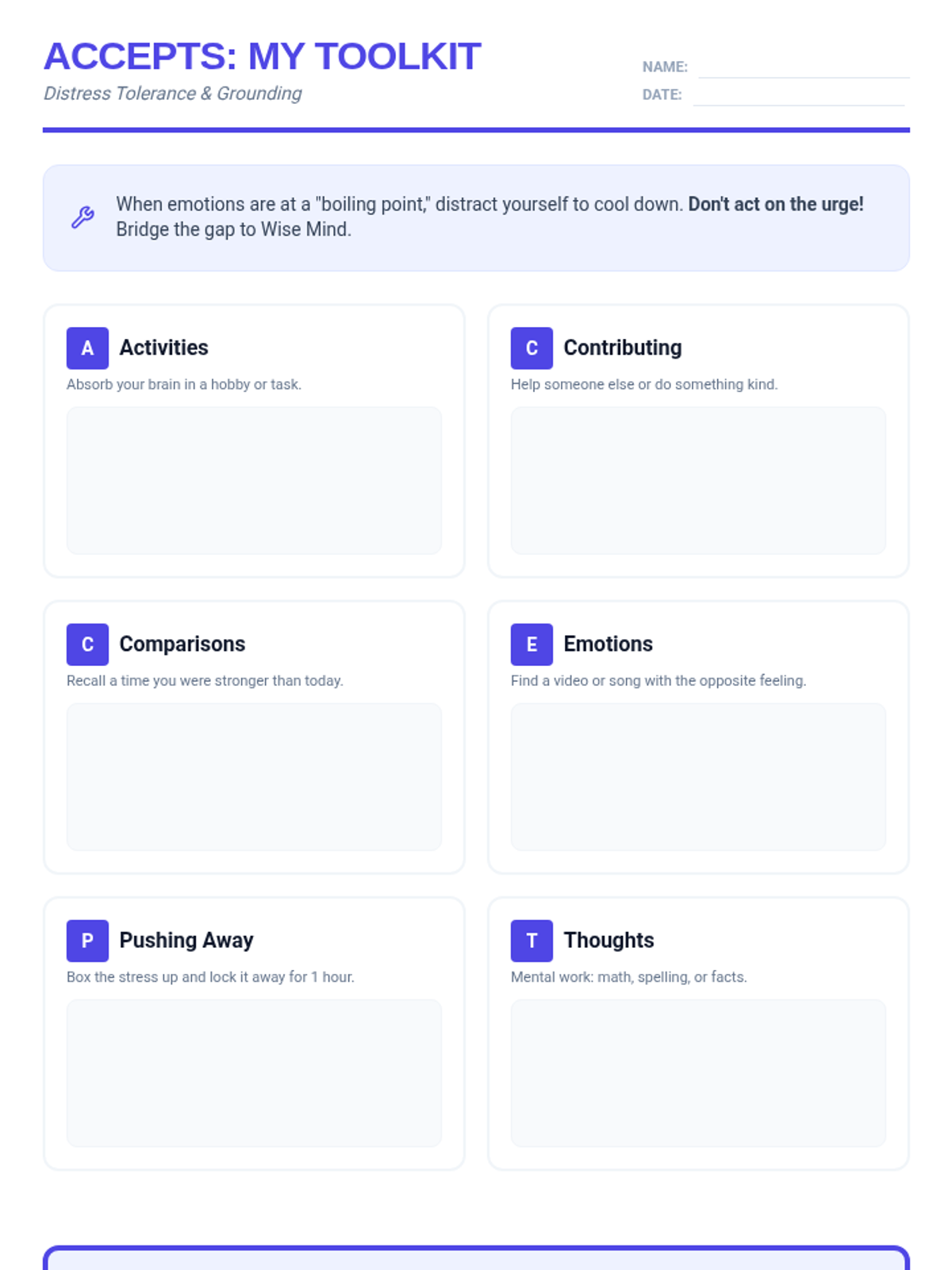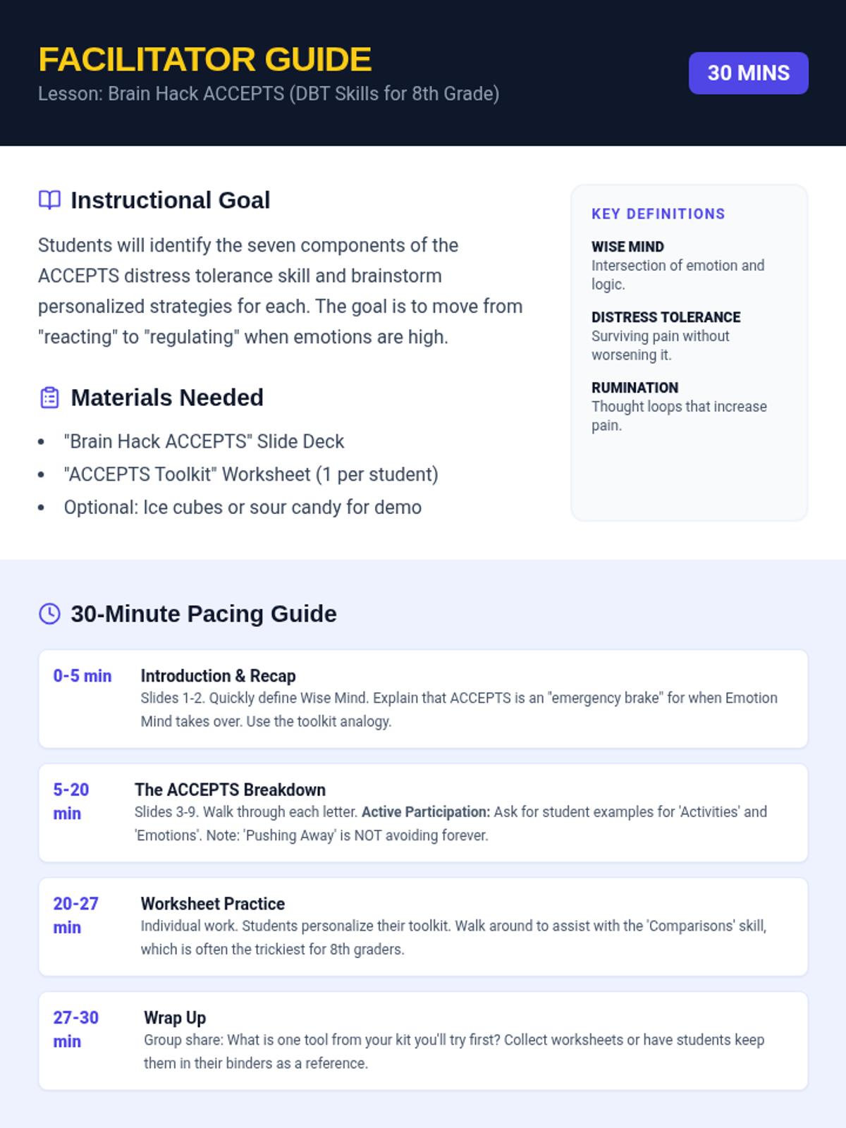 A 30-minute introductory lesson on the DBT 'Wise Mind ACCEPTS' skill, focusing on distress tolerance techniques for 8th grade students.
