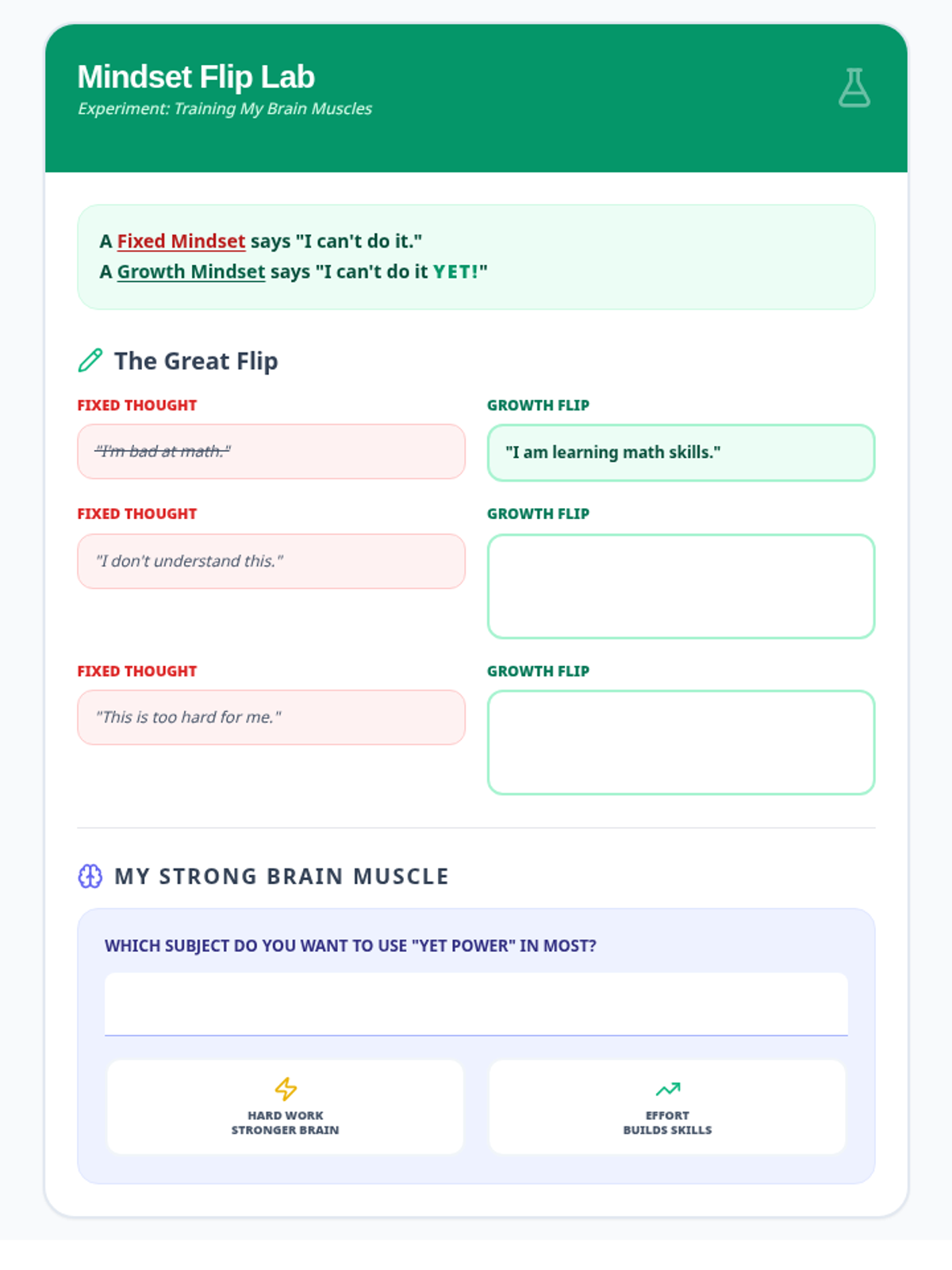 A comprehensive SEL lesson focused on building confidence through growth mindset, identifying personal strengths, reframing mistakes, and practicing positive self-talk. Students act as 'Mindset Mechanics' to tune up their internal dialogue and build a resilient self-image.