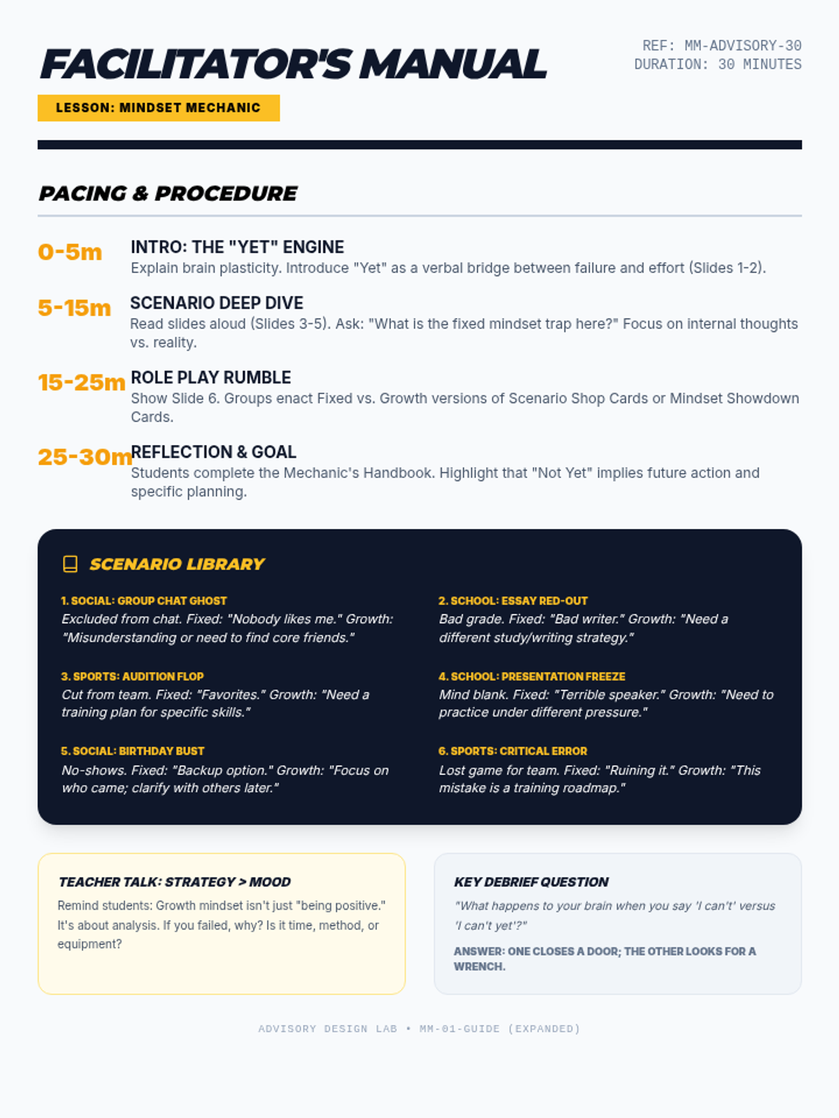 A 30-minute interactive advisory lesson for middle schoolers to build a growth mindset through scenarios involving social rejection, academic struggles, and athletic setbacks.