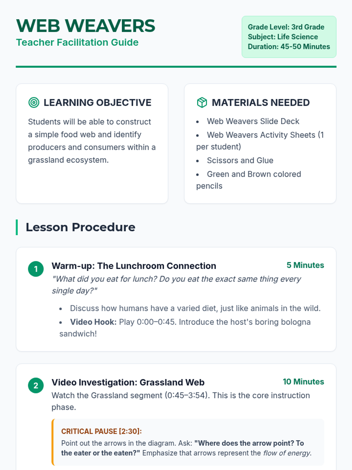 Students will explore how energy flows through an ecosystem by building their own food webs using organisms from a grassland habitat. This lesson uses a high-energy video to introduce the shift from simple food chains to complex, interconnected food webs.