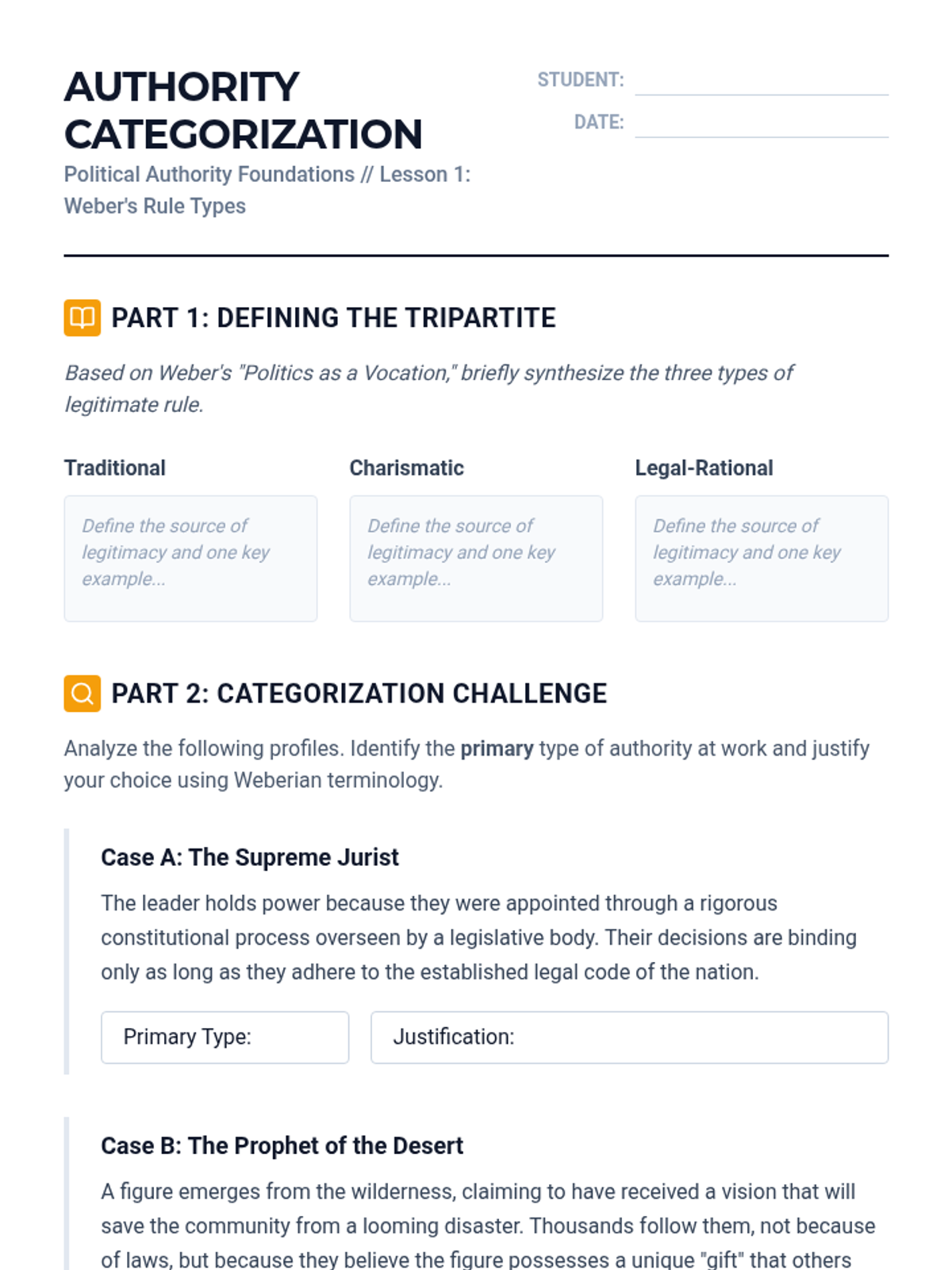 Students analyze Max Weber's tripartite classification of authority (traditional, charismatic, and legal-rational) through his seminal work 'Politics as a Vocation' to distinguish between force and legitimacy.