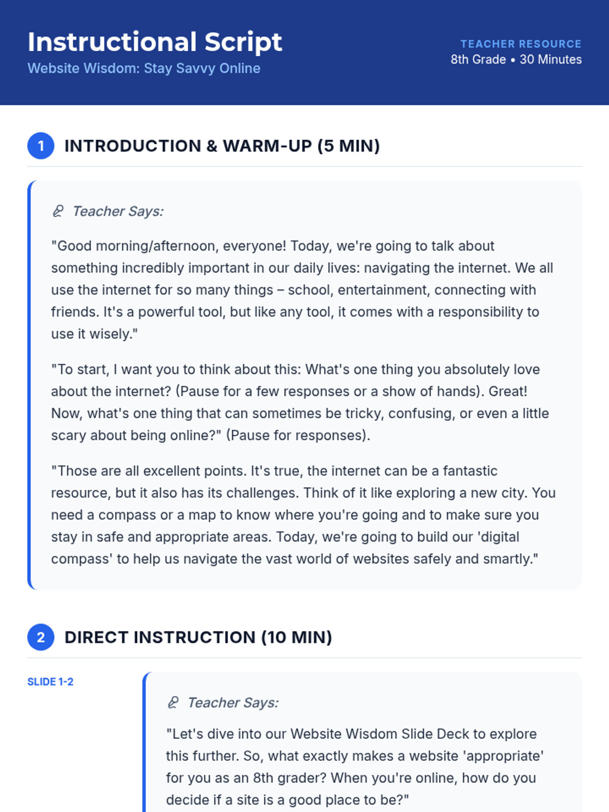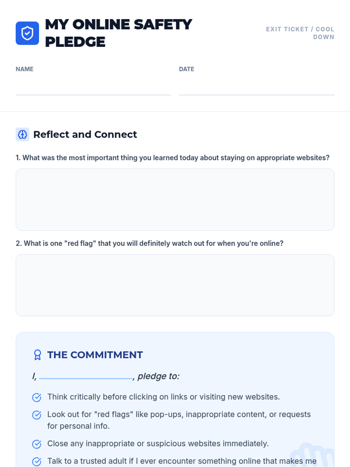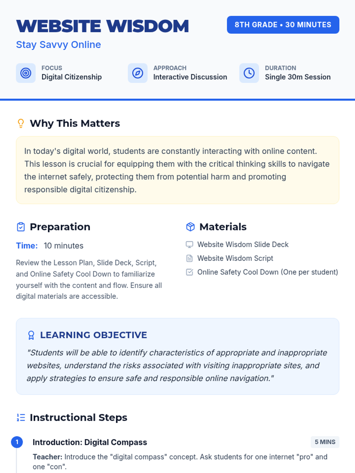 This lesson helps 8th-grade students understand the importance of staying on appropriate websites and how to identify and avoid inappropriate content through interactive discussion and a reflection pledge.
