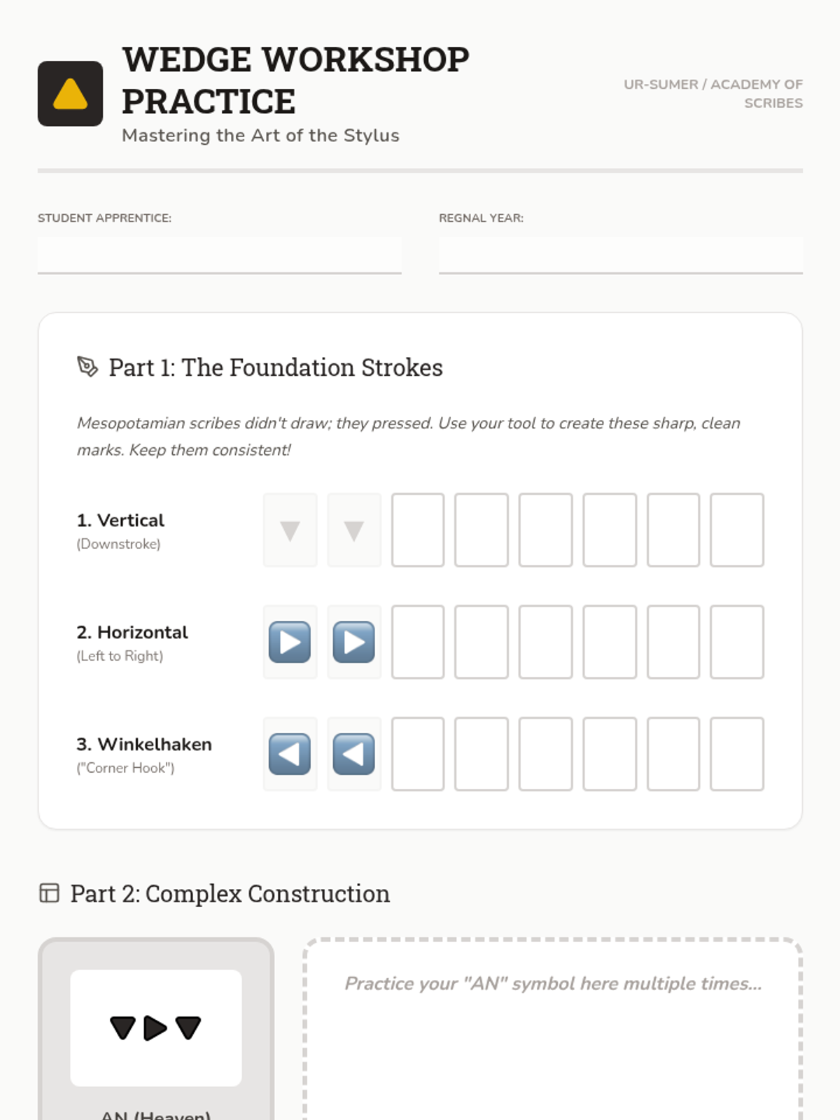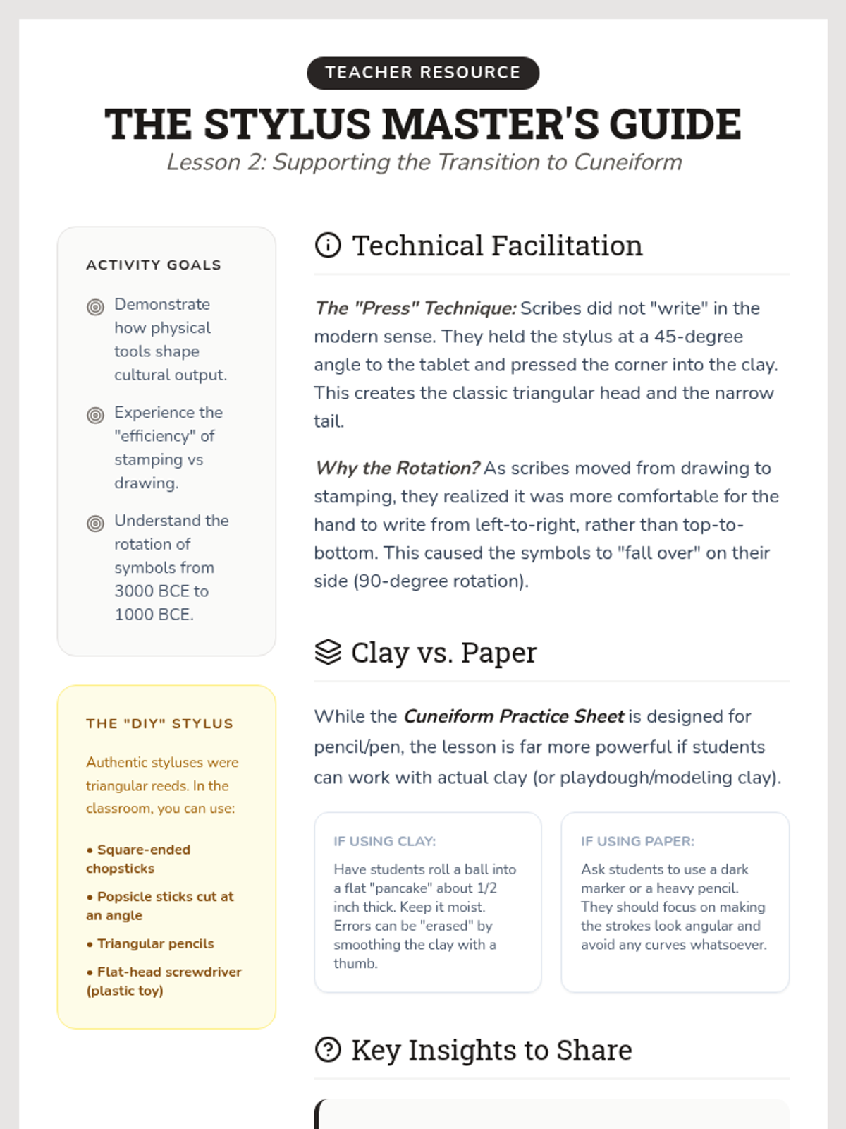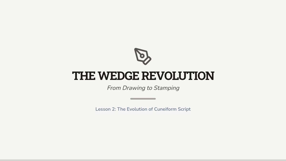 Focusing on the transition to cuneiform, students learn how the reed stylus influenced the shape of writing. They practice the 'wedge' technique and analyze why abstract symbols replaced detailed pictures for speed and efficiency.