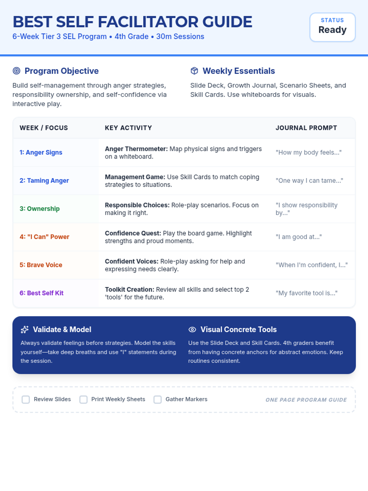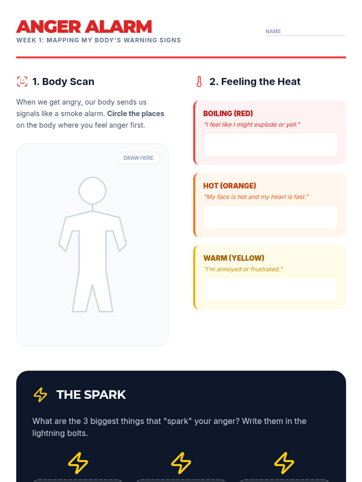 Focus on identifying physical signs of anger and understanding the Anger Thermometer. Students will learn to recognize when their 'temperature' is rising before it reaches a boiling point.