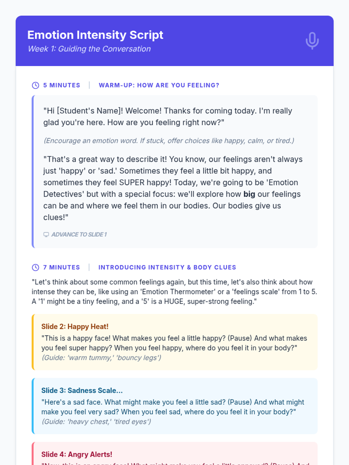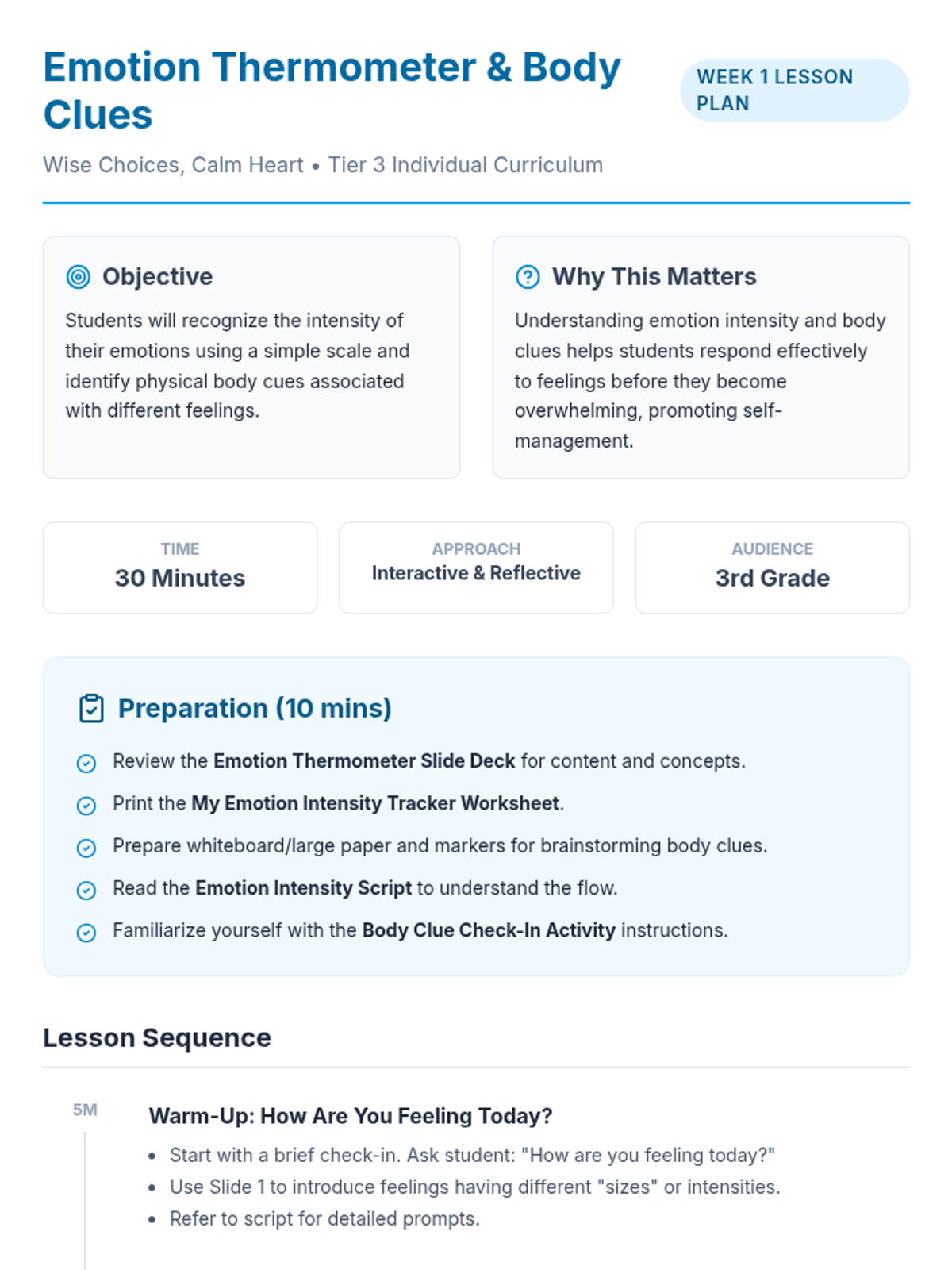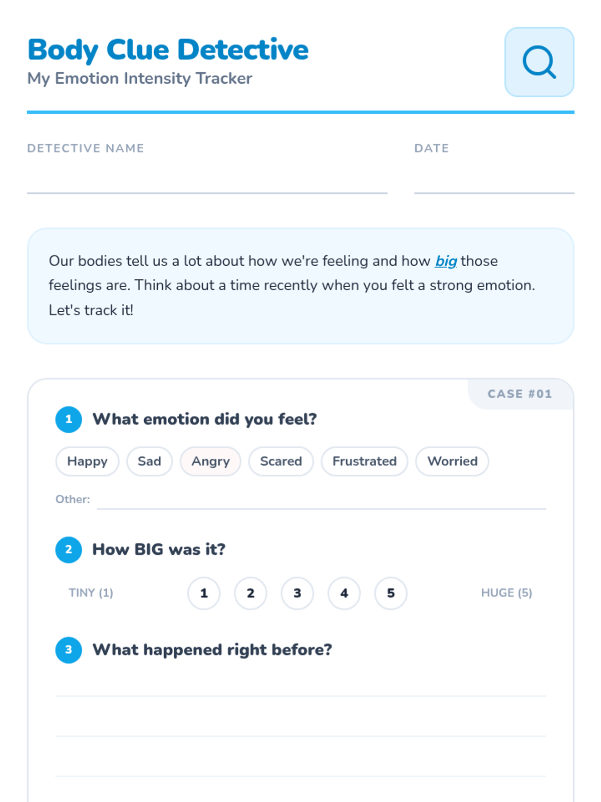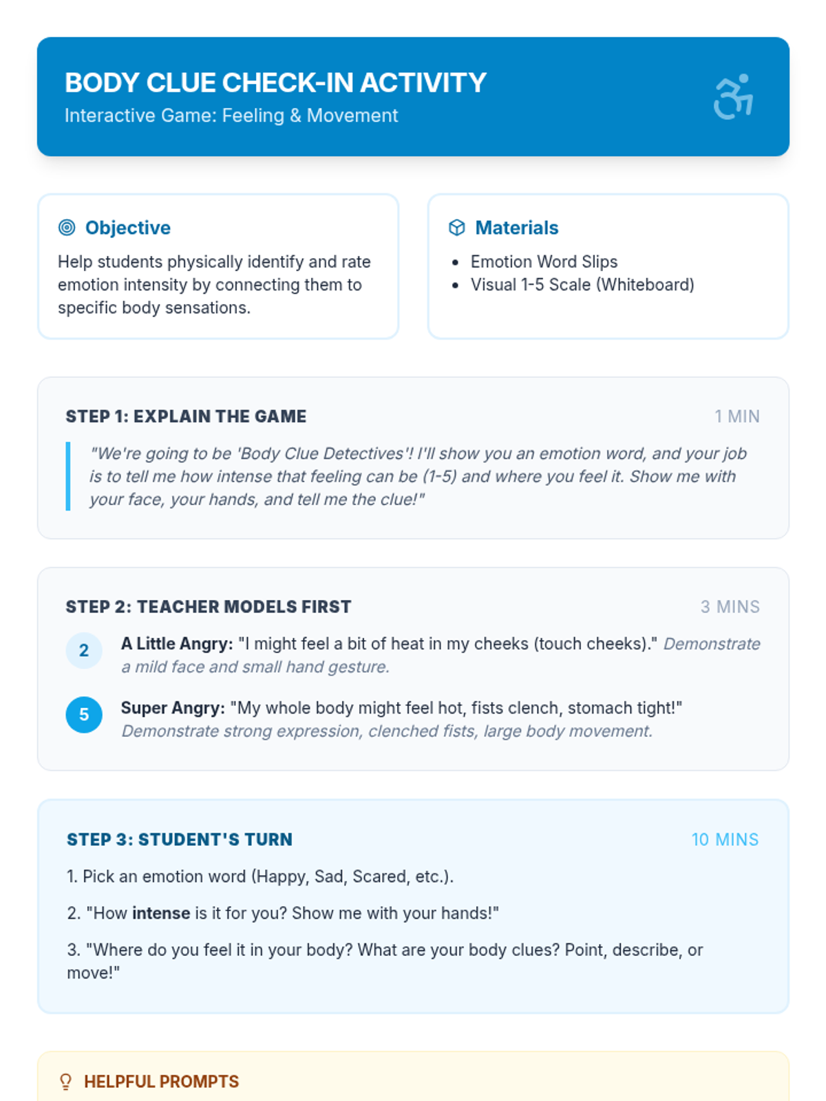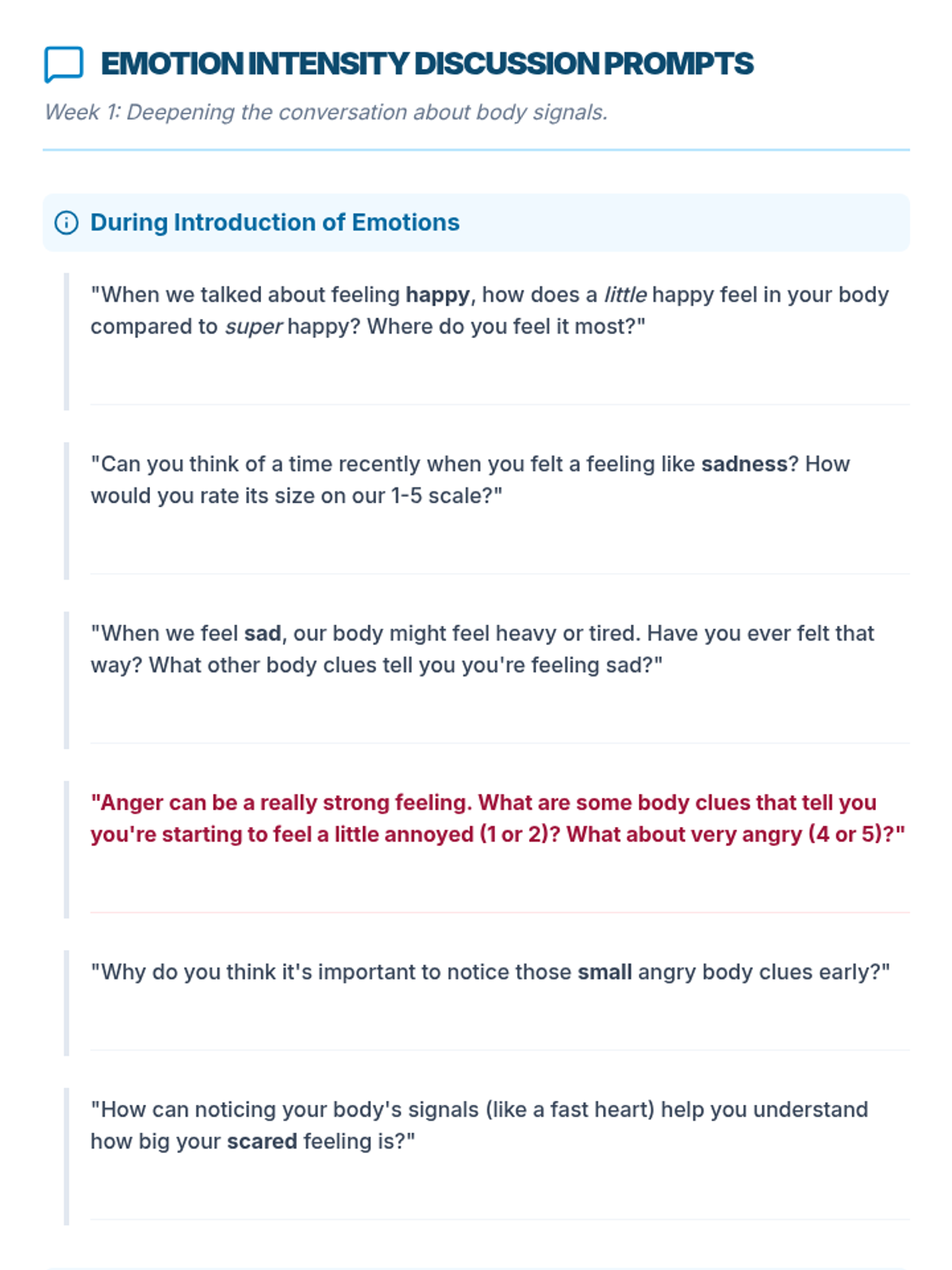Students will recognize the intensity of their emotions using a simple scale and identify physical body cues associated with different feelings.