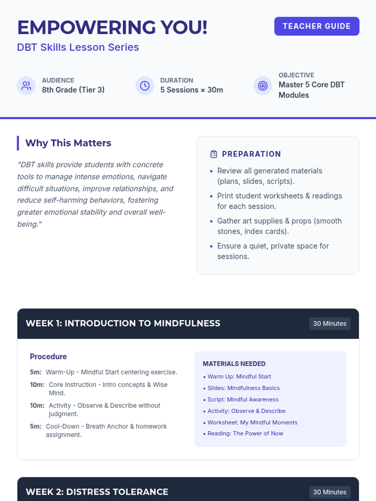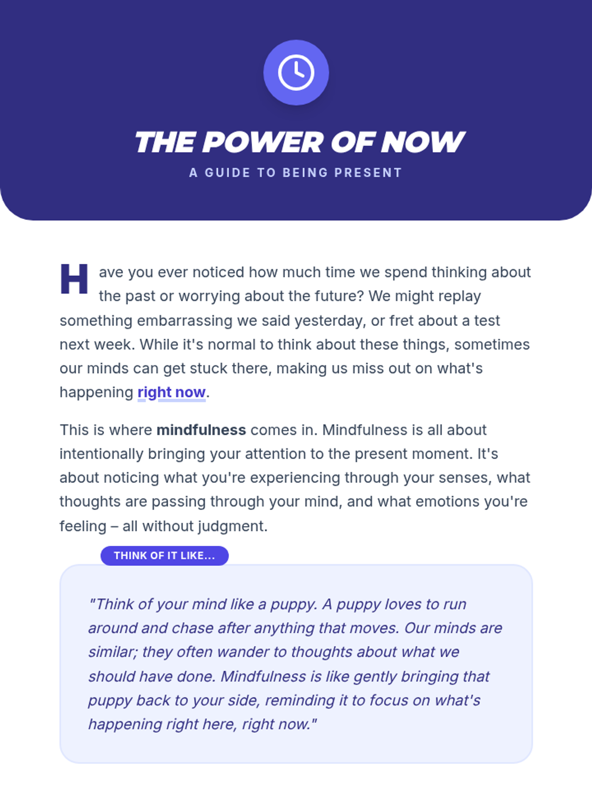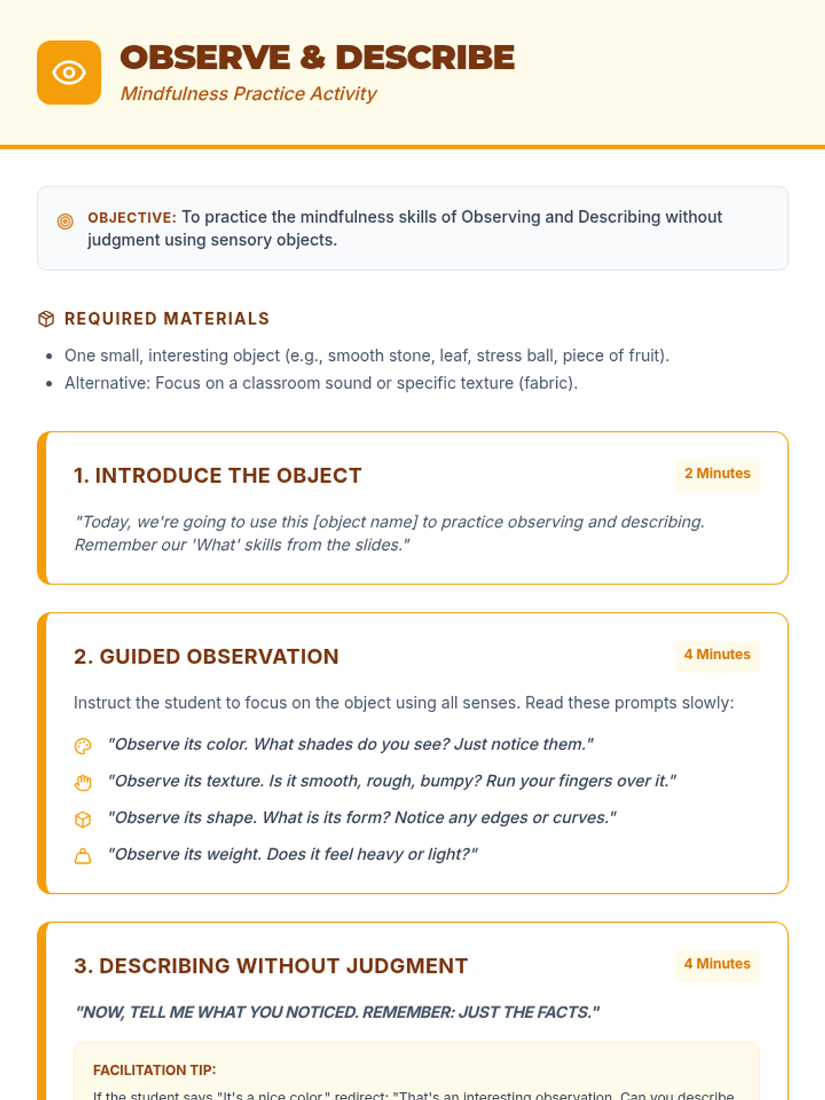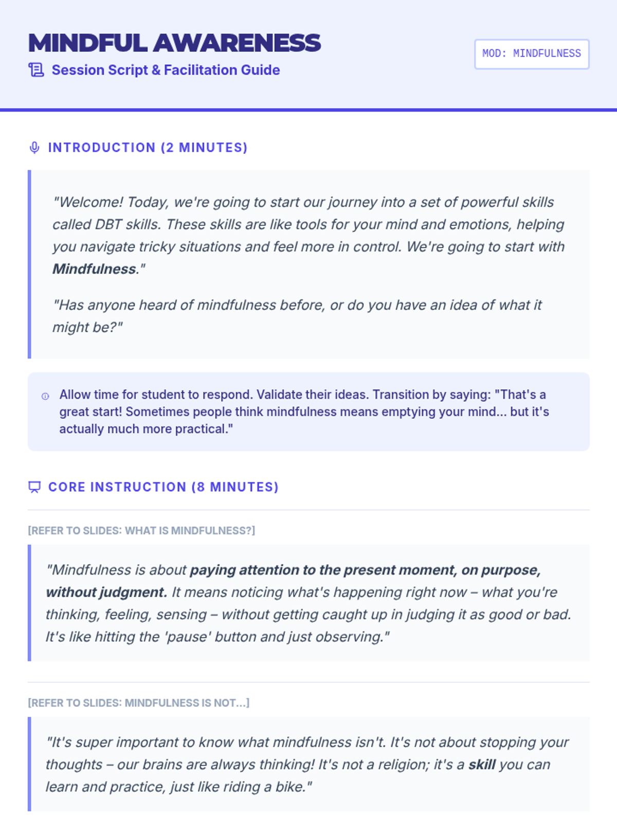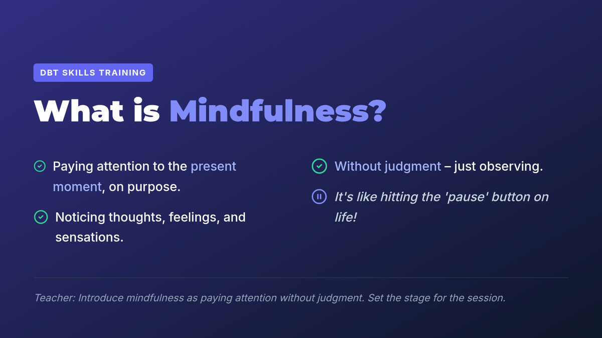 Introduction to the core concepts of mindfulness, focusing on being present, non-judgment, and the 'What' skills of Observe and Describe.