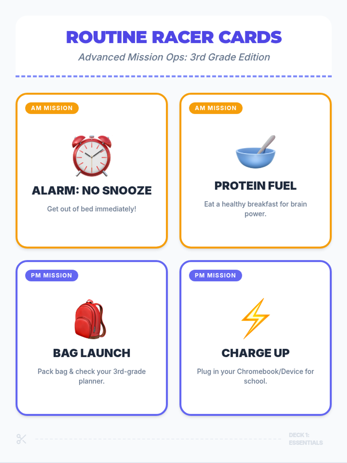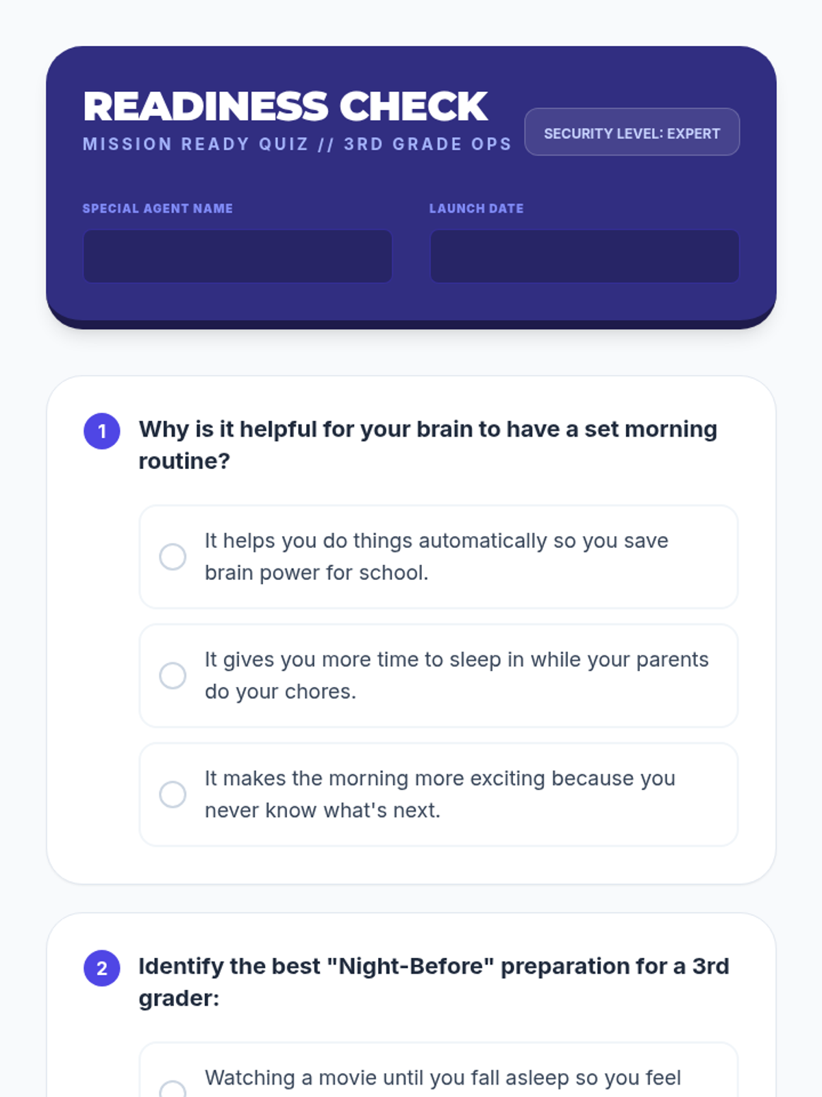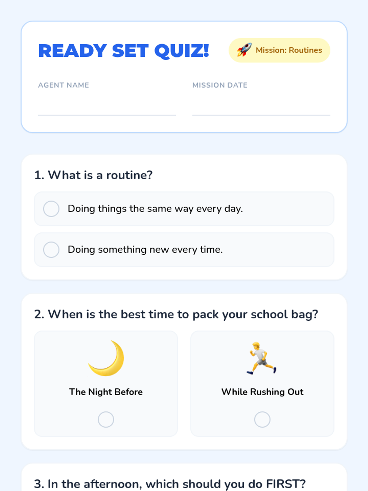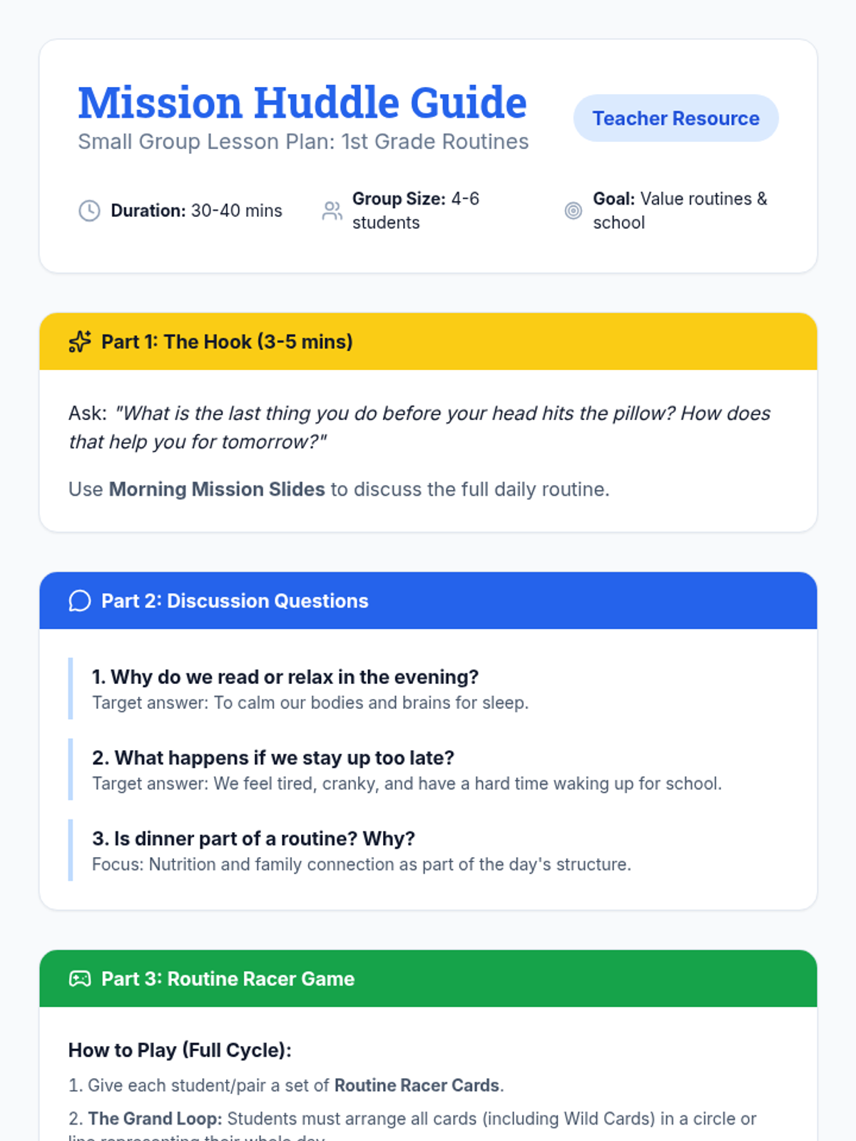 A small group lesson for 3rd graders focused on developing independent morning and evening routines. Students learn to prioritize tasks and manage their time to arrive at school ready for launch.