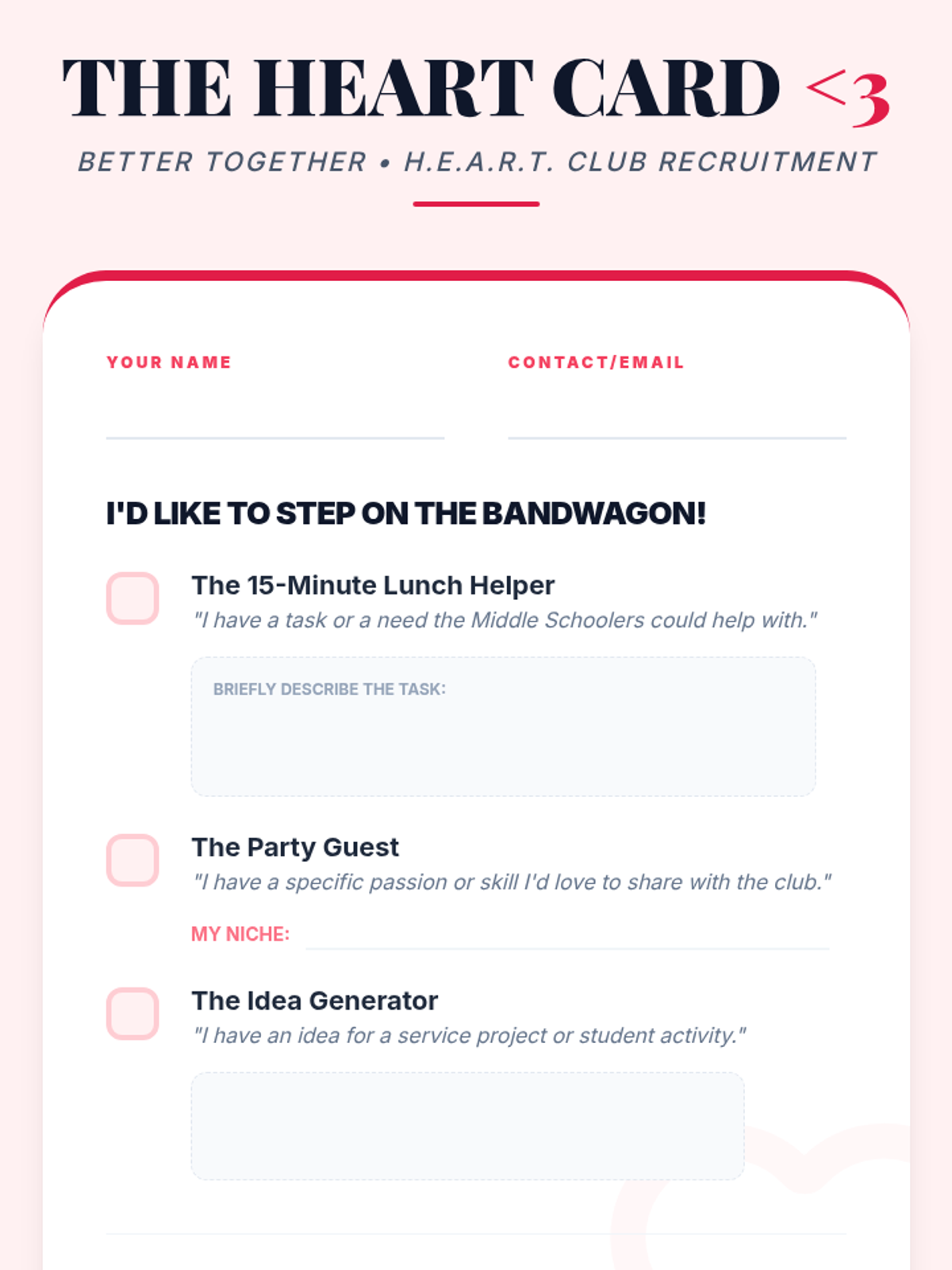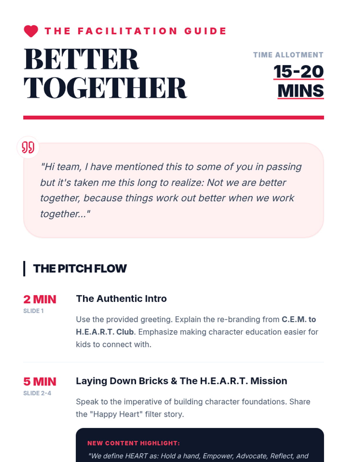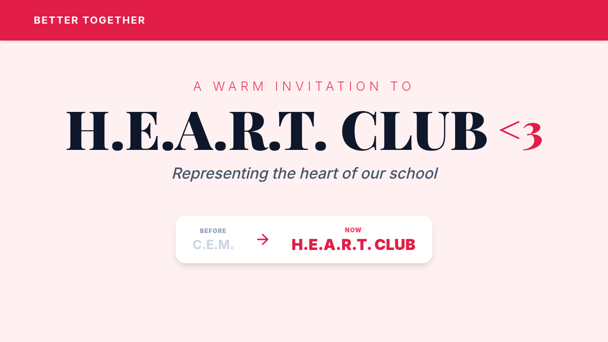 A 15-20 minute faculty presentation introducing the H.E.A.R.T. Club, celebrating its early student-led successes, and inviting faculty to collaborate.
