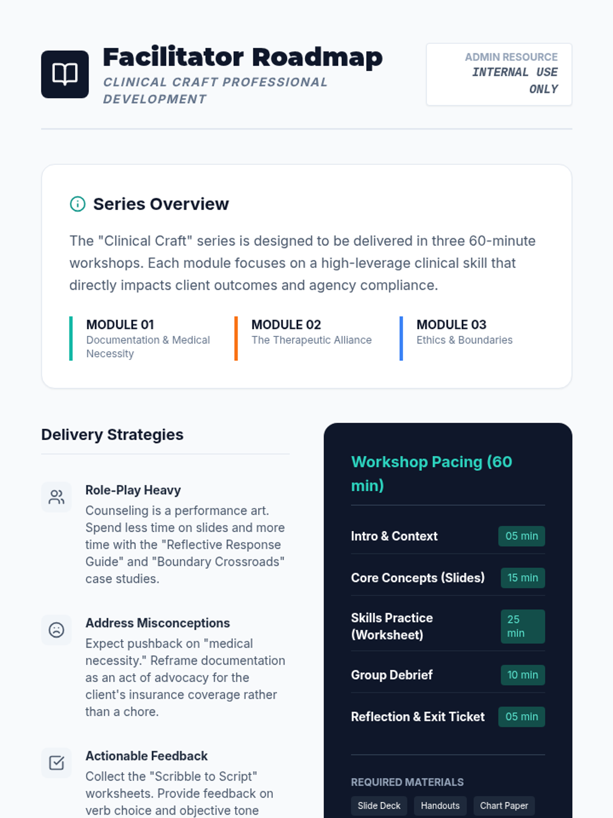 Administrative and facilitator resources for the Clinical Craft series, including training roadmaps and evaluation tools.