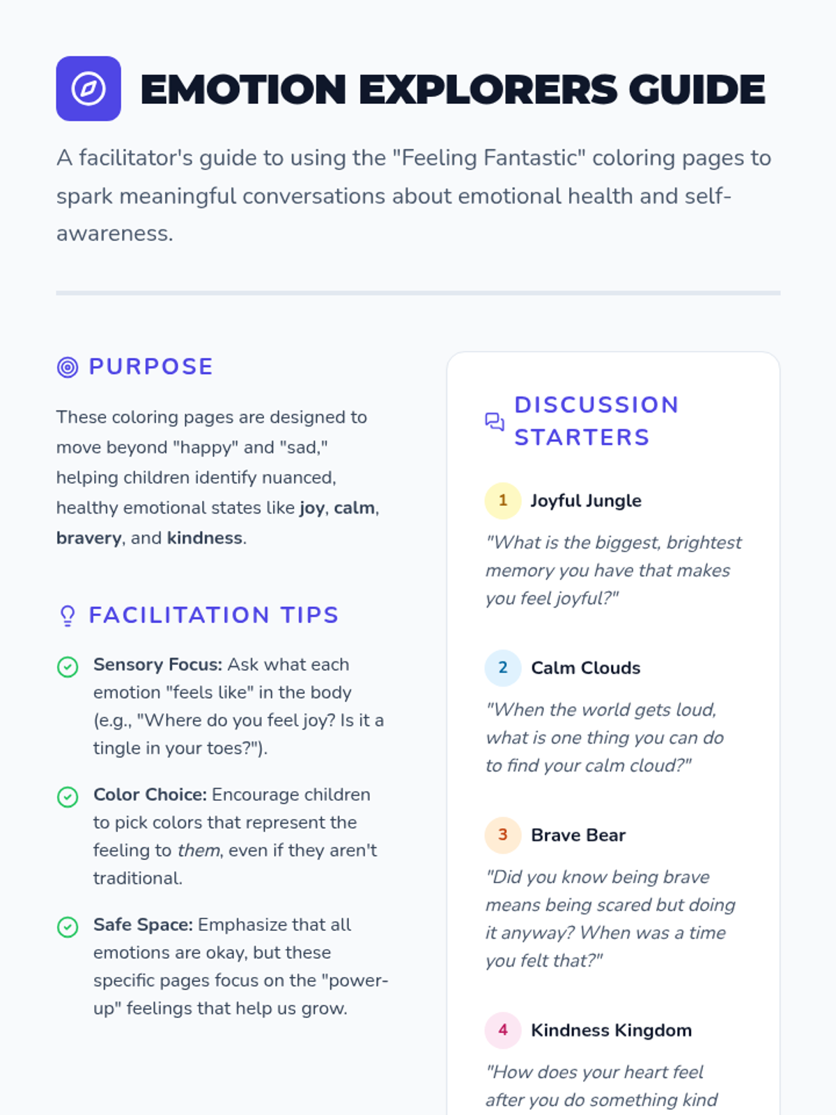 A collection of creative coloring pages and a facilitator guide designed to help children identify, name, and celebrate healthy emotions through art and reflection.