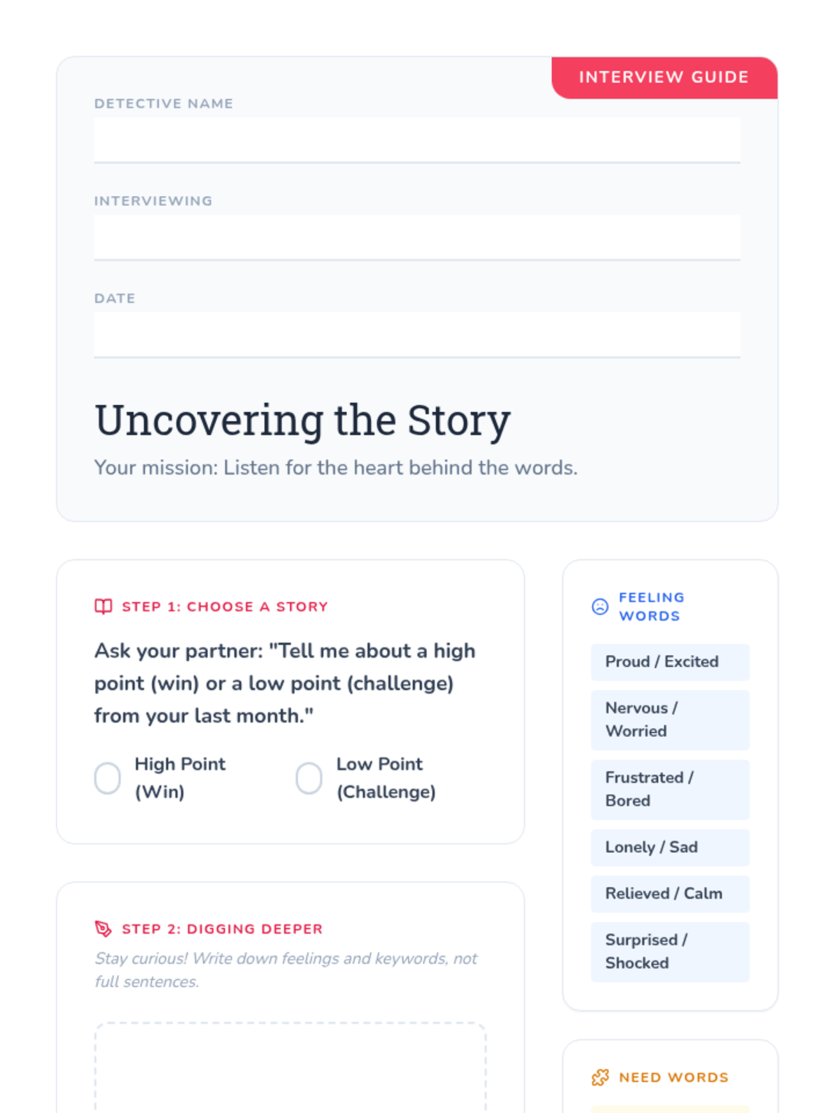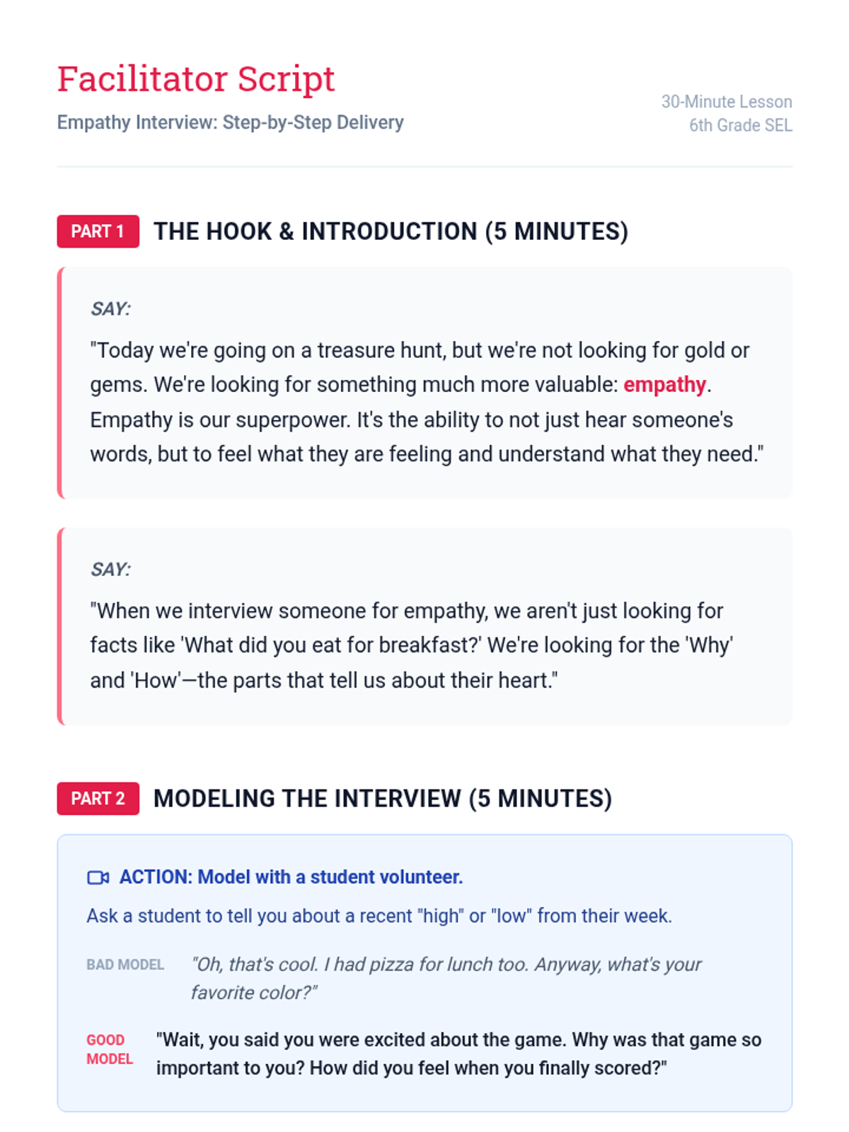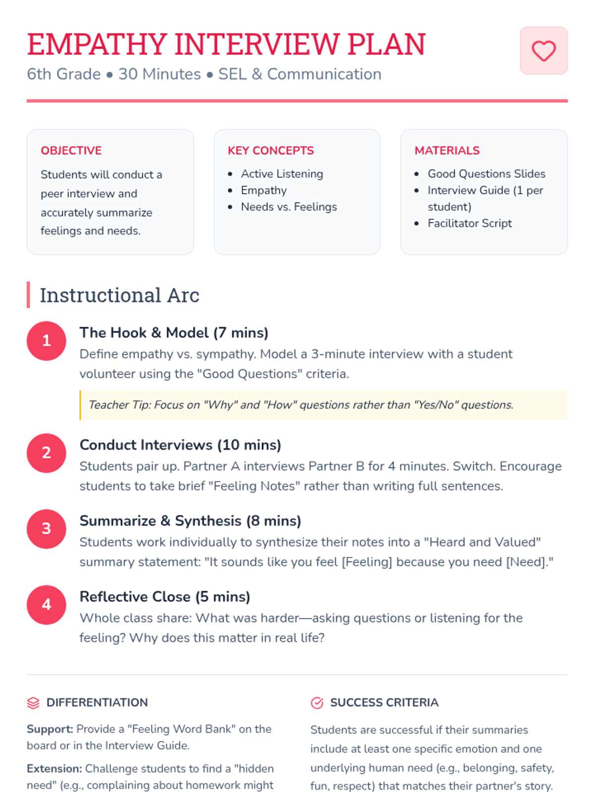 In this 30-minute social-emotional learning lesson, 6th-grade students practice active listening and empathy by conducting peer interviews. They learn to identify underlying feelings and needs, moving beyond surface-level conversation to build deeper connections.