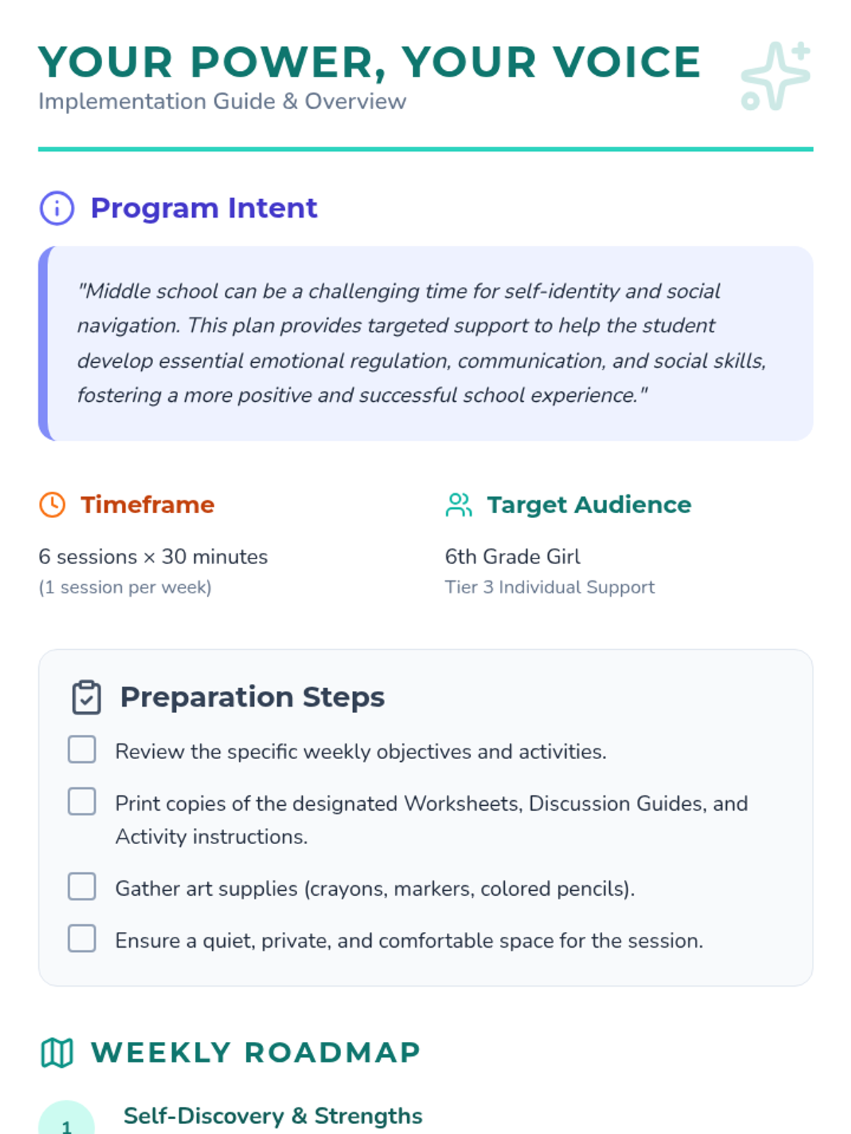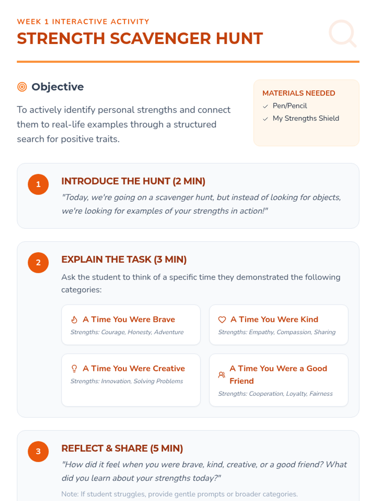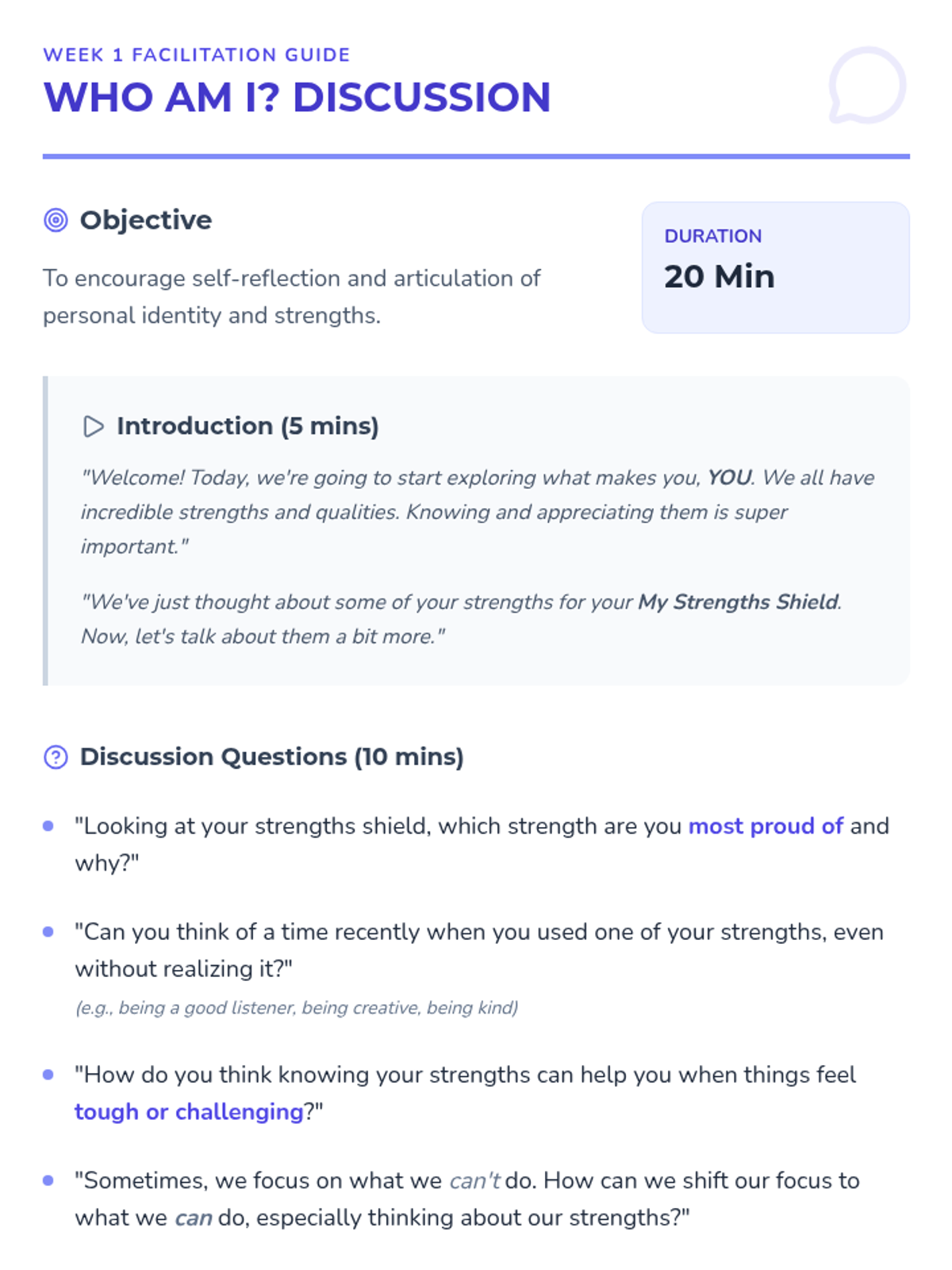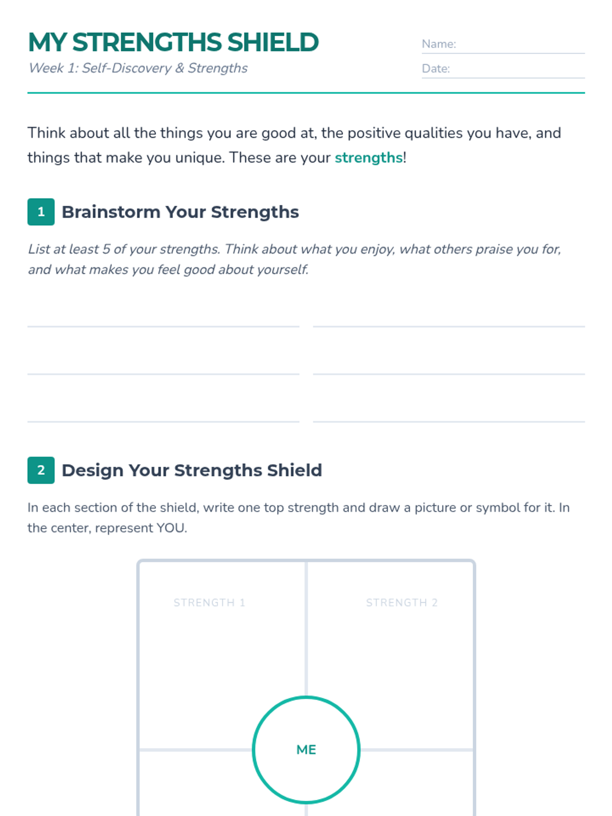 Focuses on identifying personal strengths and exploring self-identity through creative activities and guided discussion.