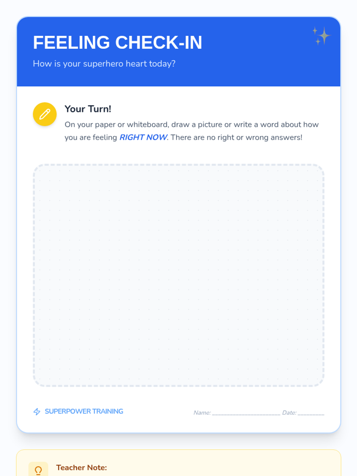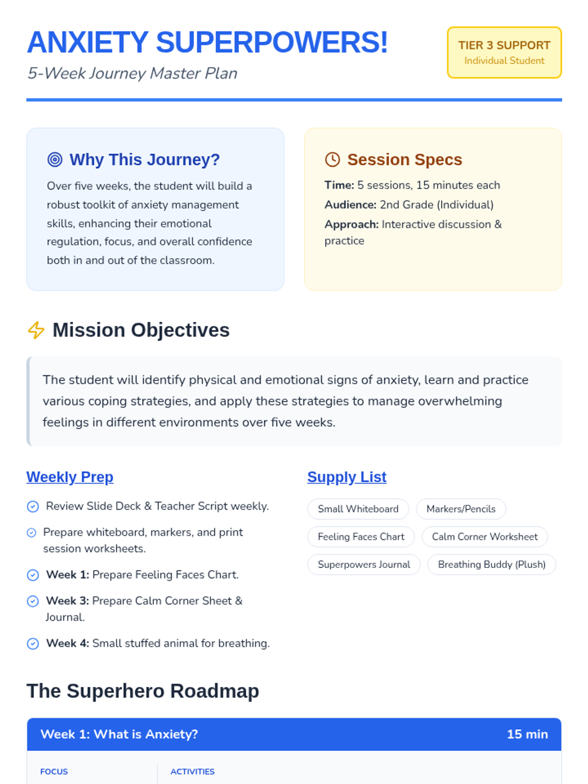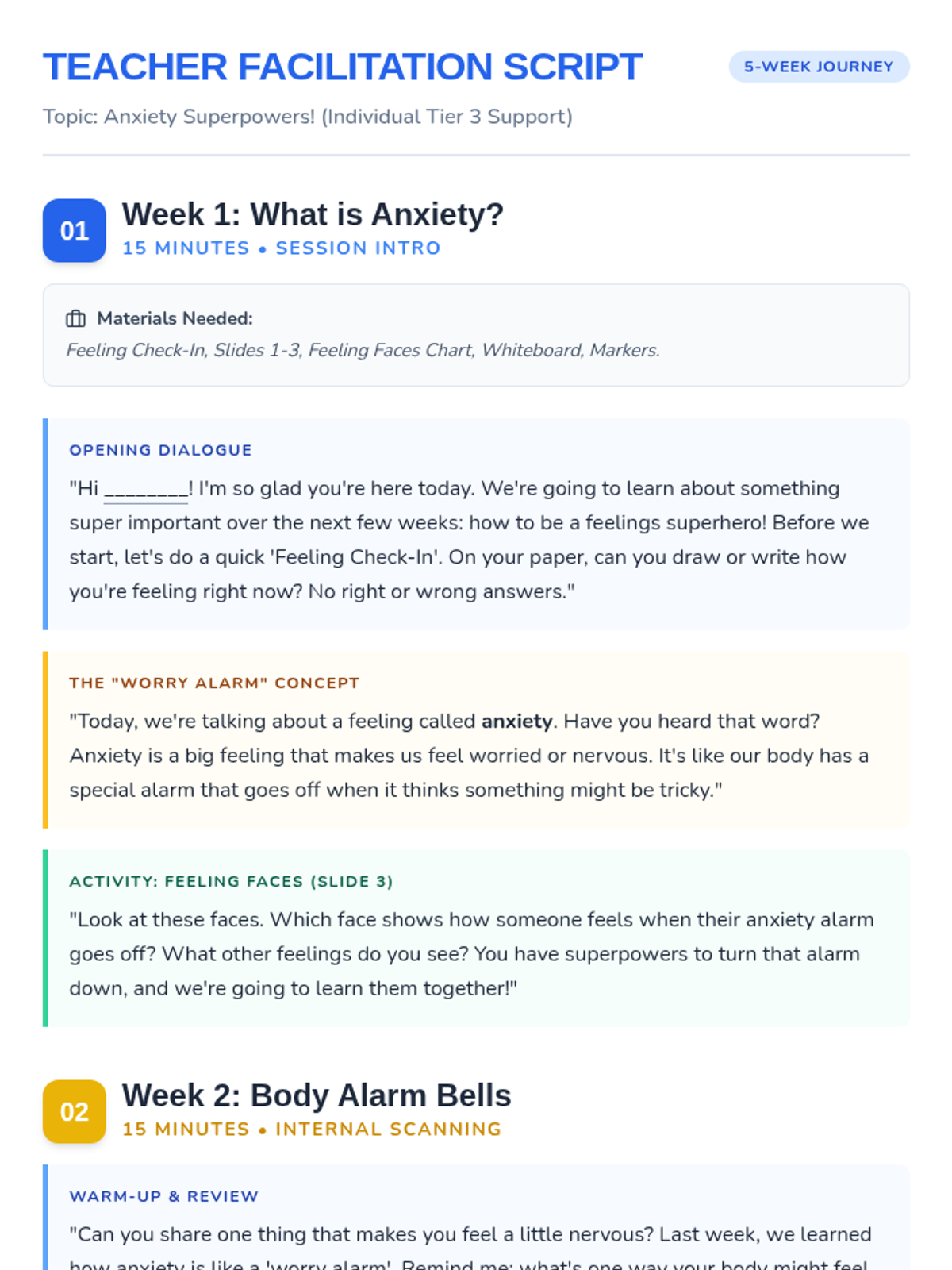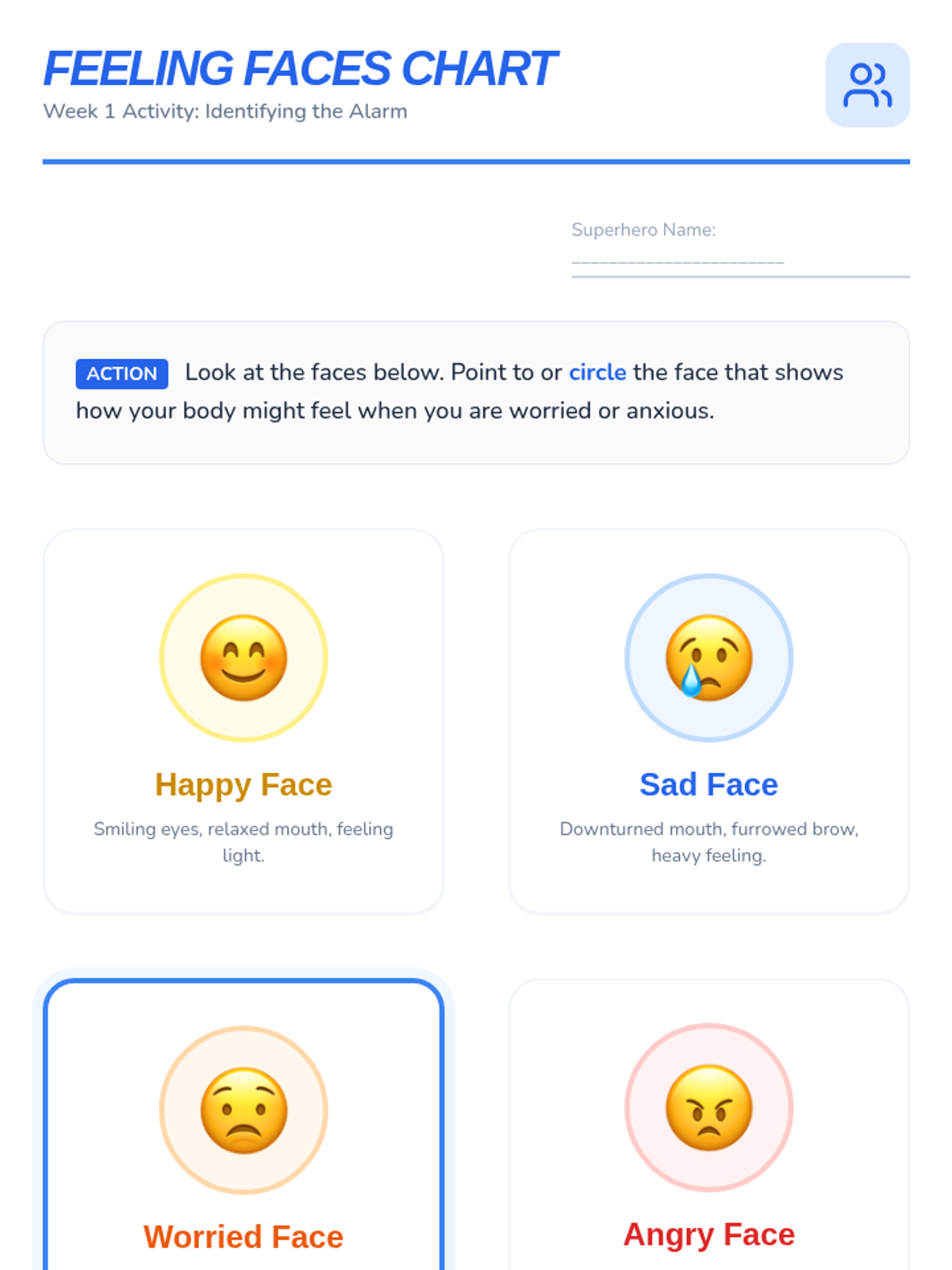 Introduces anxiety as a 'worry alarm' and helps students identify physical sensations associated with big feelings using the Feeling Faces Chart.