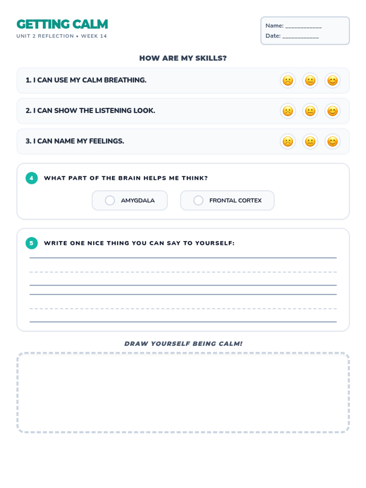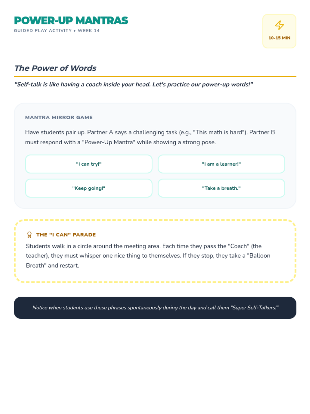 Students practice saying encouraging things to themselves to help with difficult tasks.
