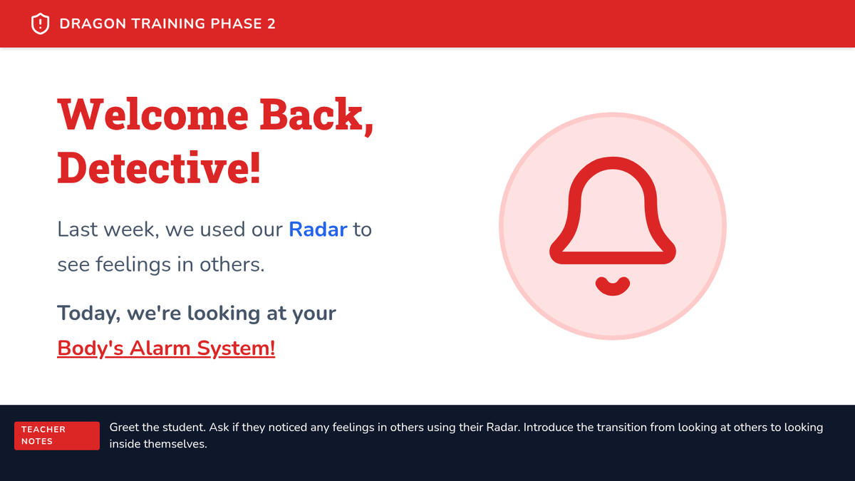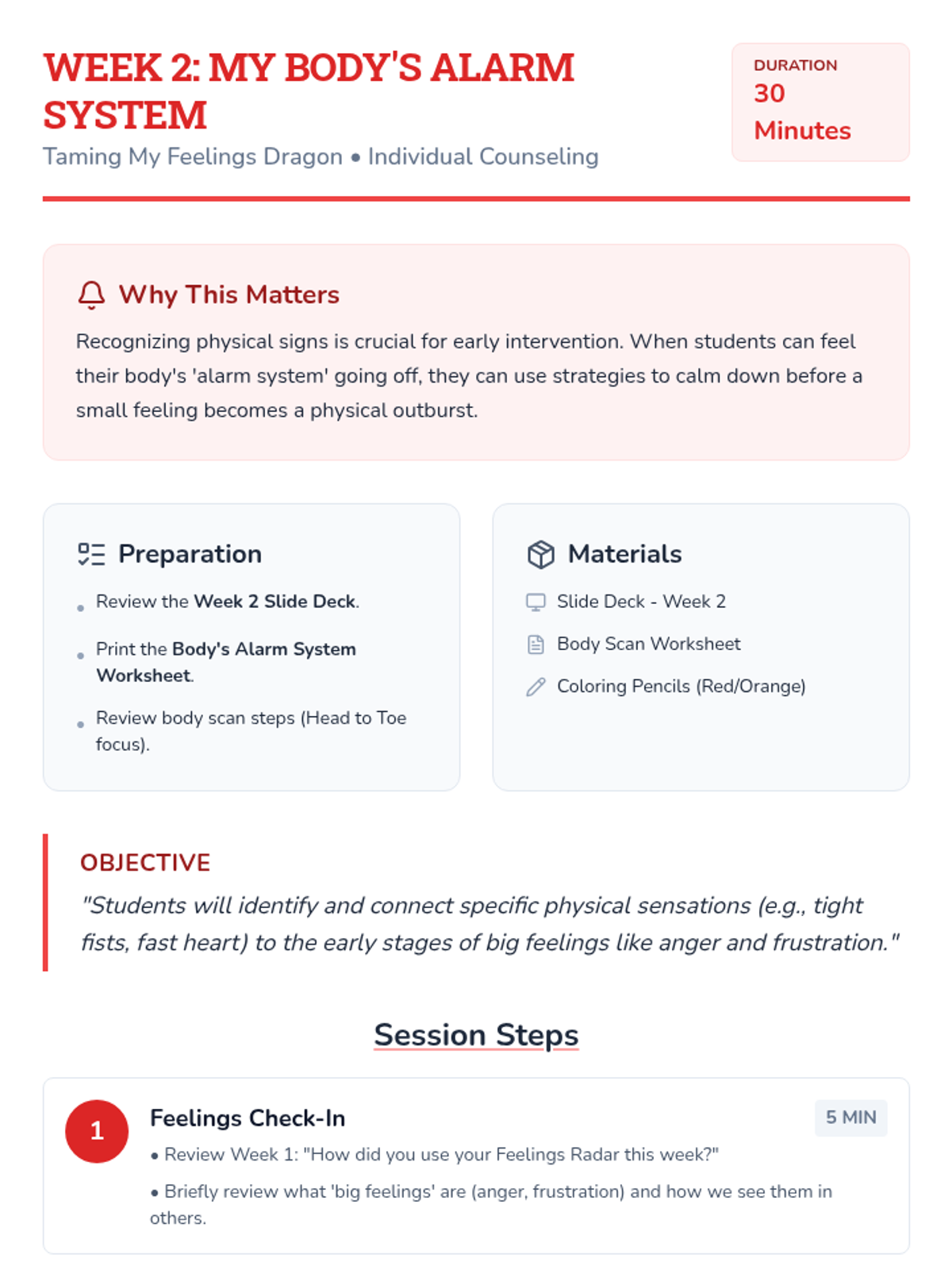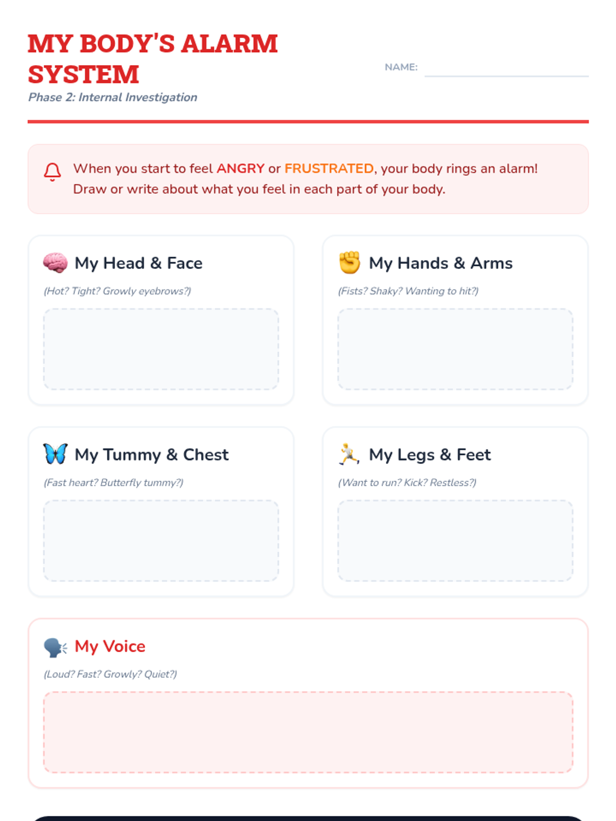 Teaches students to notice the physical early warning signs (the 'alarm system') their body gives off when big feelings start.