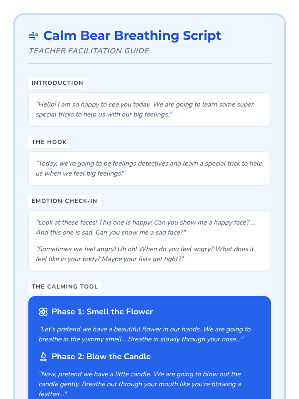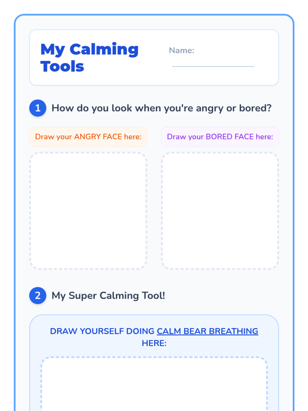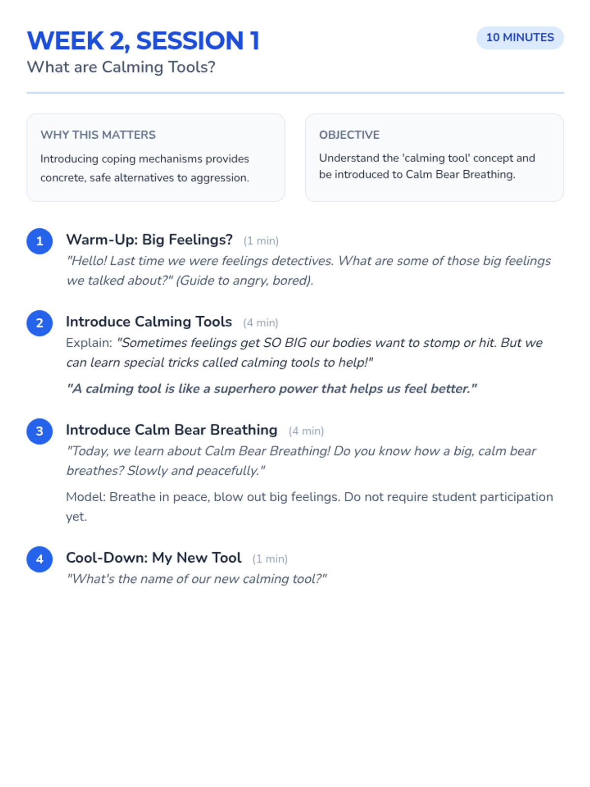 Introduce 'calming tools' and teach the first primary strategy, Calm Bear Breathing, to help manage big feelings when they arise.