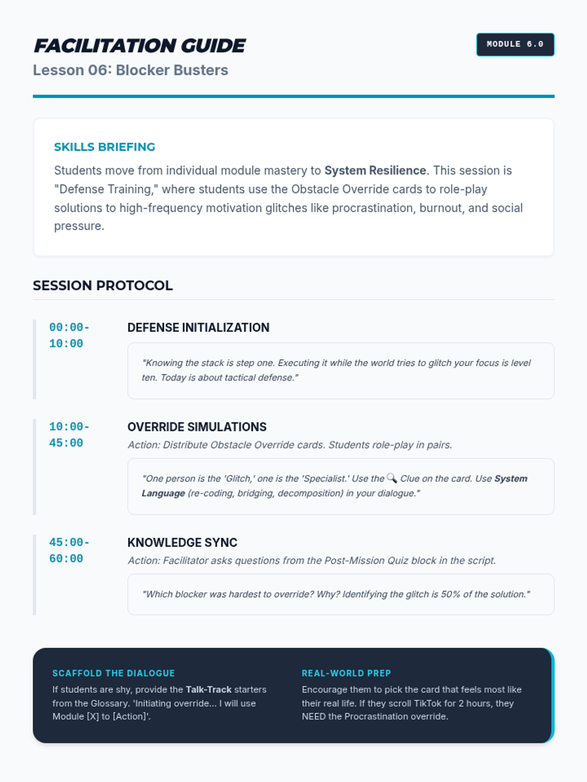 Identifies common 'blockers' like fear and procrastination, and uses role-play and discussion to build 'ninja' defense strategies.