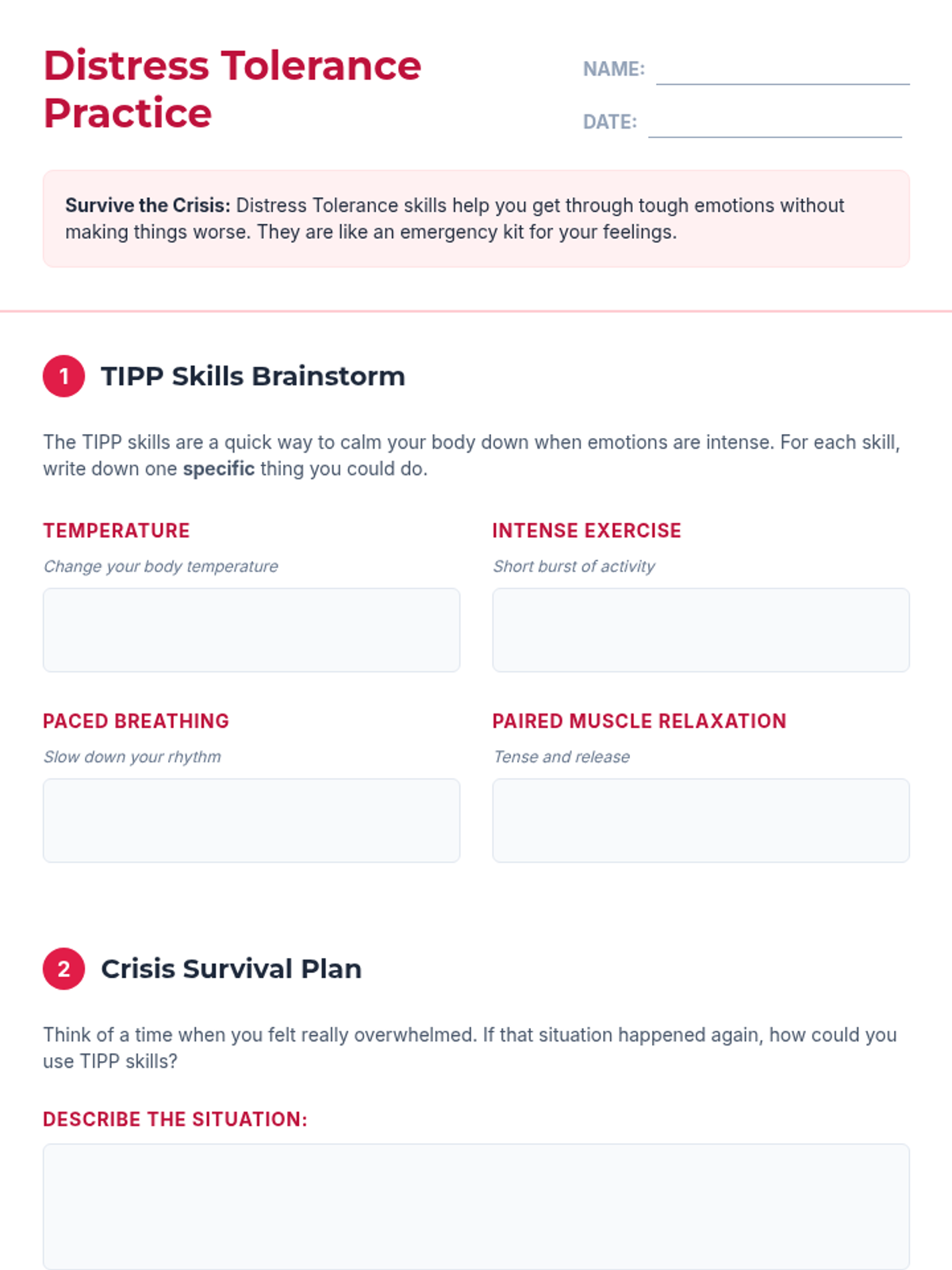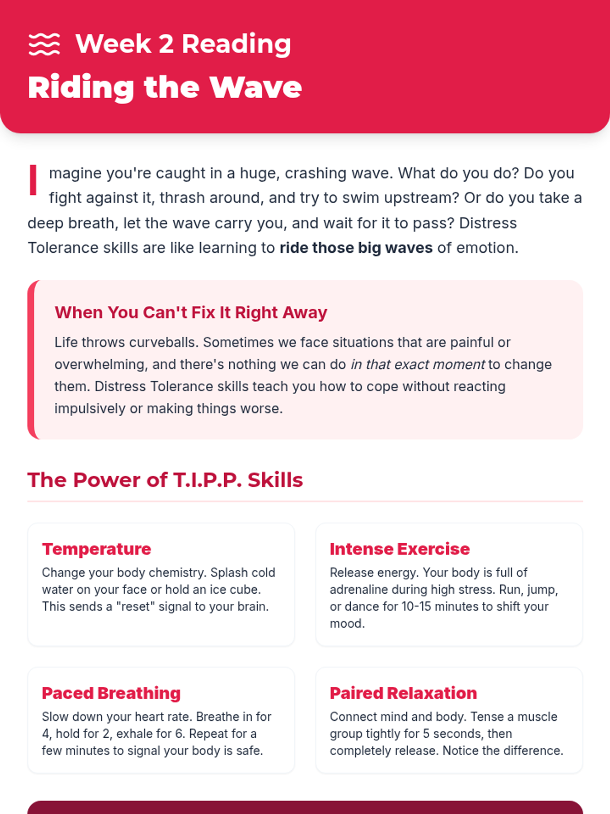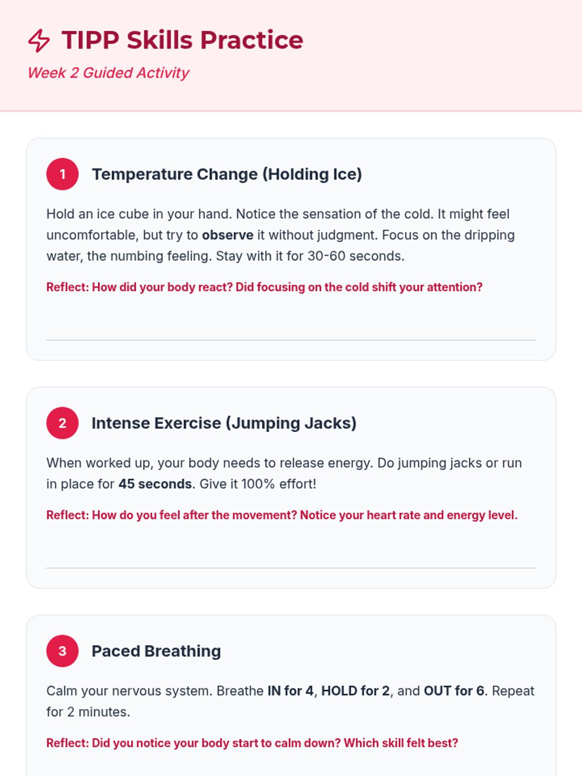 Learning TIPP and other crisis survival skills to manage overwhelming emotions.