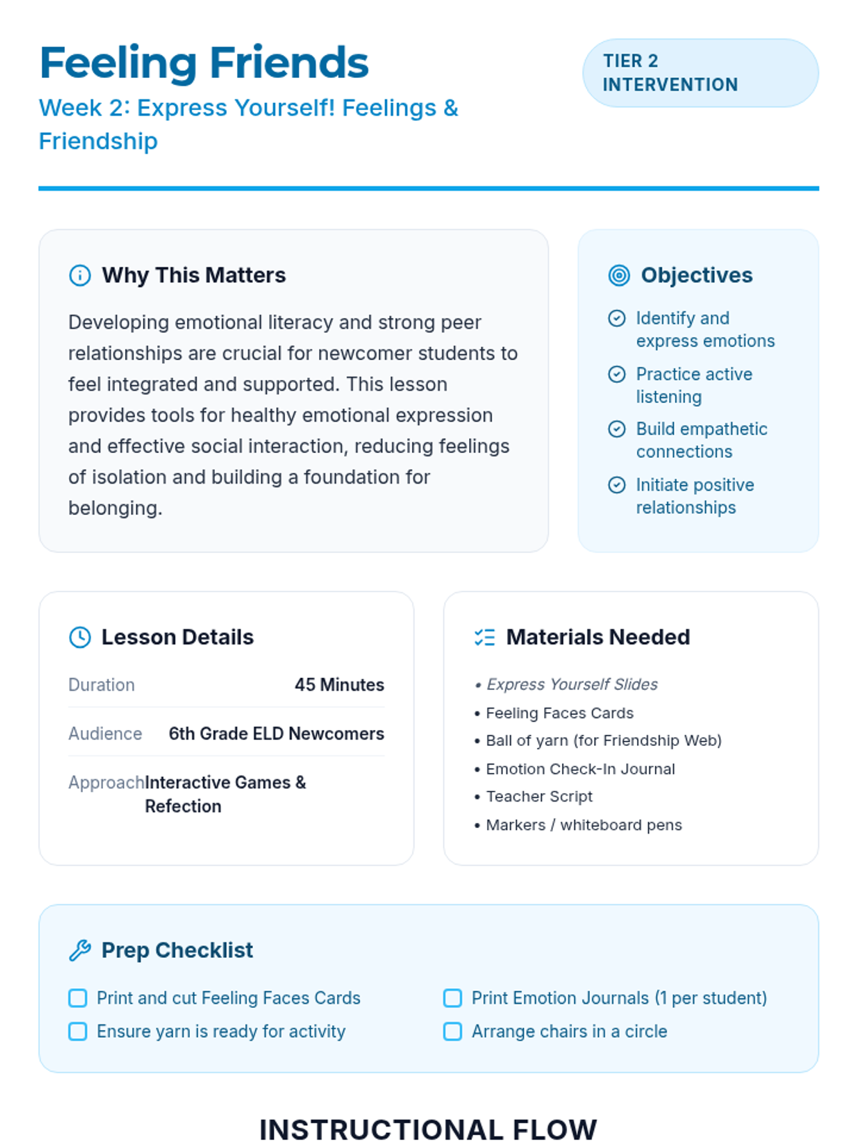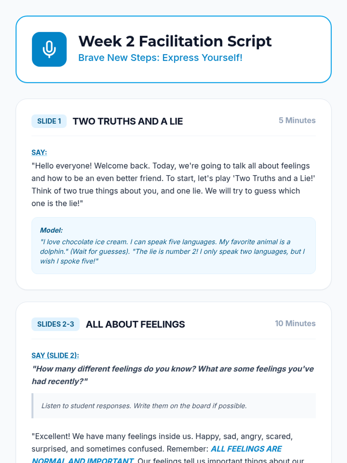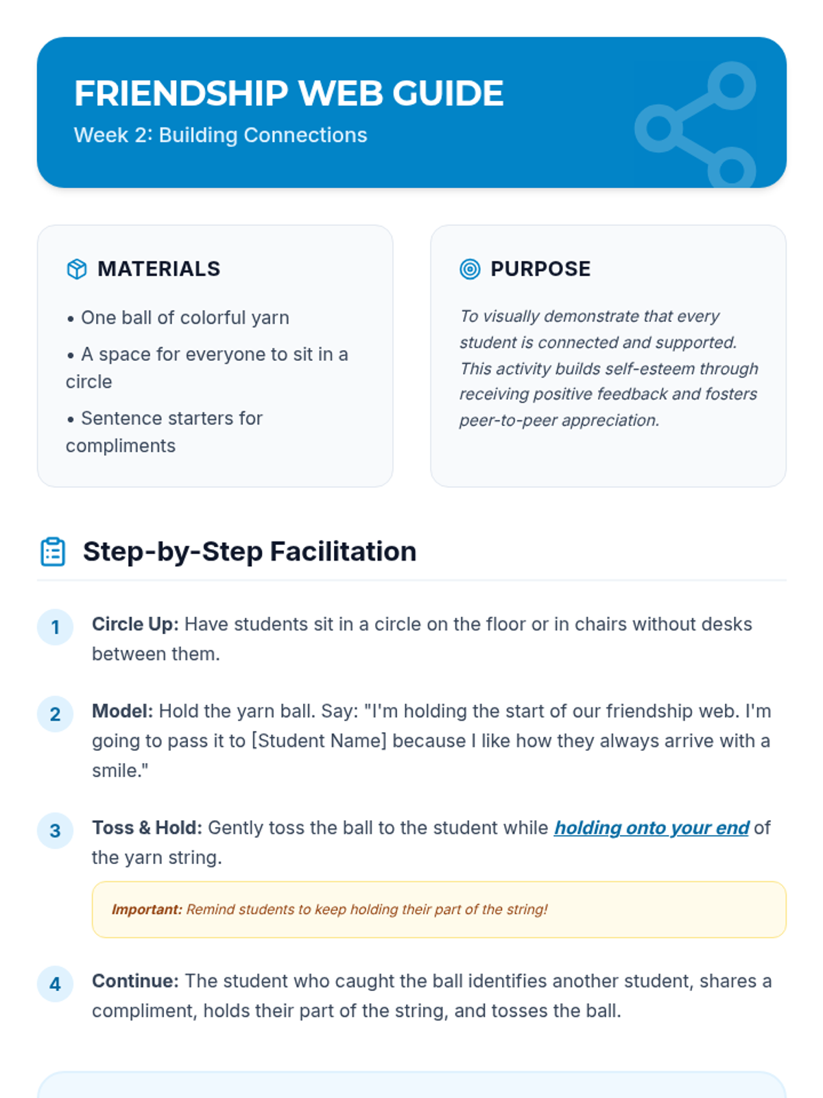 Explores emotional literacy and the importance of healthy peer connections through interactive activities.