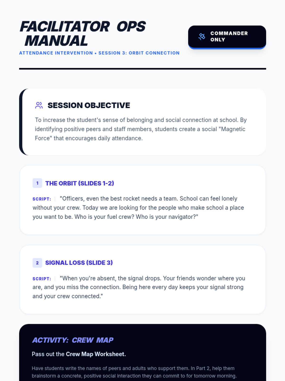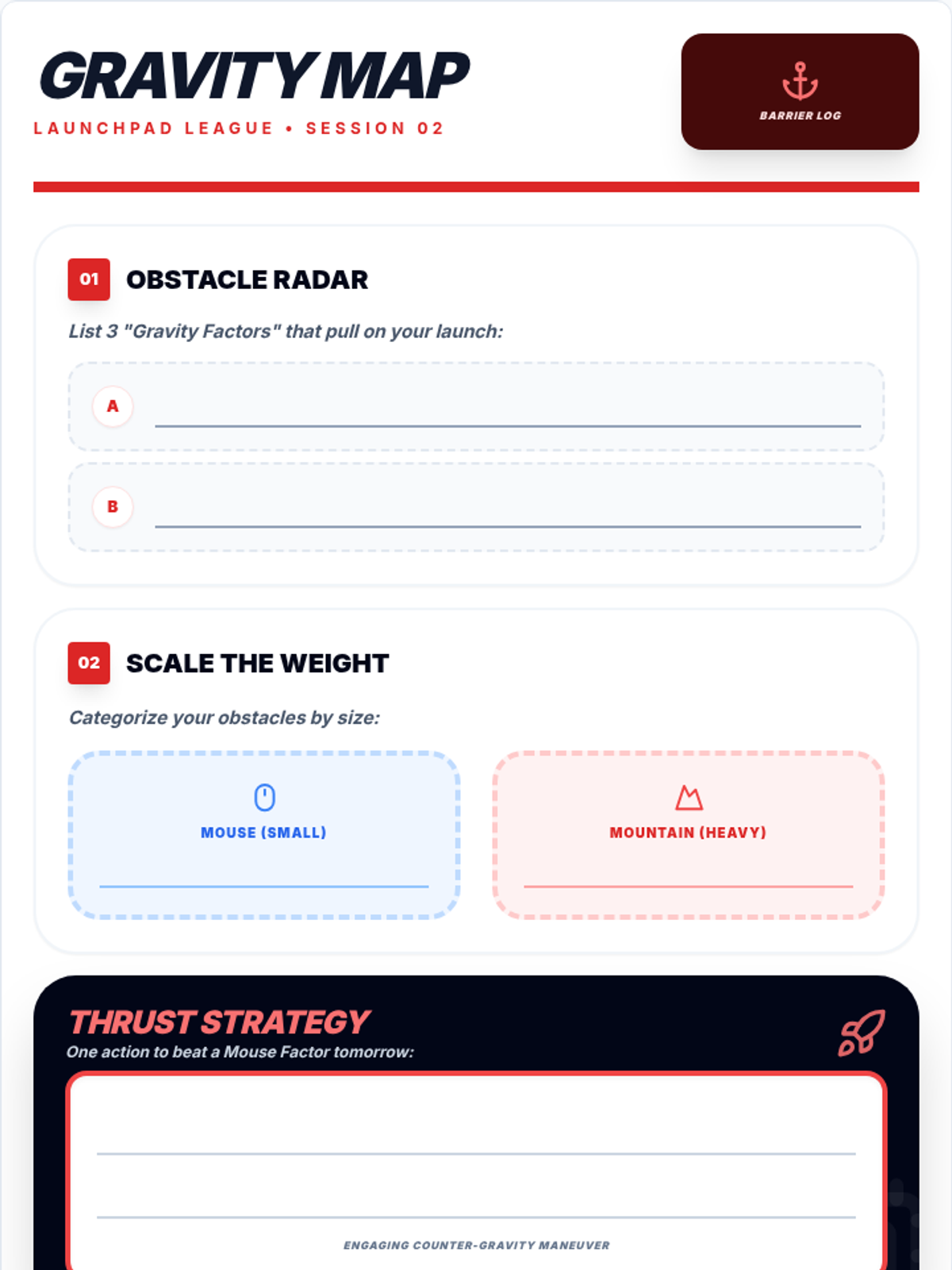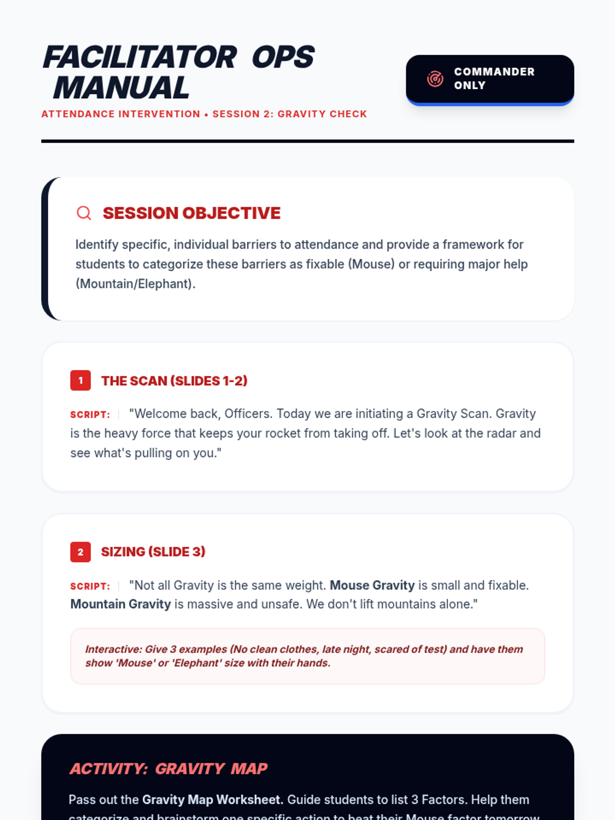 Officers investigate the 'Gravity' pulling them away from school. Students identify specific barriers (sleep, anxiety, morning chaos) and scale them from Mouse to Elephant glitches.