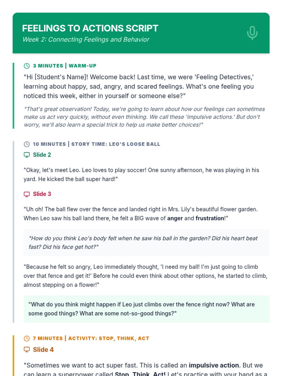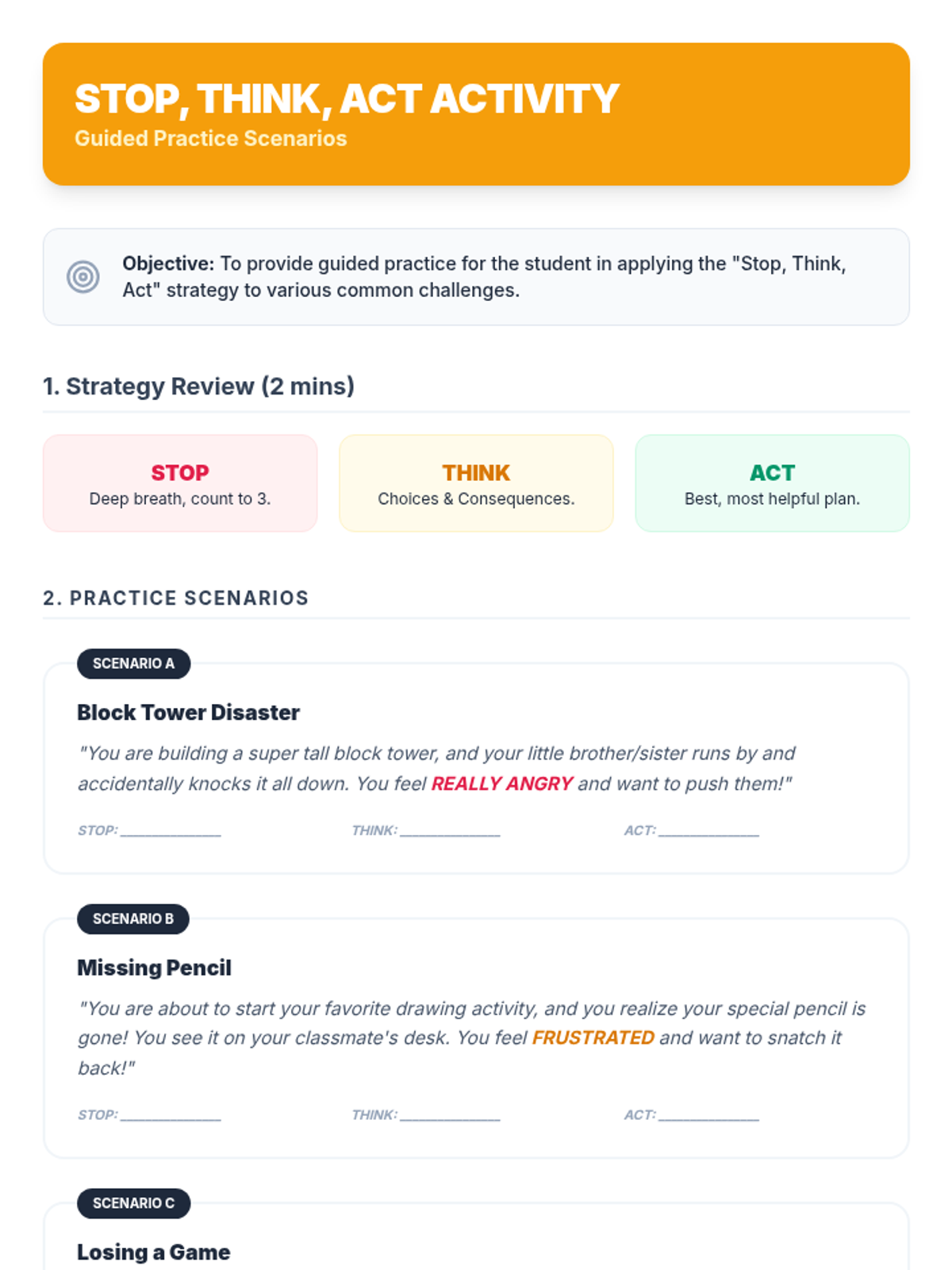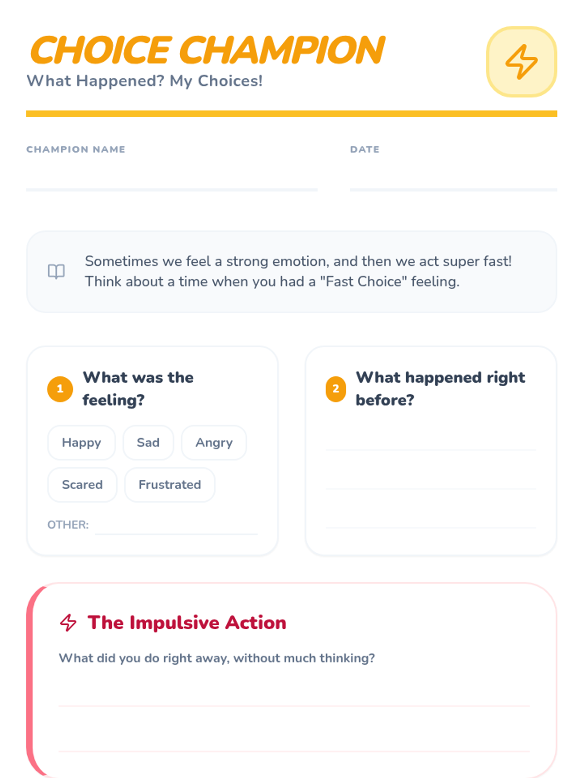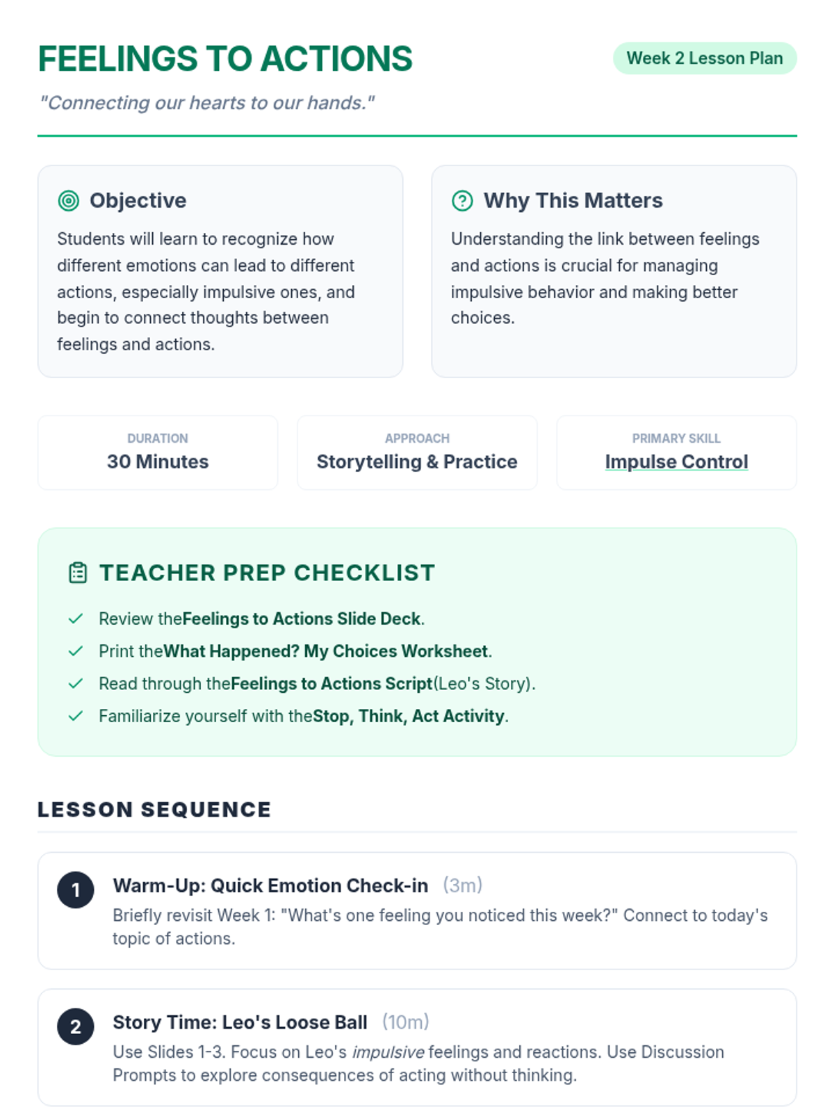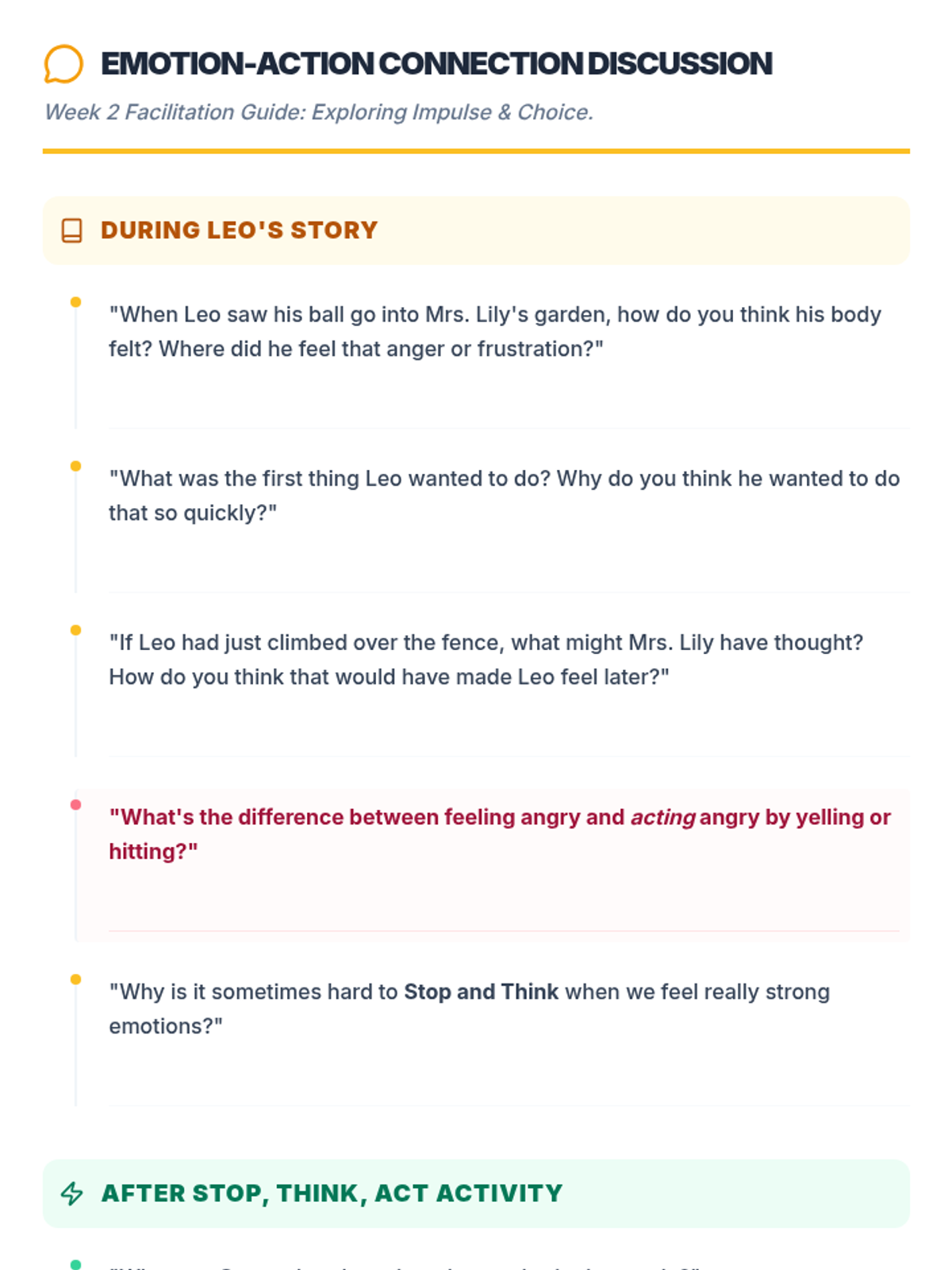 Students will learn to recognize how different emotions can lead to different actions, especially impulsive ones, and begin to connect thoughts between feelings and actions.