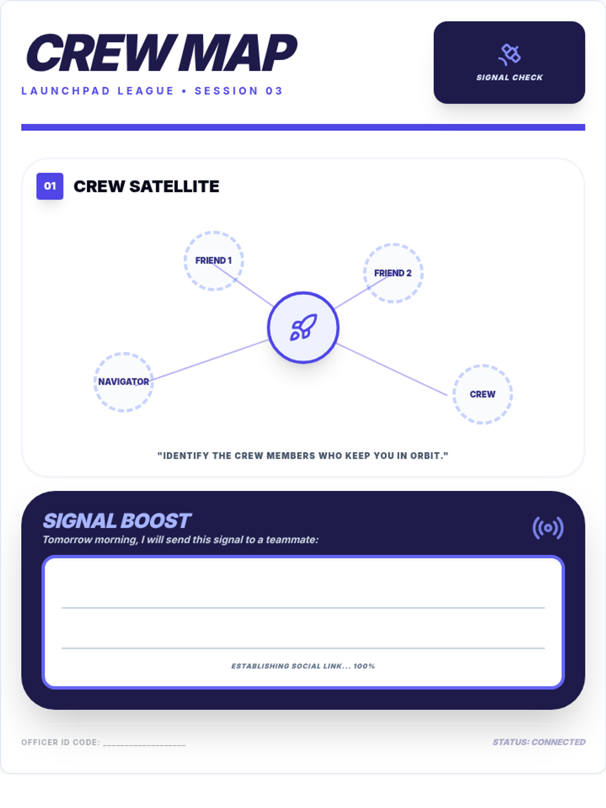 Focuses on the social benefits of school and building a sense of belonging. Students identify their 'Satellite Team'—friends and staff who make school a place they want to be.