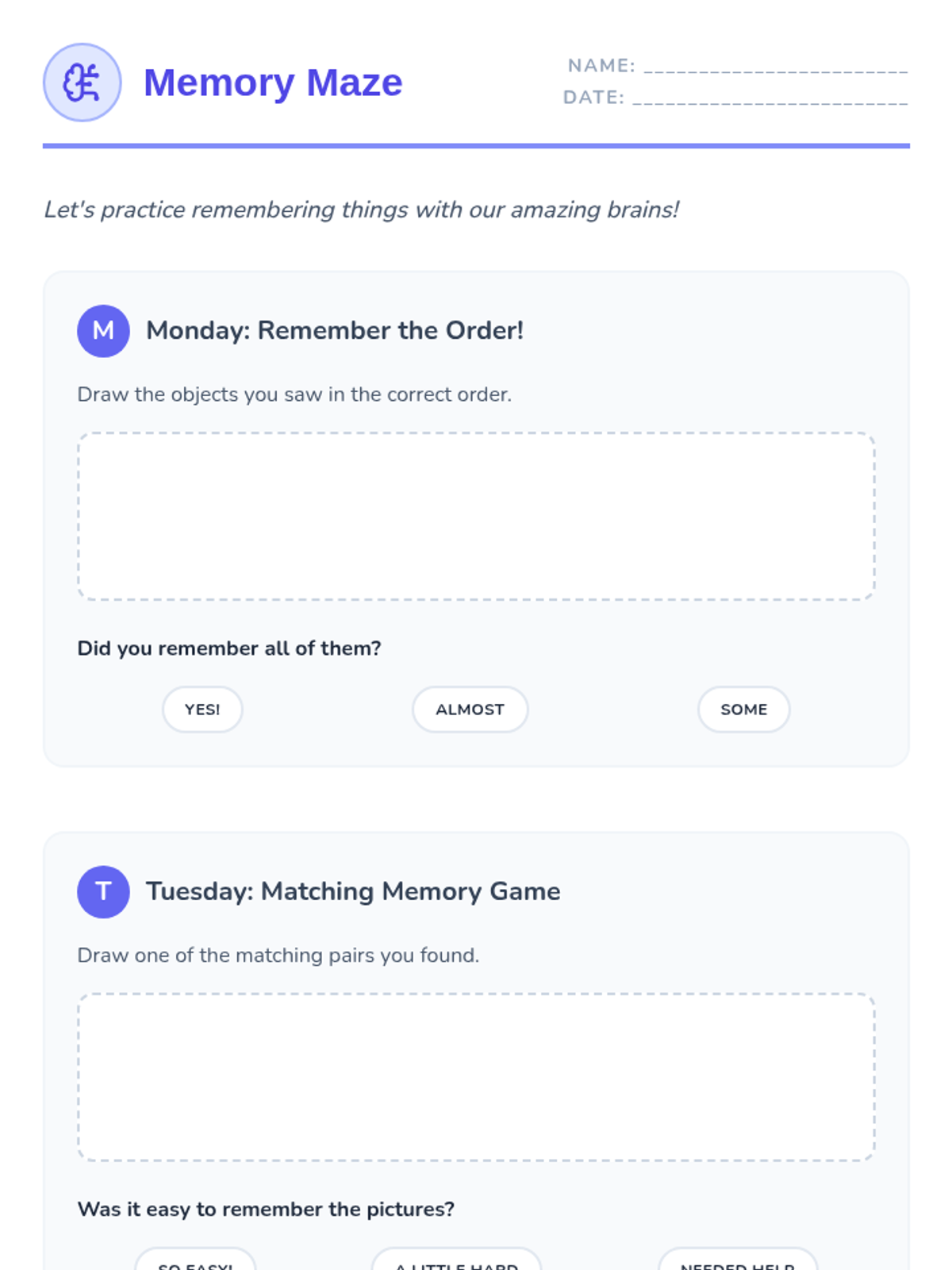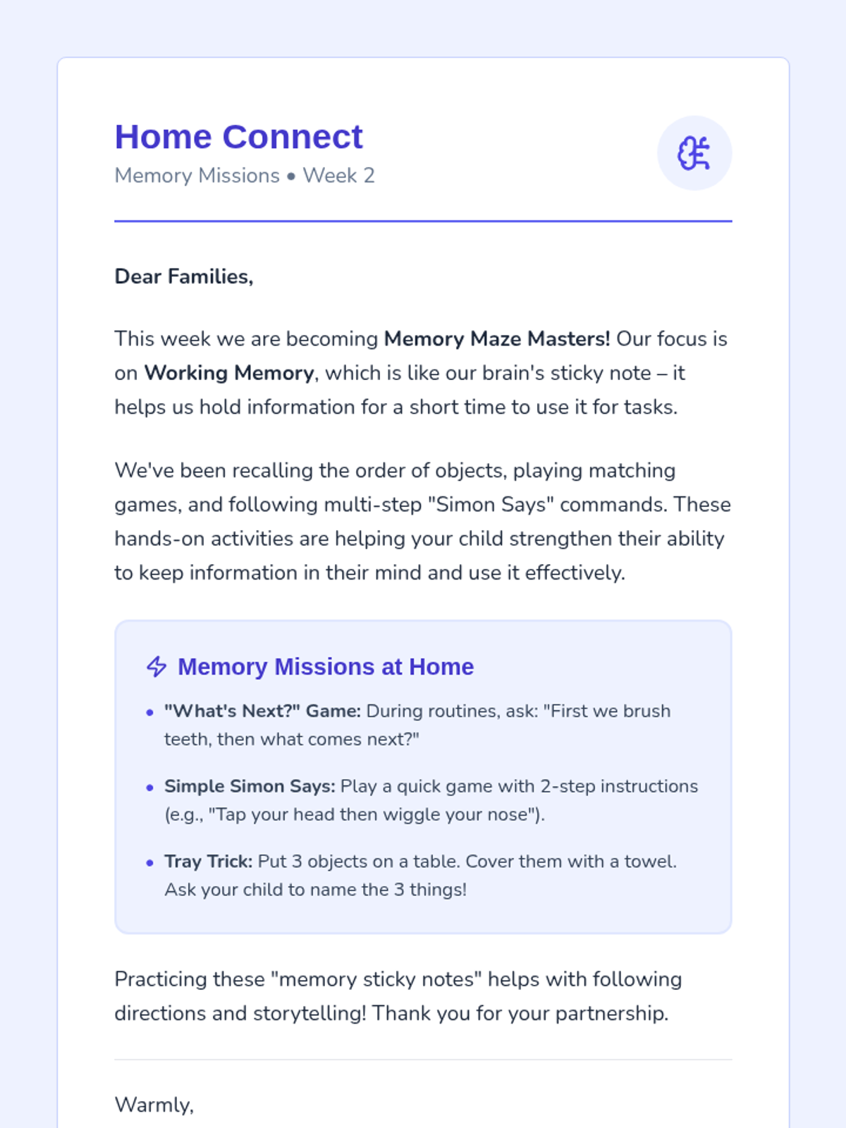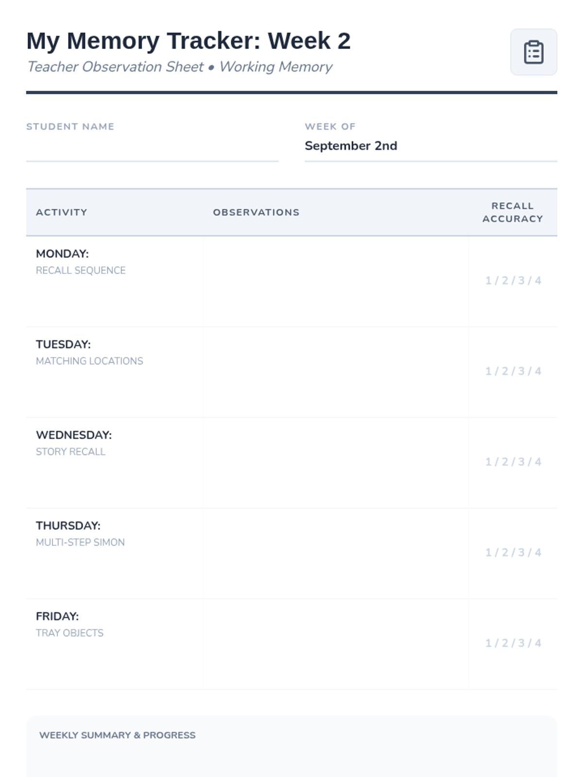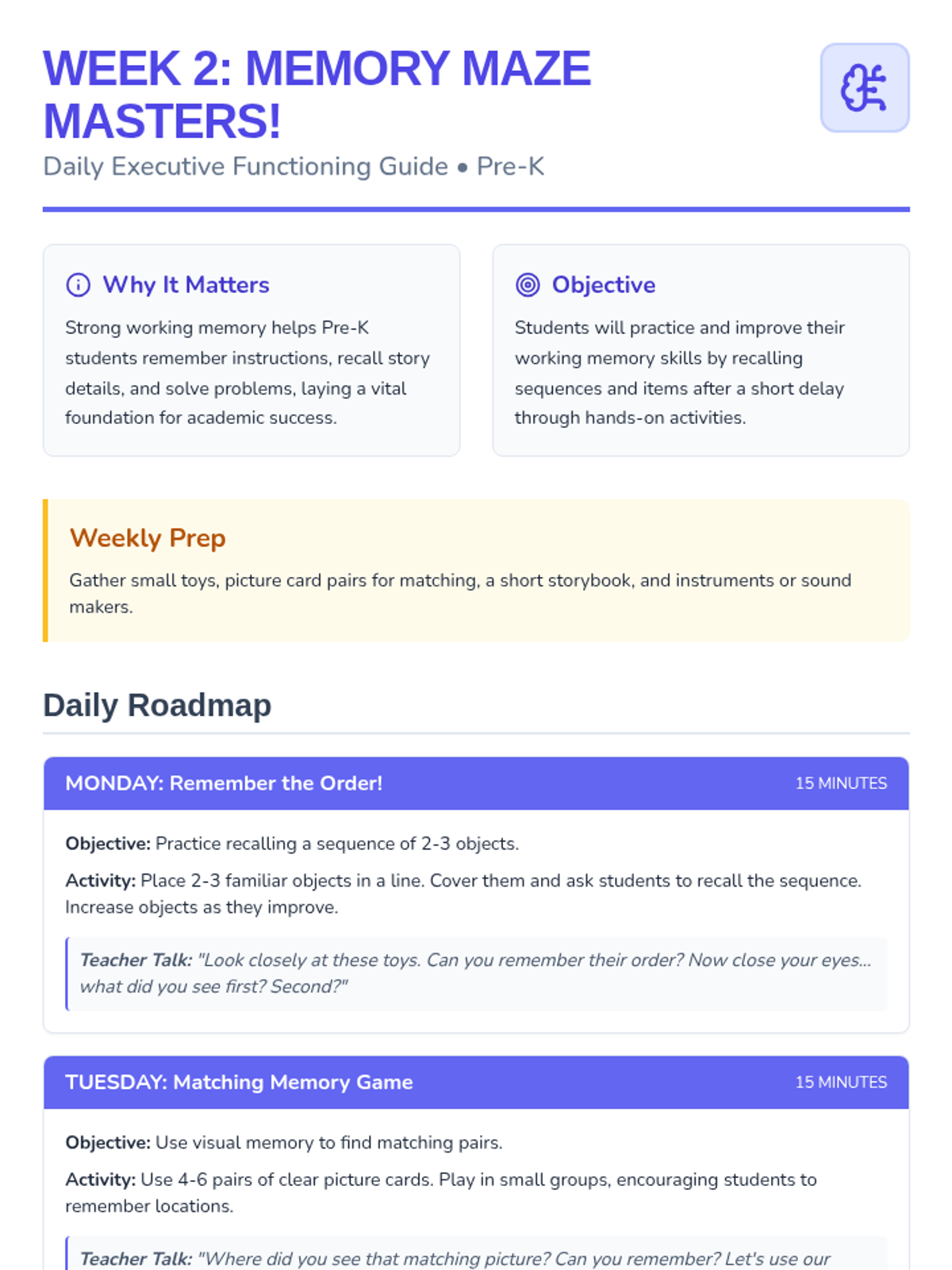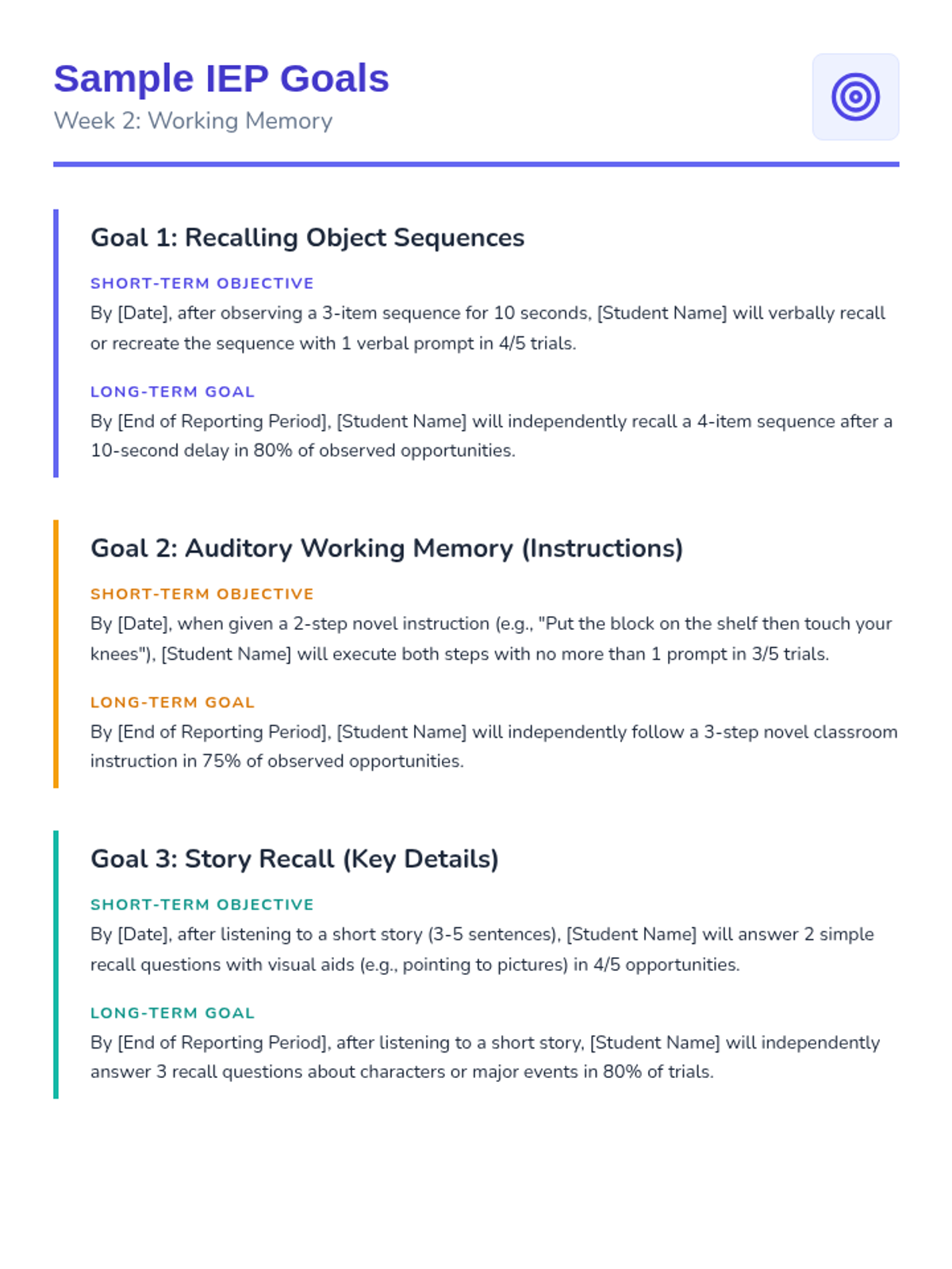 Week 2 focuses on strengthening working memory through recall games, sequences, and auditory commands.