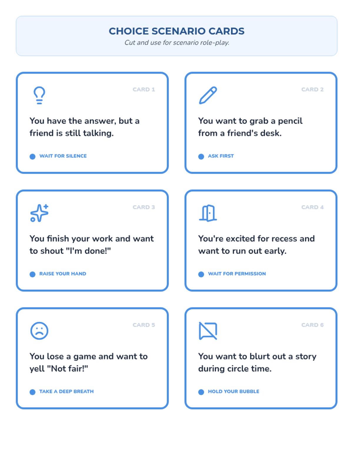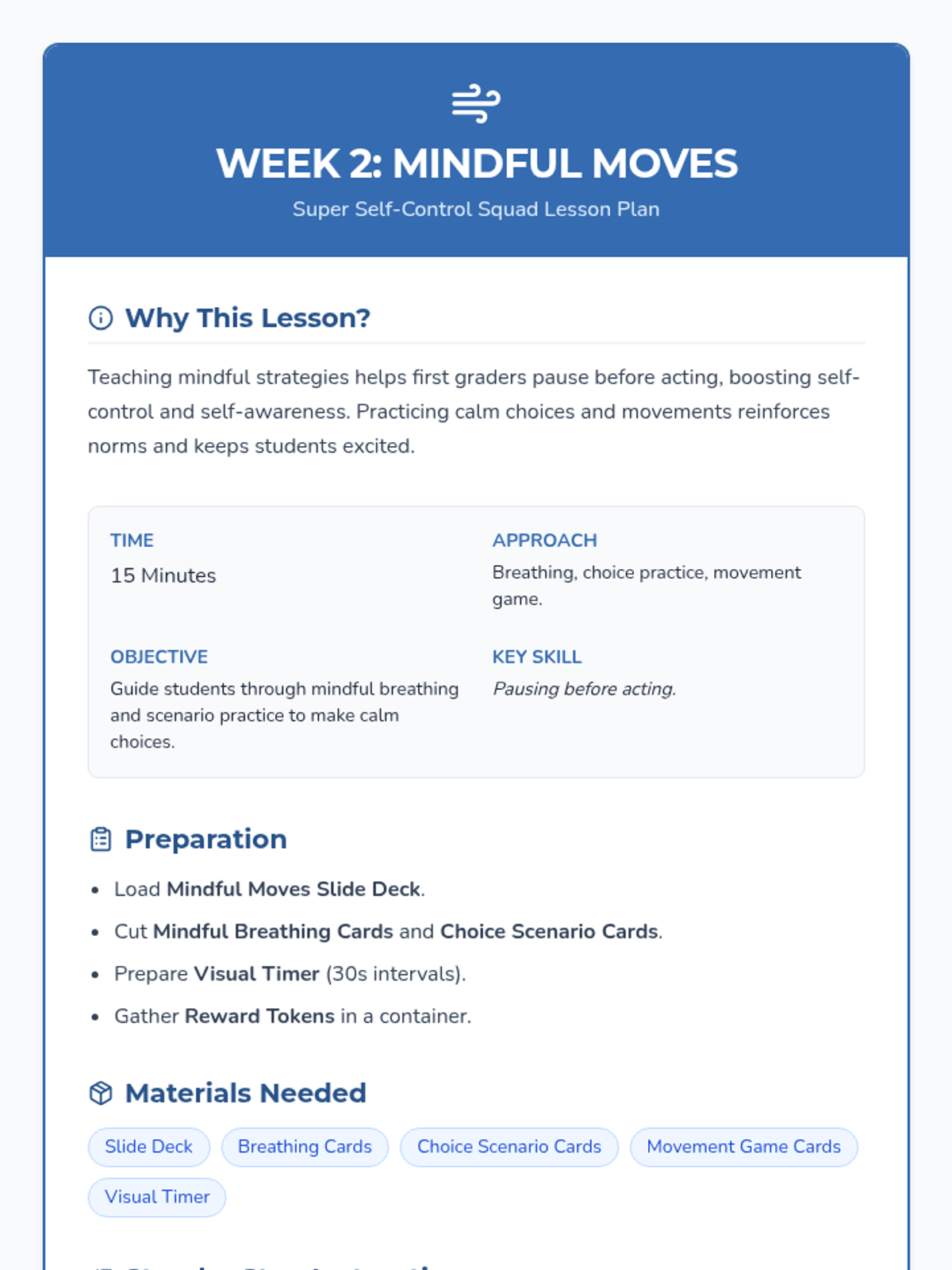 Teaches students mindful breathing techniques and movement strategies to pause before acting. Includes scenario practice to help students identify calm choices in the moment.