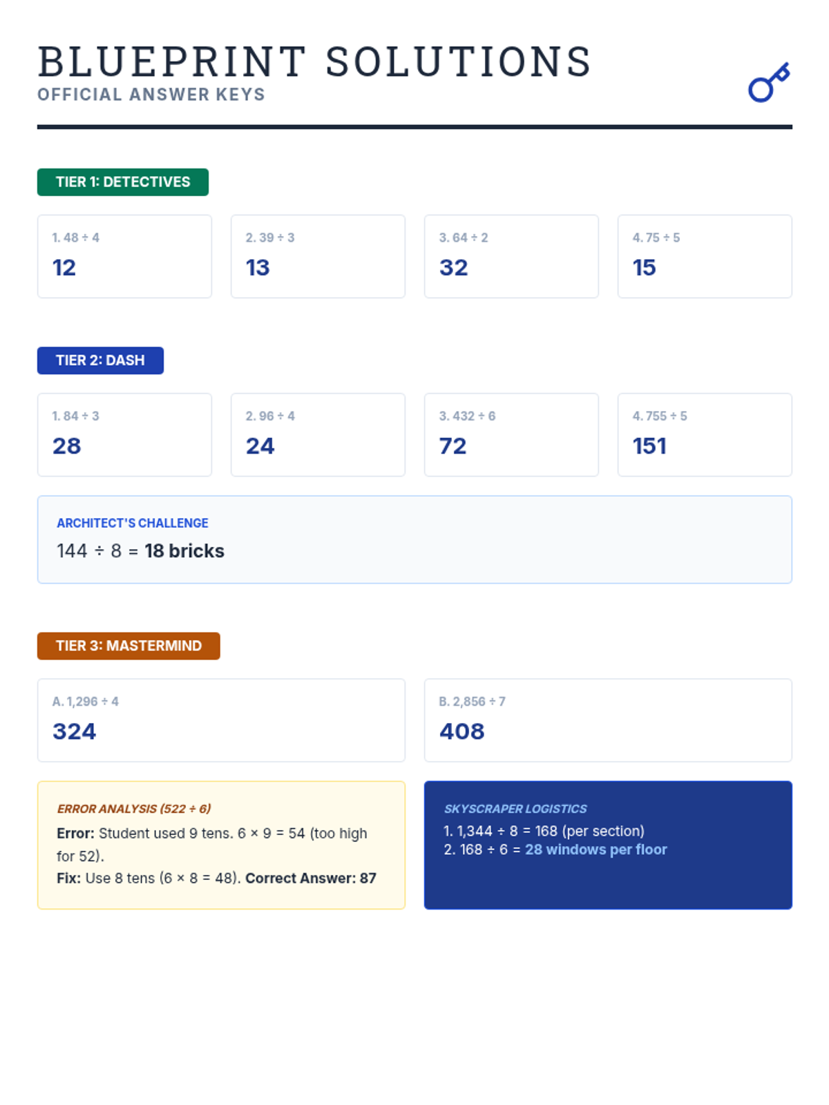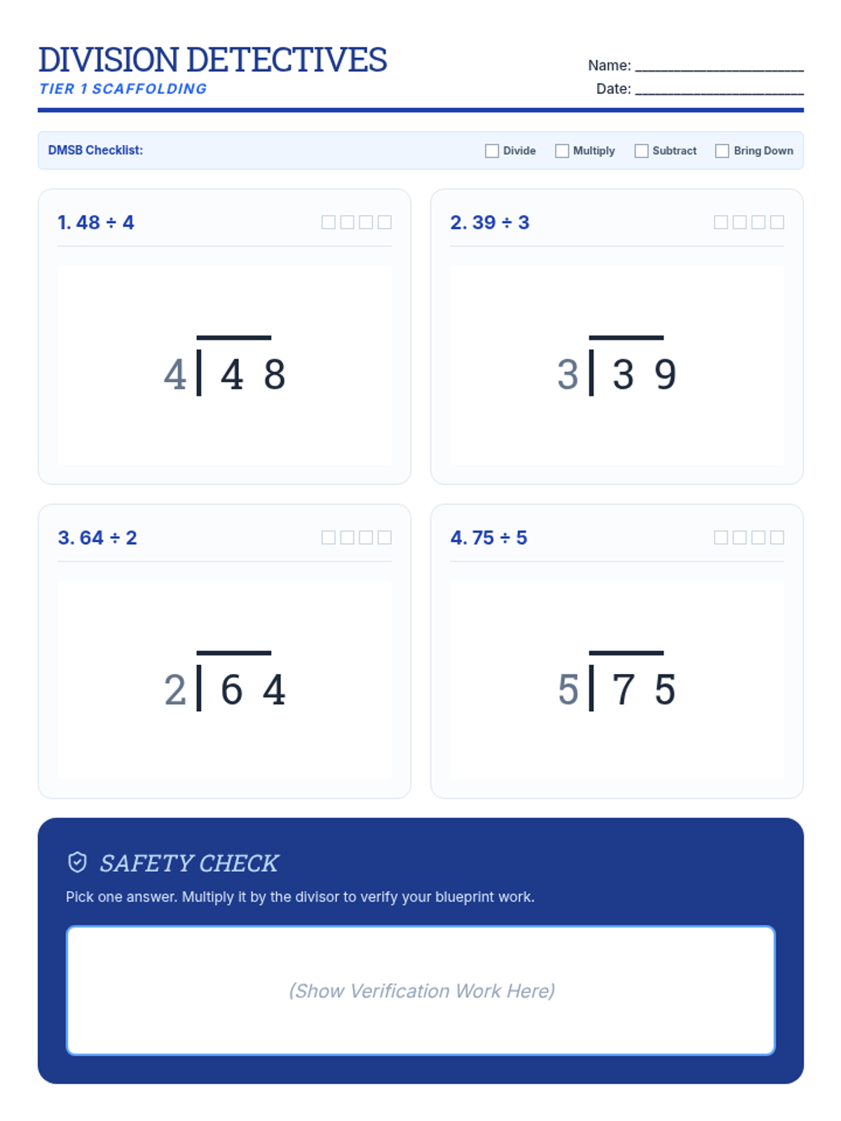 A comprehensive lesson on long division with no remainders, using the 'Divide, Multiply, Subtract, Bring Down' (DMSB) method. Includes scaffolded instruction, visual aids, and tiered practice materials to support all learners.