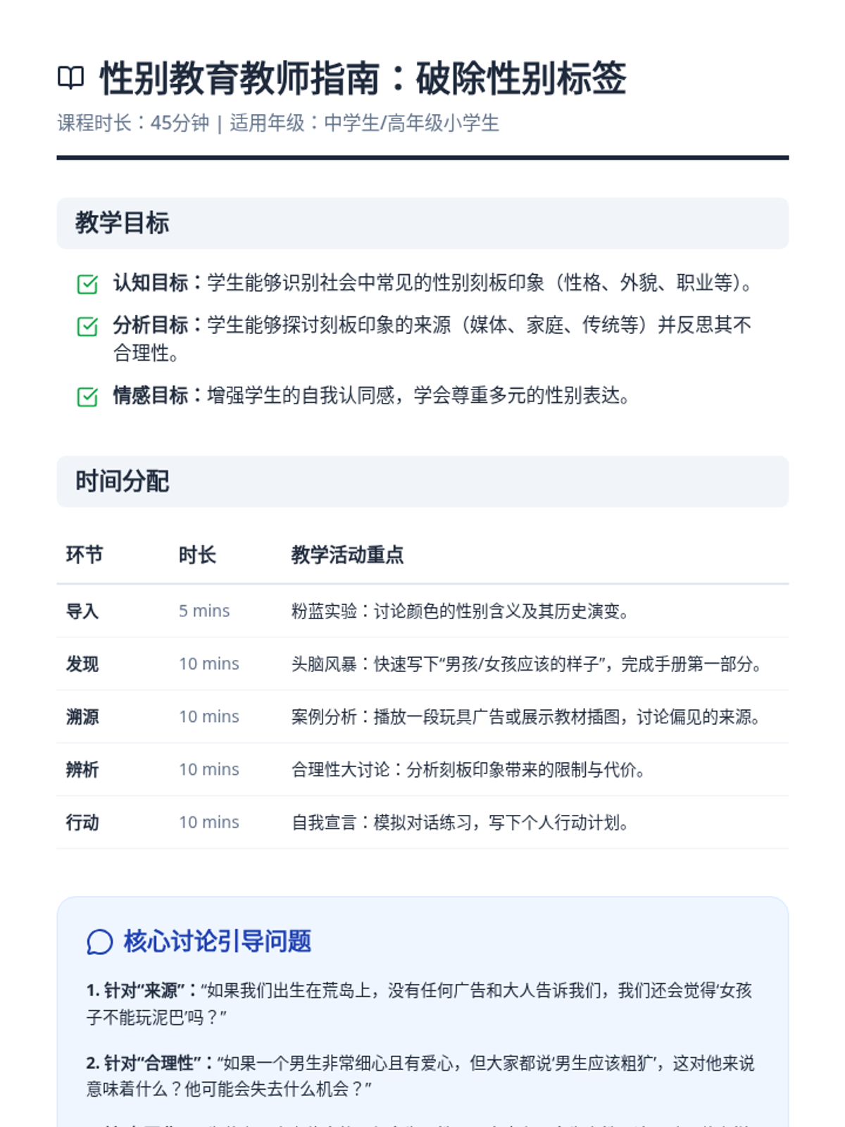 本课程是性别教育系列的第一课,通过“快速联想”破冰、追根溯源、生物学事实分析及“生理性别vs社会性别”概念辨析,引导学生科学认识性别差异,识别并解构社会赋予的性别枷锁。课程强调“差异不是优劣”,旨在培养学生的批判性思维和包容心态。