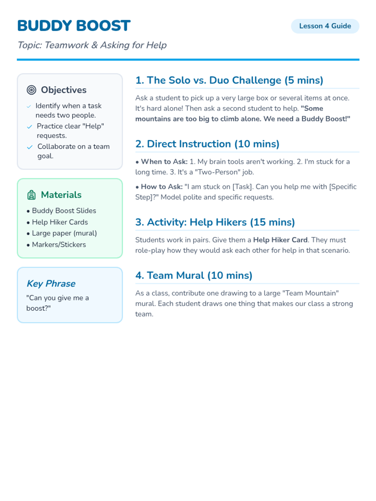 Lesson 4 of the Mountain Movers Quest focusing on the importance of collaboration and knowing how to ask for help during challenges.