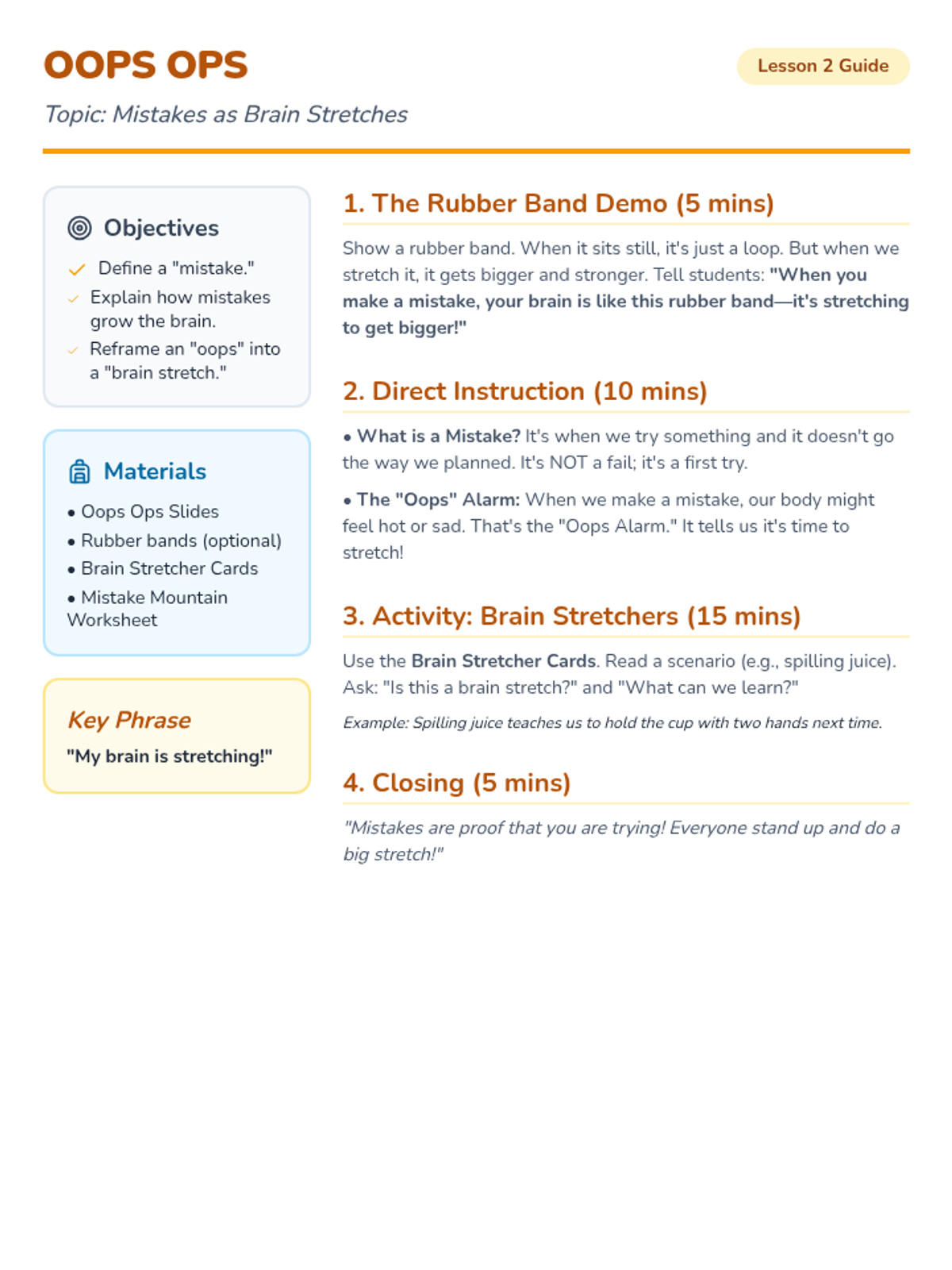 Lesson 2 of the Mountain Movers Quest focusing on reframing mistakes as opportunities for growth and 'brain stretches'.