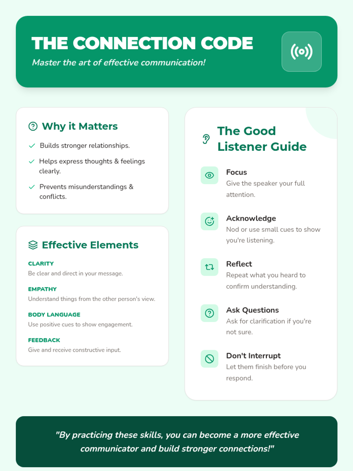 Developing active listening and clear expression techniques through role-playing and reflection.