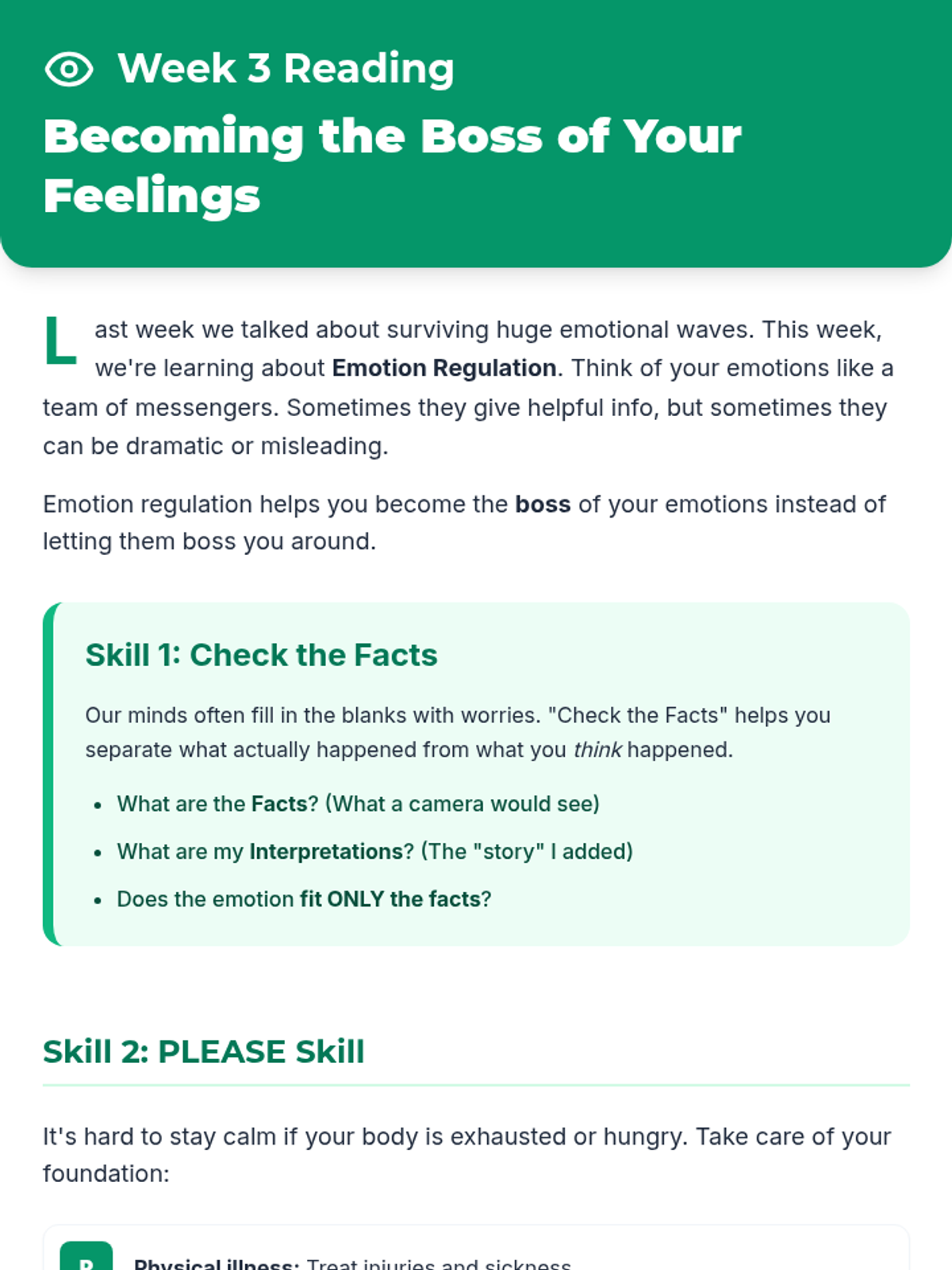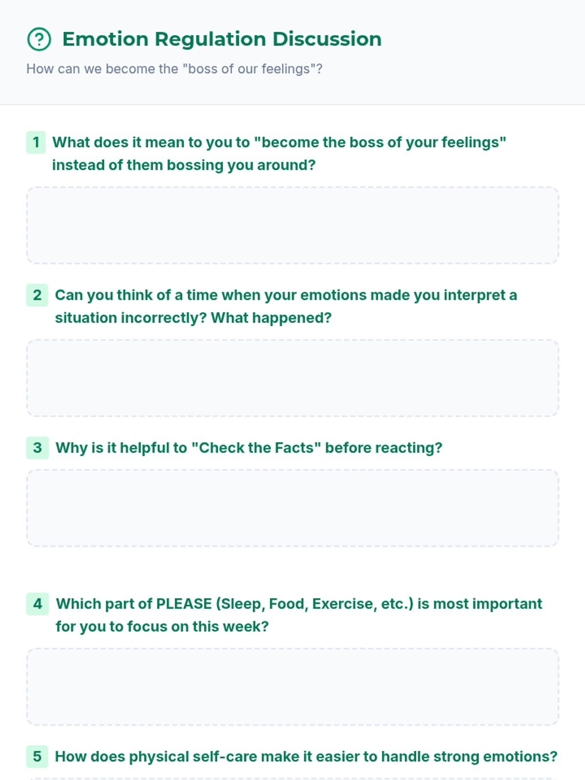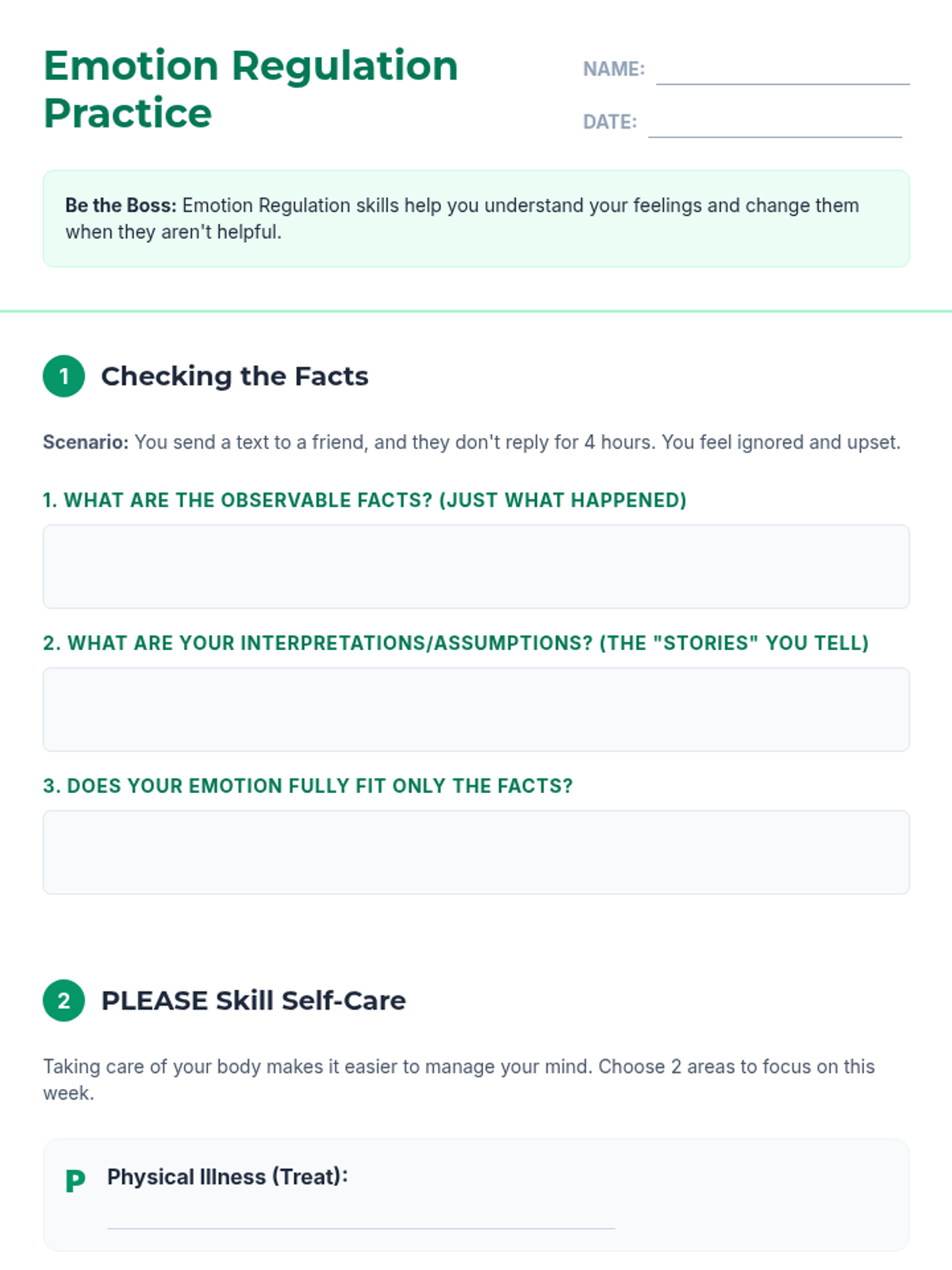 Understanding emotions, checking facts, and maintaining physical health through the PLEASE skill.