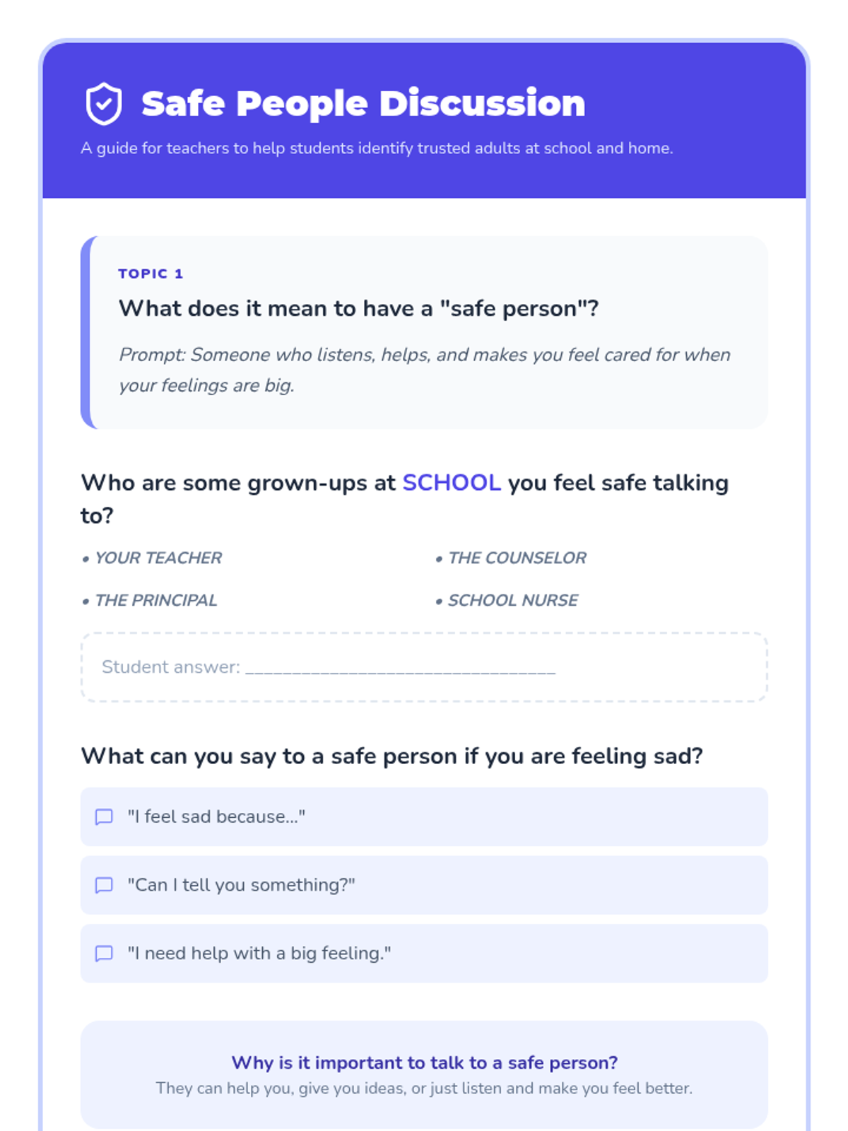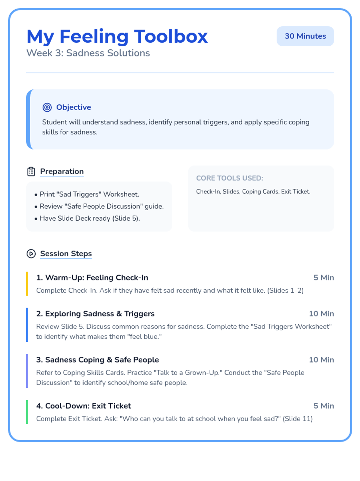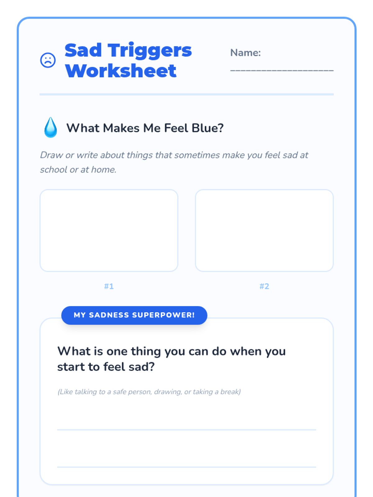 Exploring sadness, identifying personal triggers, and learning to seek comfort from trusted adults.