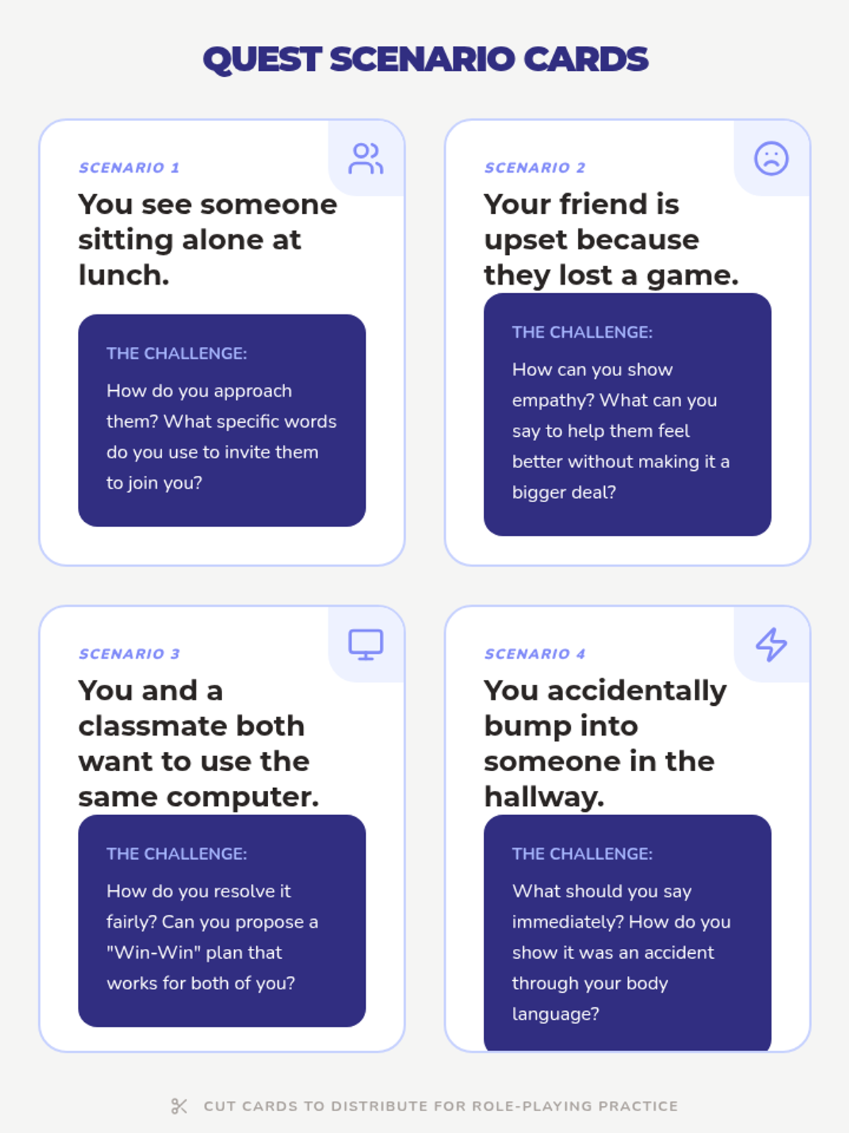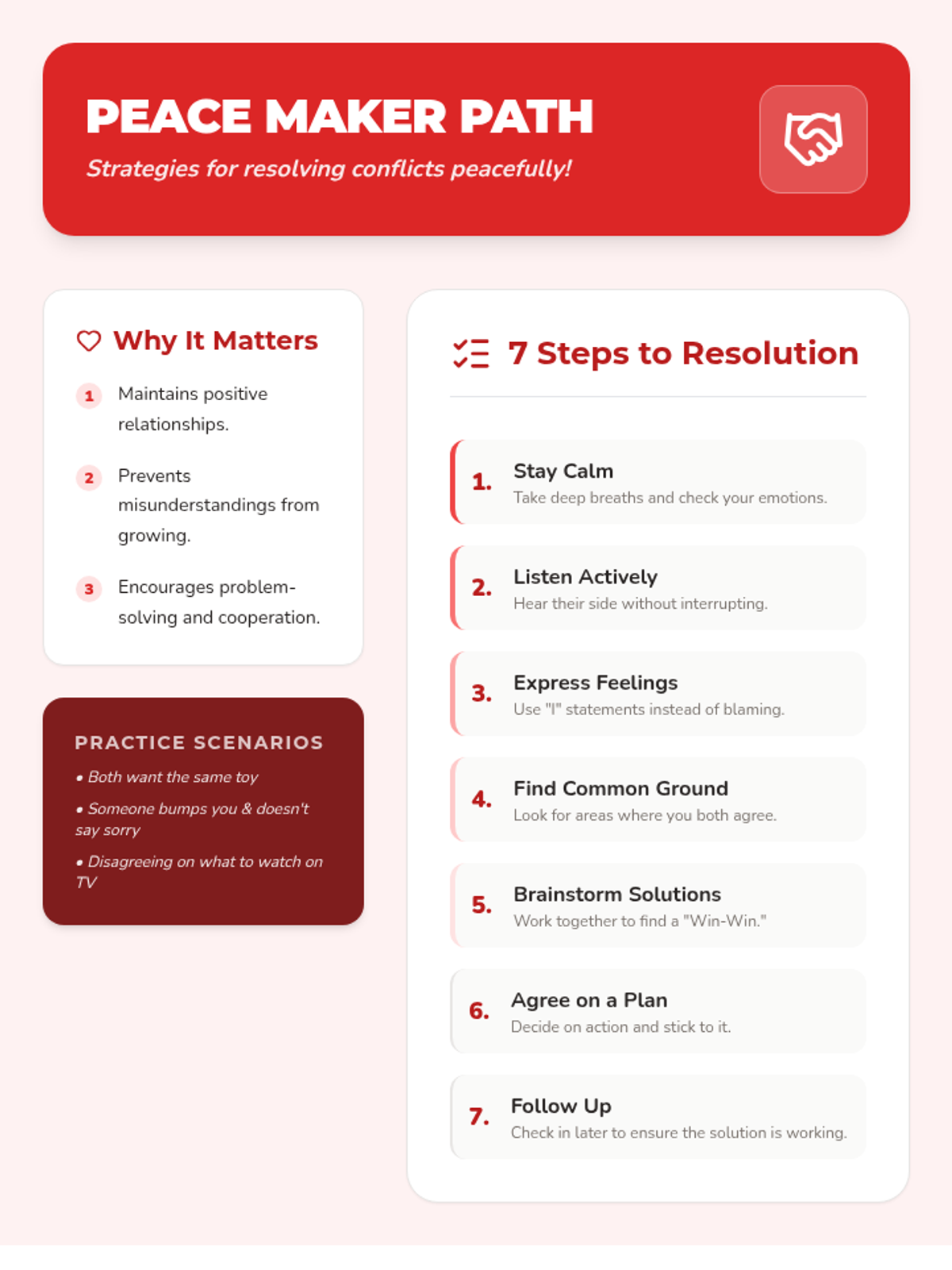 Learning and practicing peaceful conflict resolution strategies through guided role-playing.