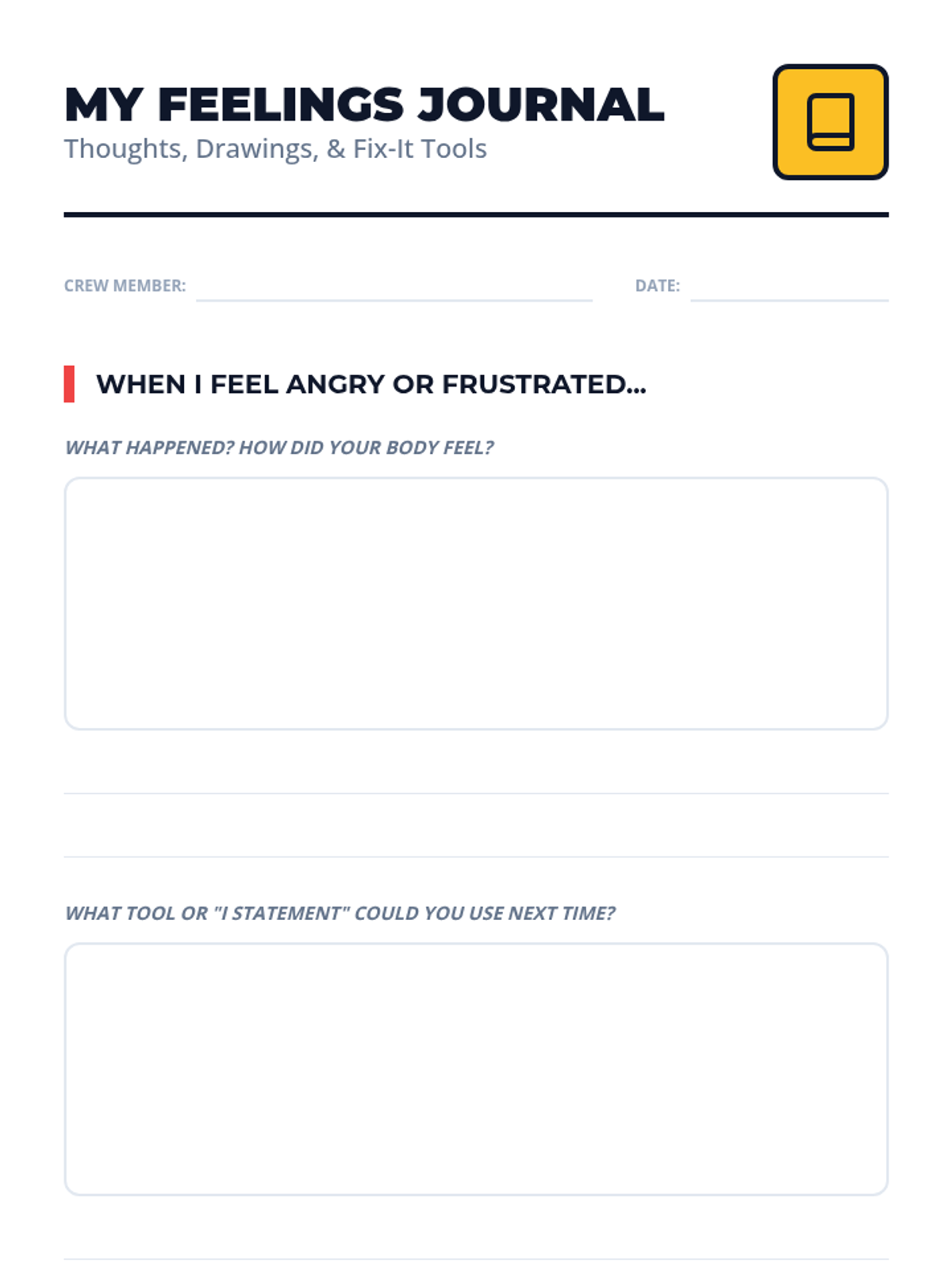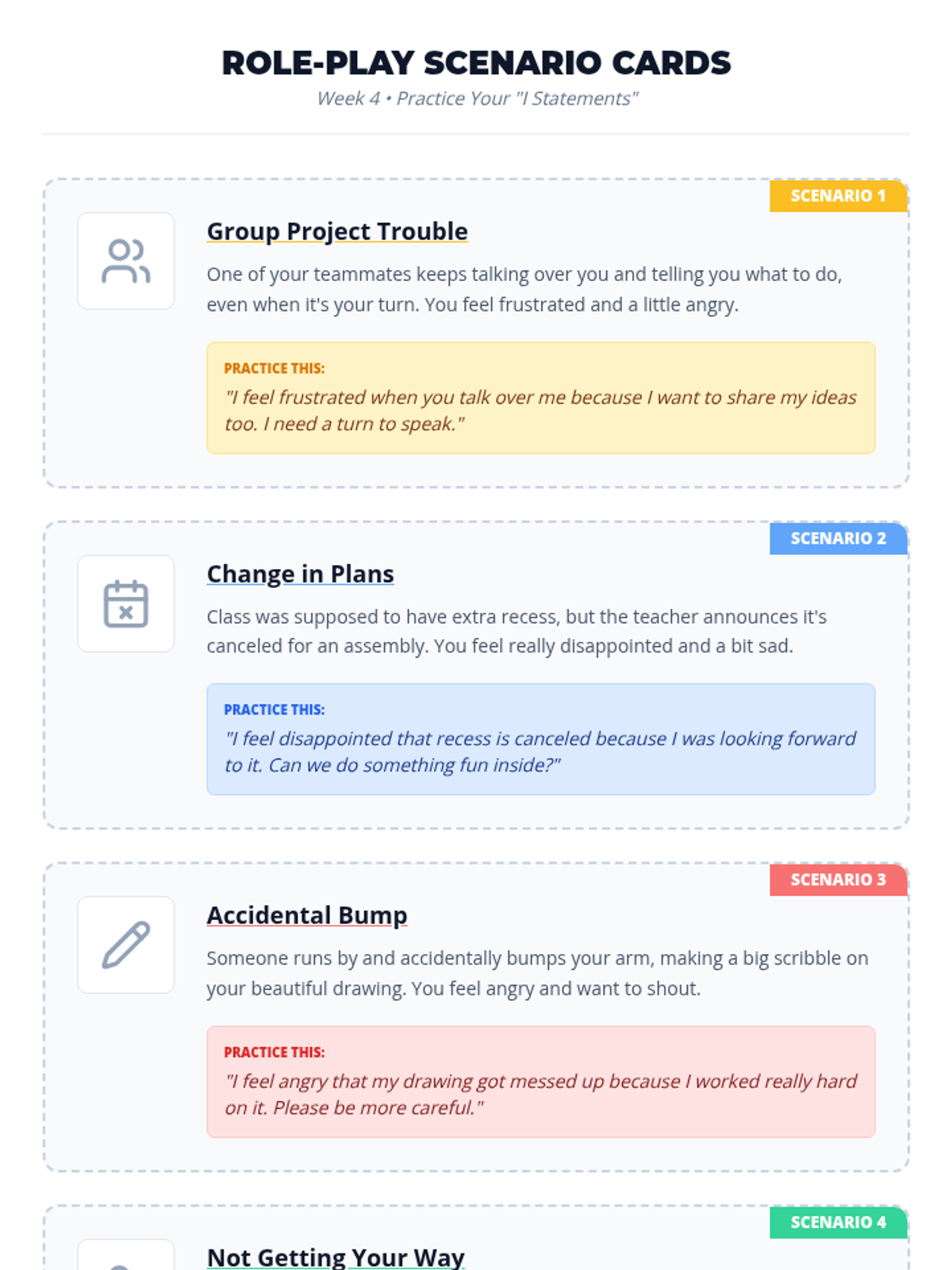 Learning assertive communication through 'I statements' and using a feelings journal for reflection.