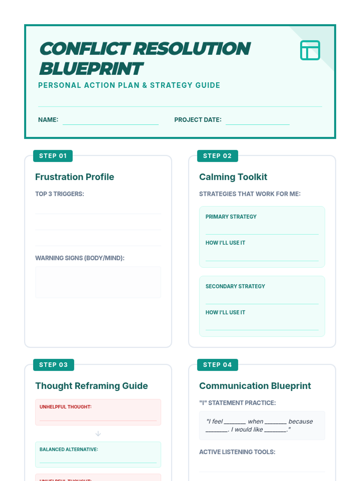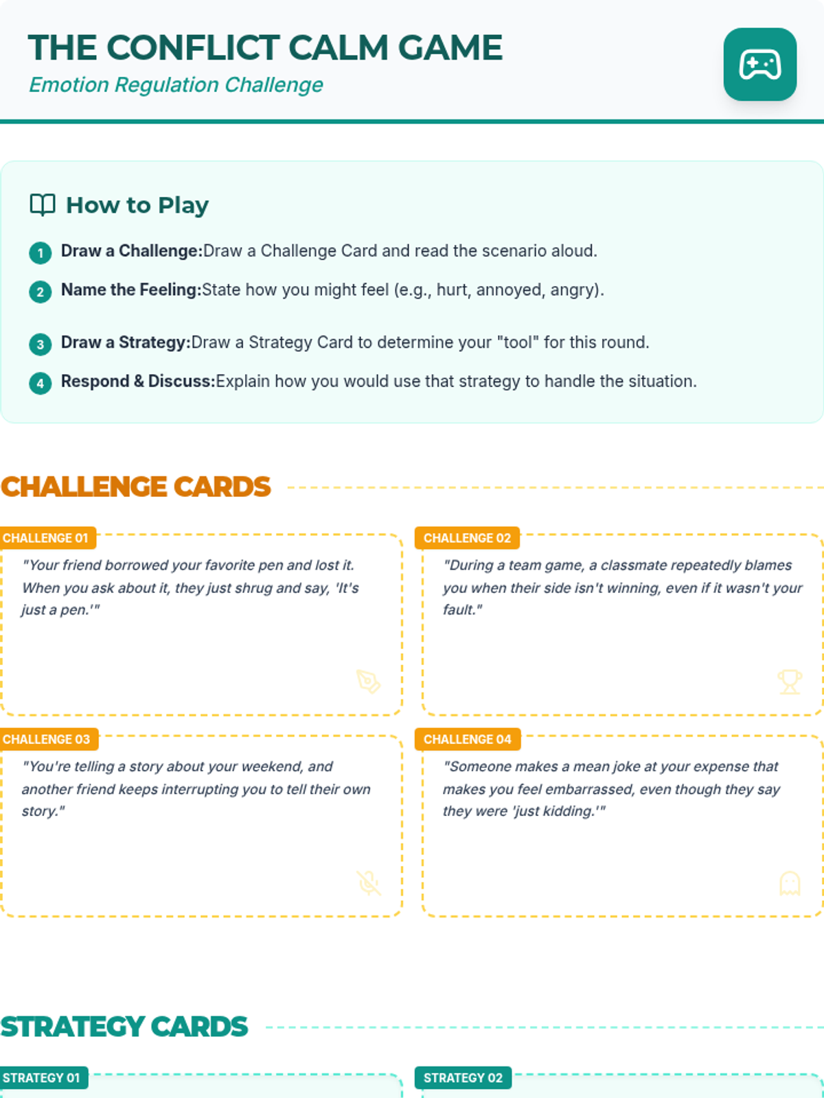 Synthesizing all skills into a personal conflict resolution plan and reinforcing learning through an interactive regulation game.