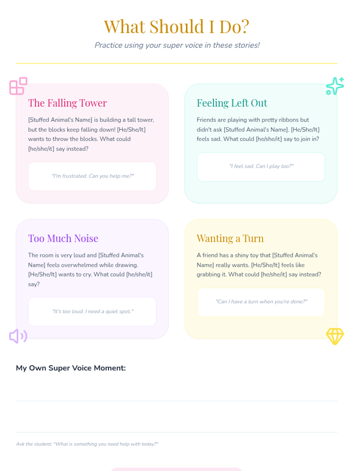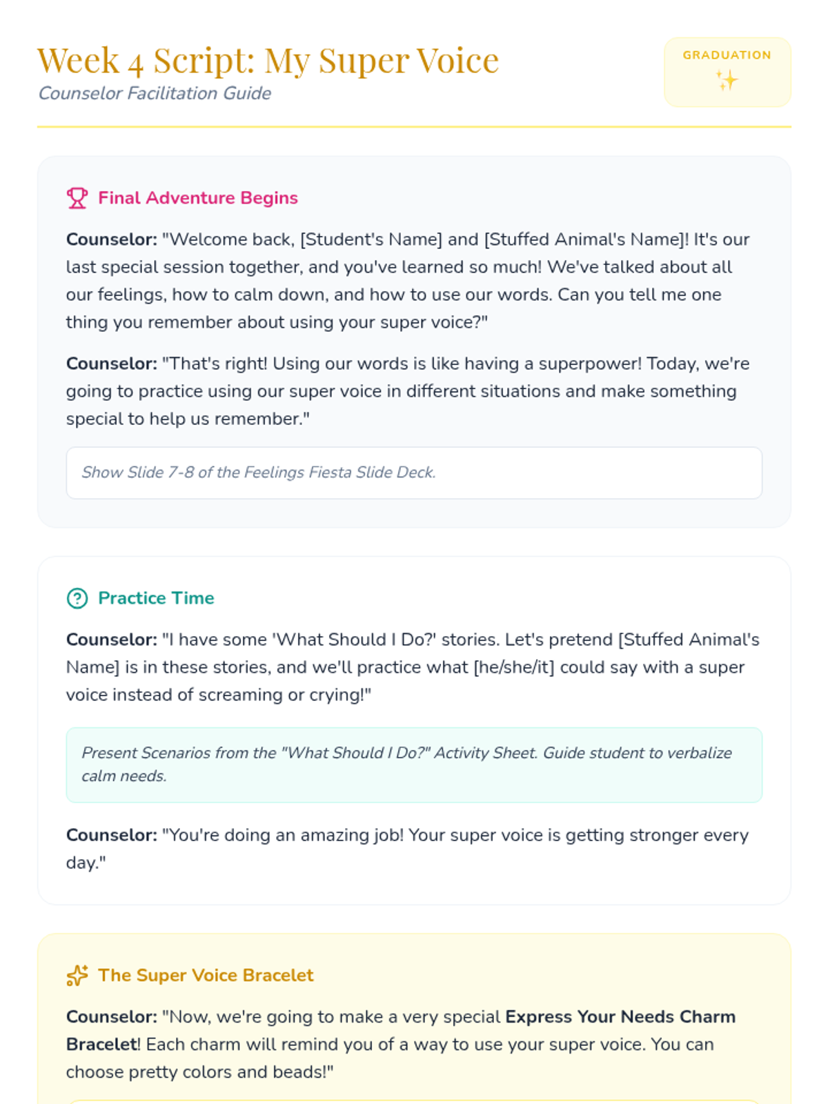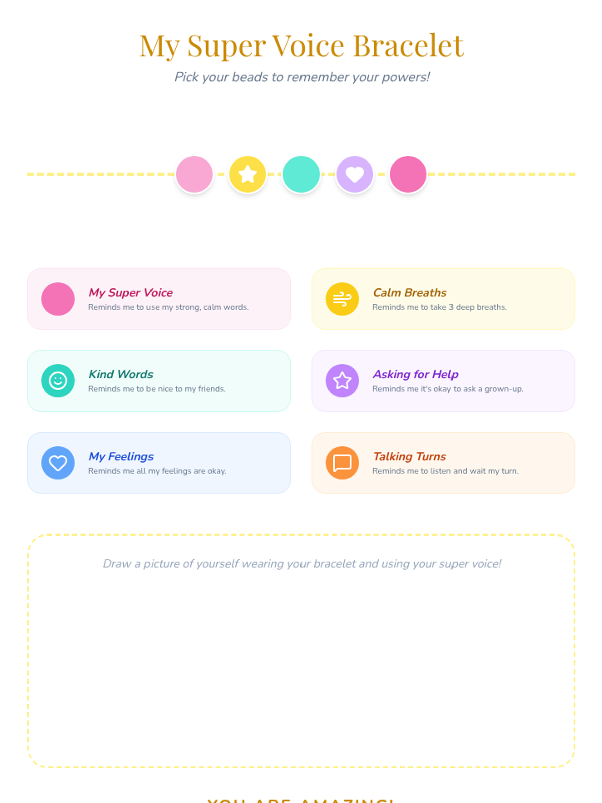 Consolidating skills to use a "super voice" for clear communication and creating a reminder bracelet.