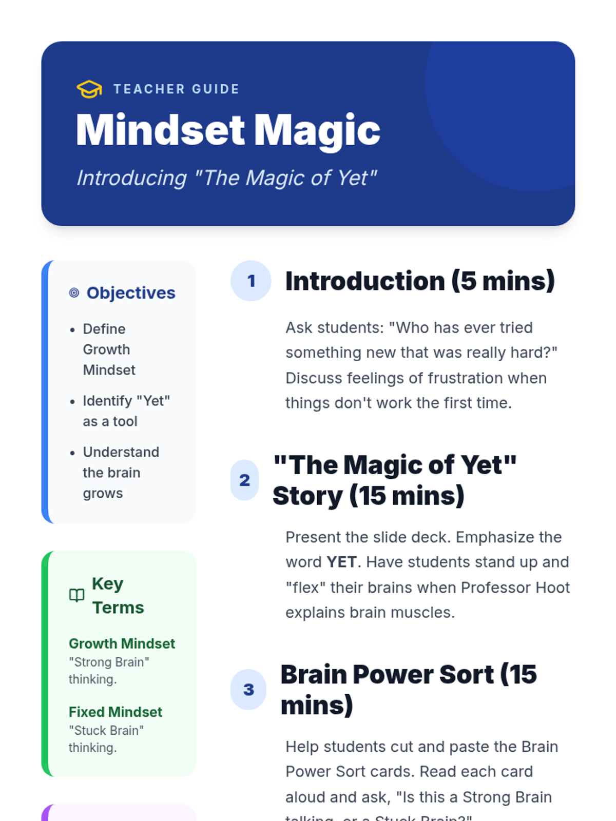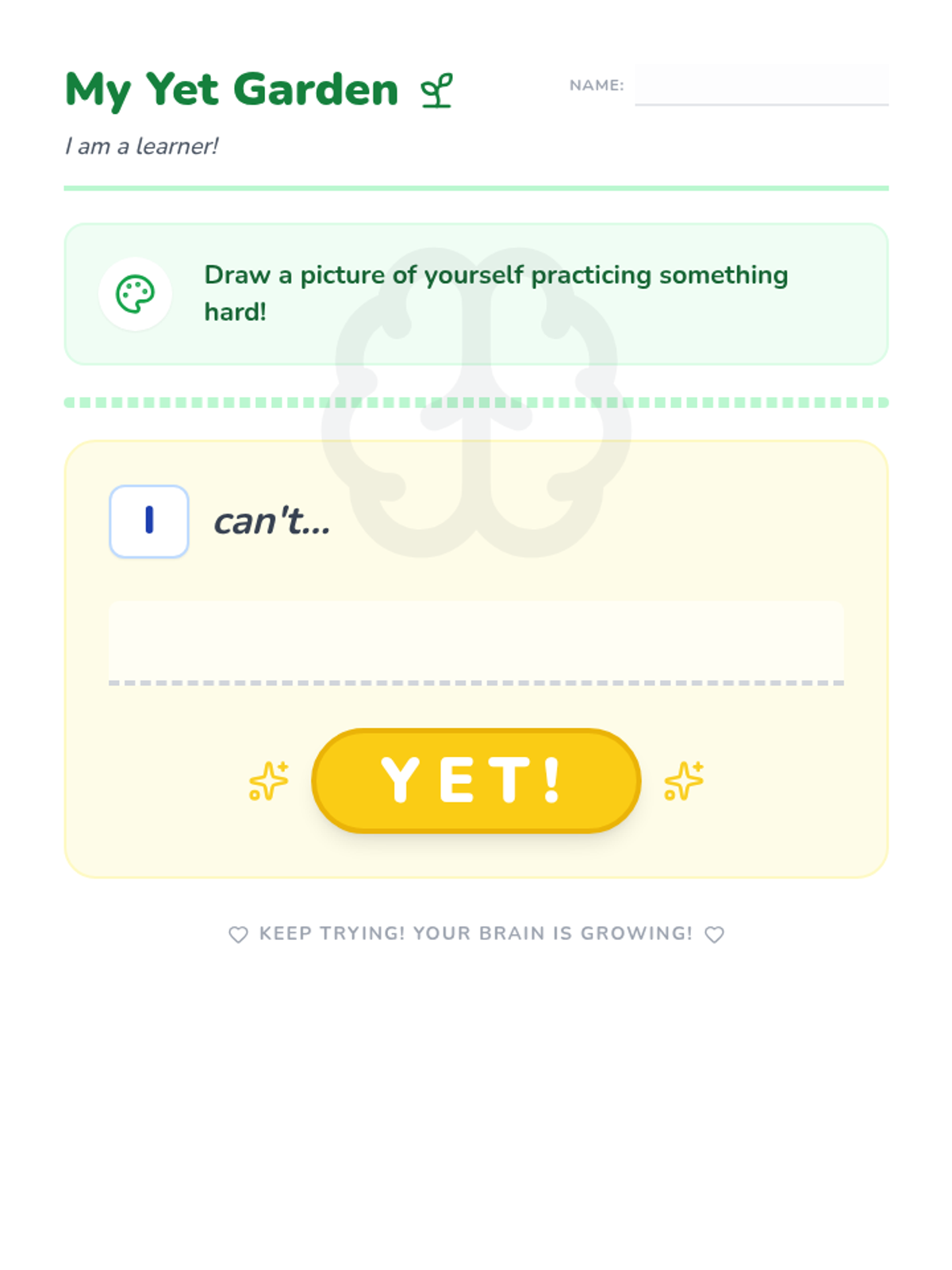 A lesson focused on introducing the concept of a growth mindset using a storybook format. Students will meet Pip, a character who learns that 'I can't' becomes 'I can't yet' with practice and persistence.