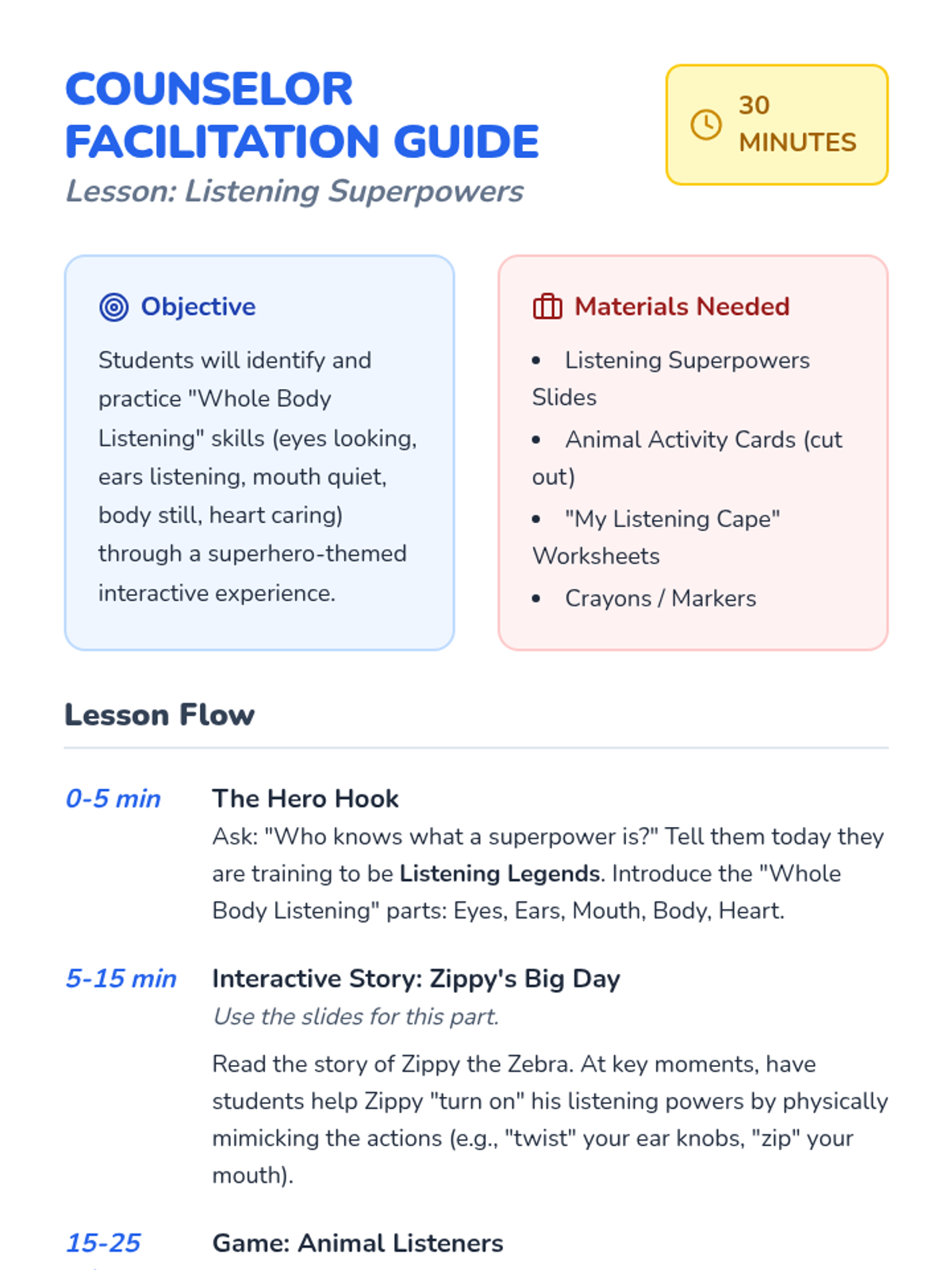 An interactive 30-minute lesson where kindergarteners discover their 'Listening Superpowers' using their whole bodies, featuring a participatory story and movement games.