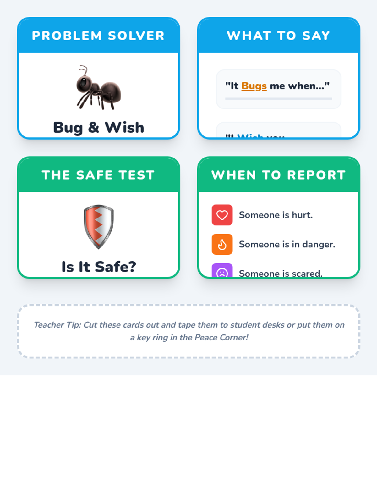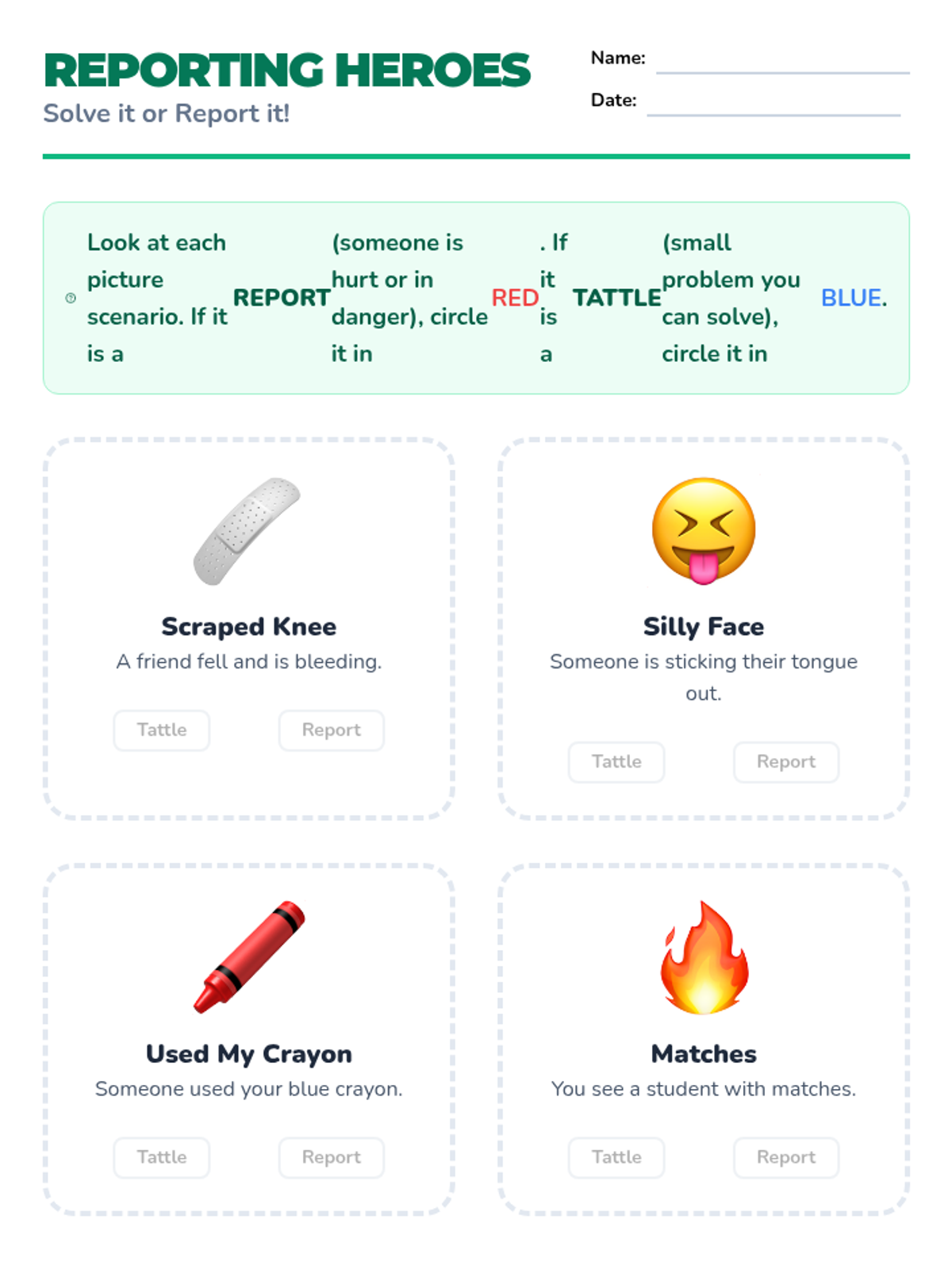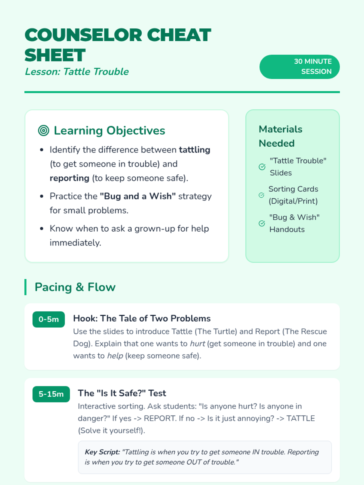 A kindergarten lesson focused on distinguishing between tattling and reporting, providing students with practical tools for independent conflict resolution.
