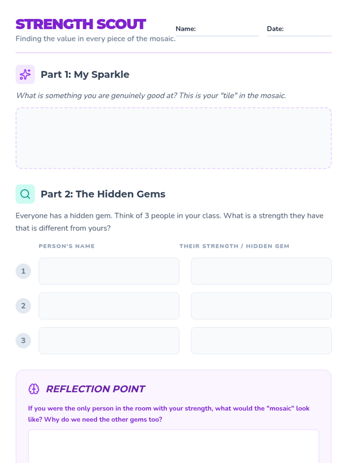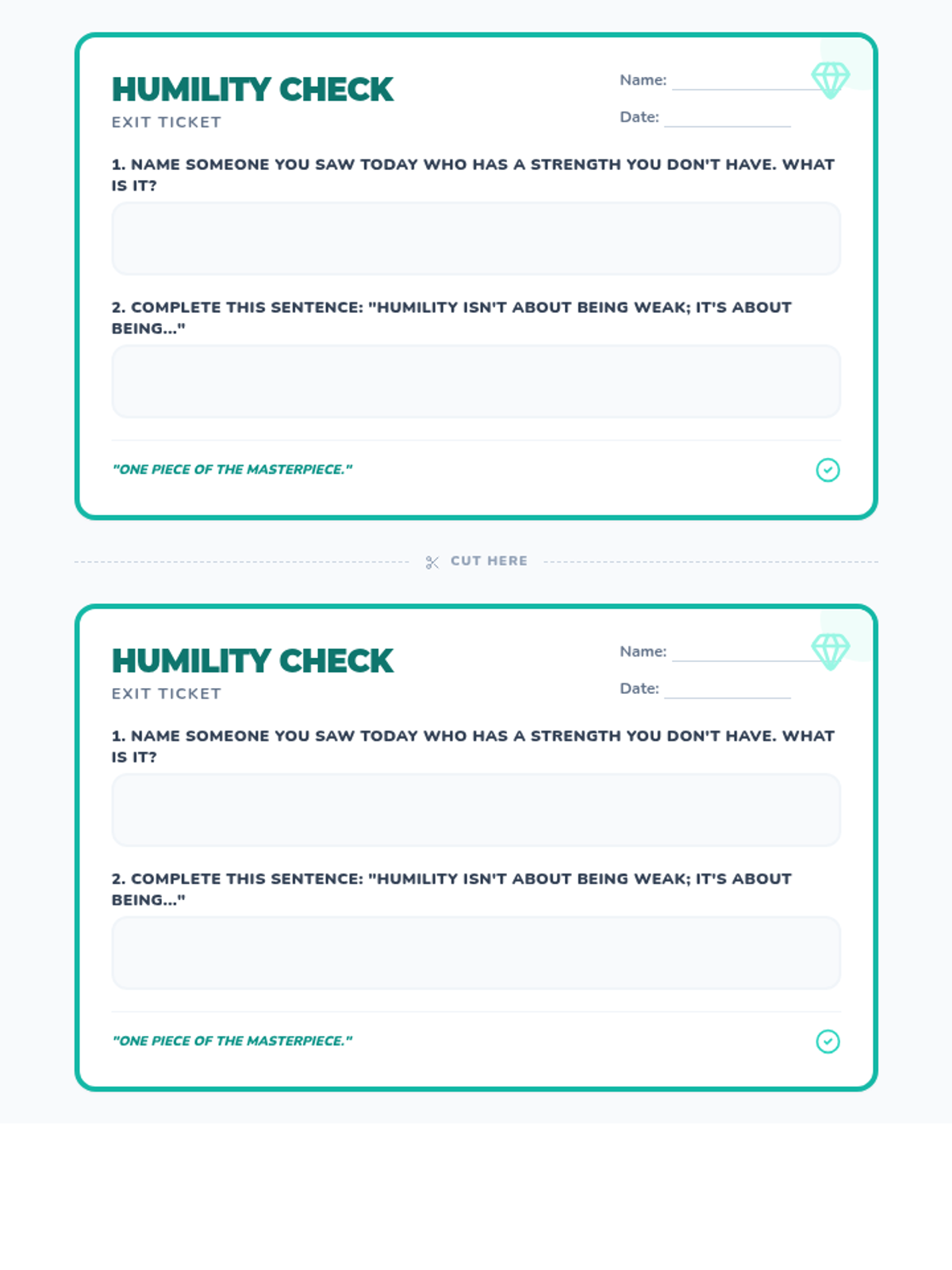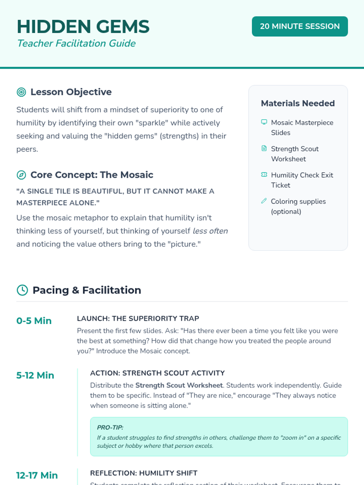 A 20-minute lesson focused on humility and valuing the unique strengths of others, using the metaphor of a mosaic to show that every individual is a vital piece of a larger whole.